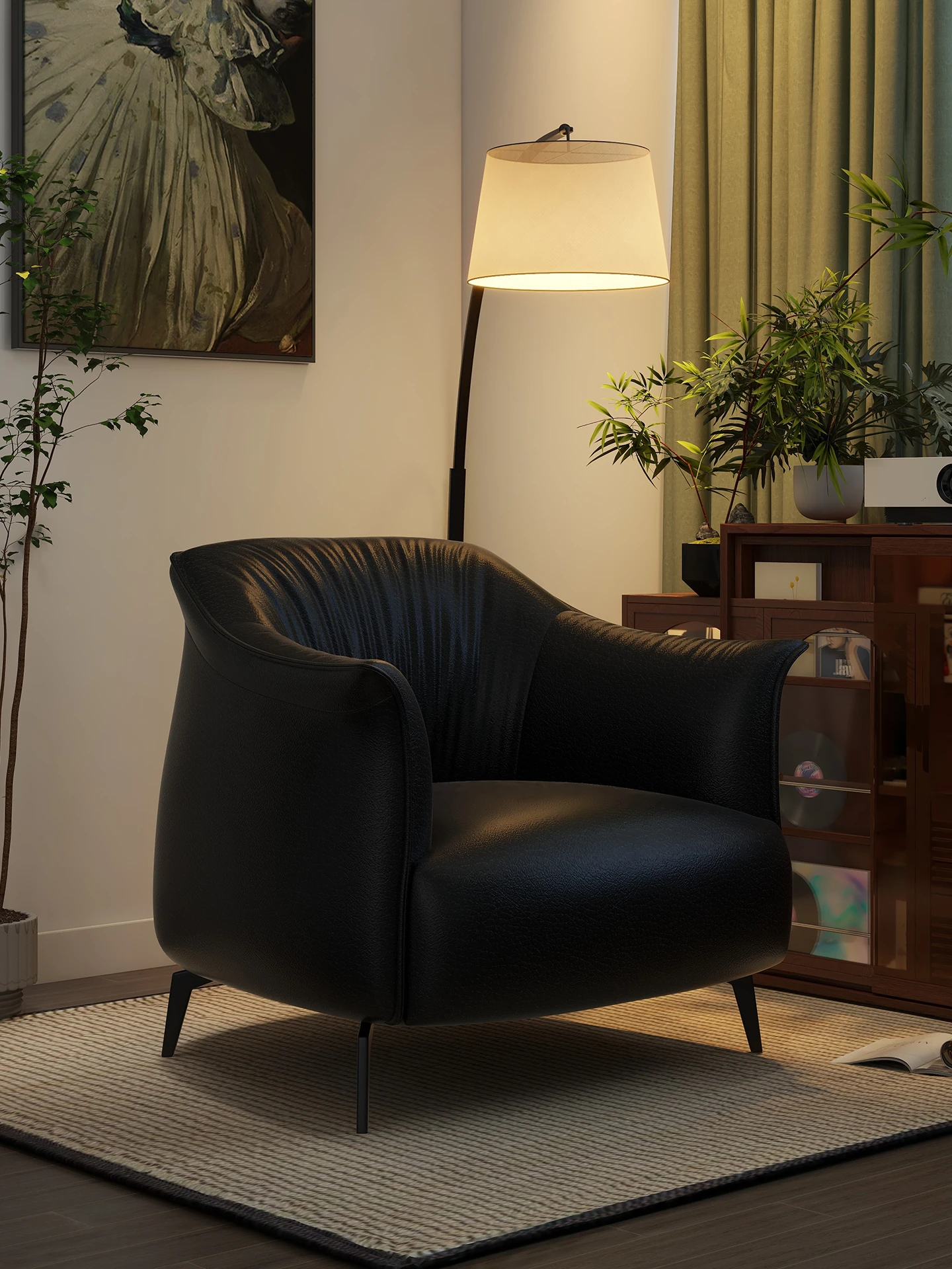 イタリアンミニマリストのリラックスチェア|小型リビングに最適な高級レザー製|おしゃれな休憩スペースや接客エリアにぴったりなデザイン!