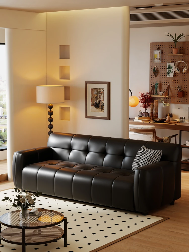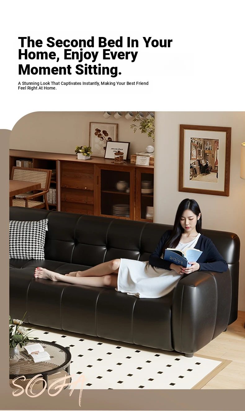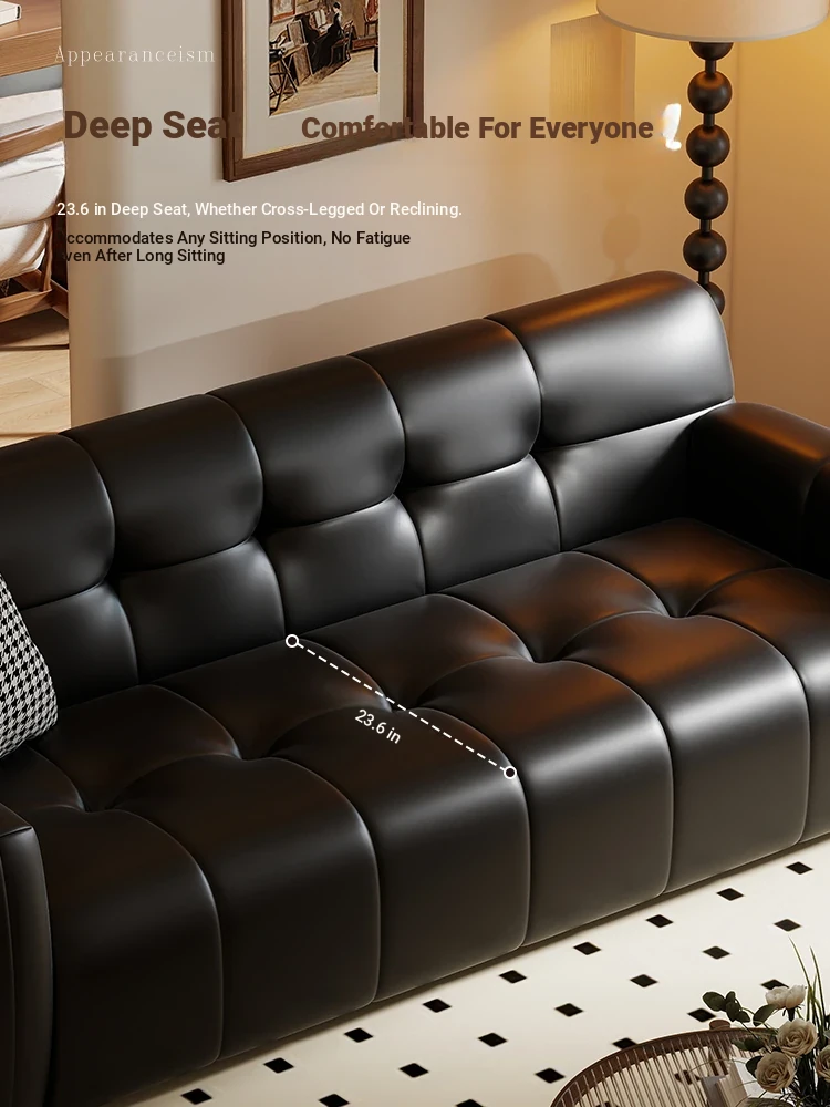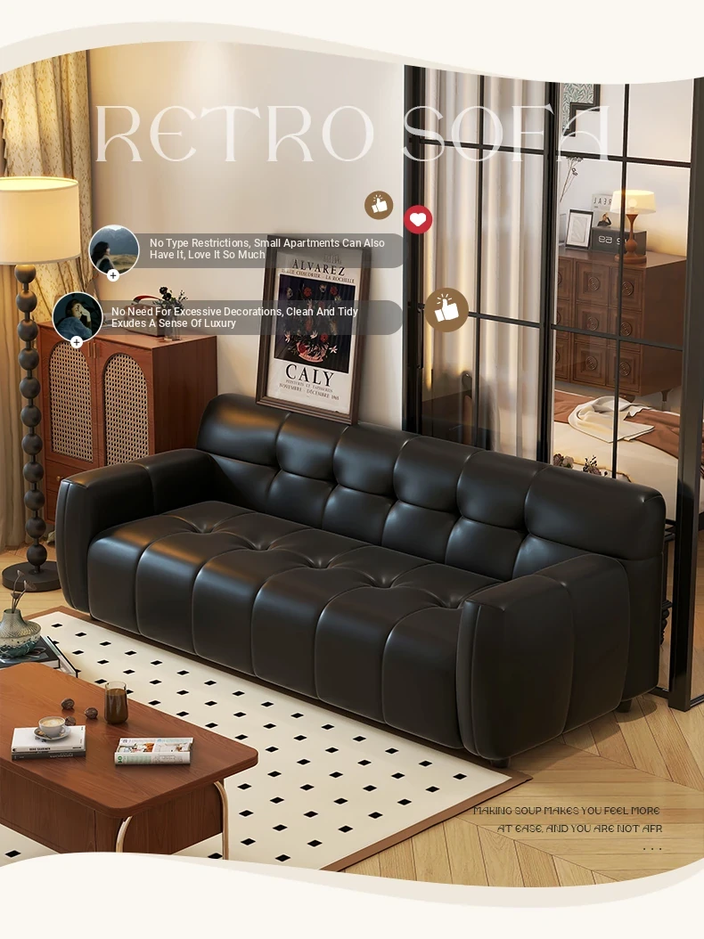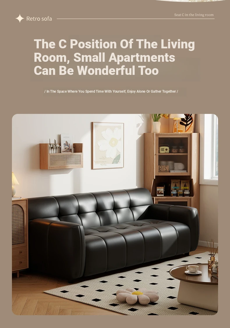 Retro Italian Leather Sofa for Small Spaces - Minimalist Design for Apartments, Double and Triple Seat Options in Stylish Black