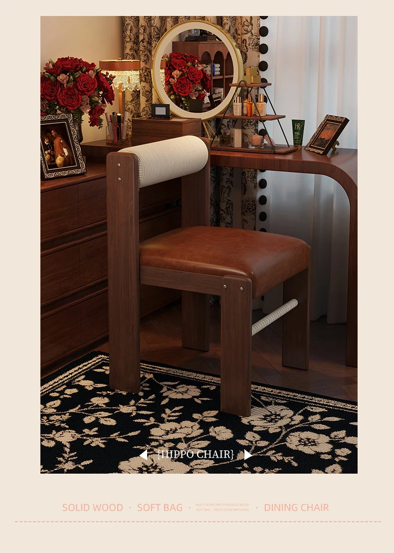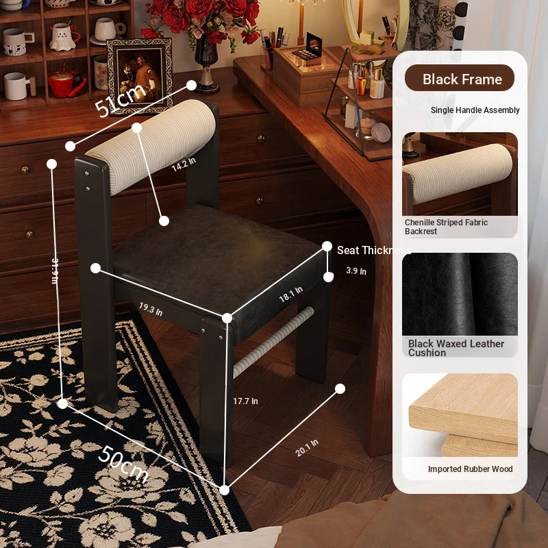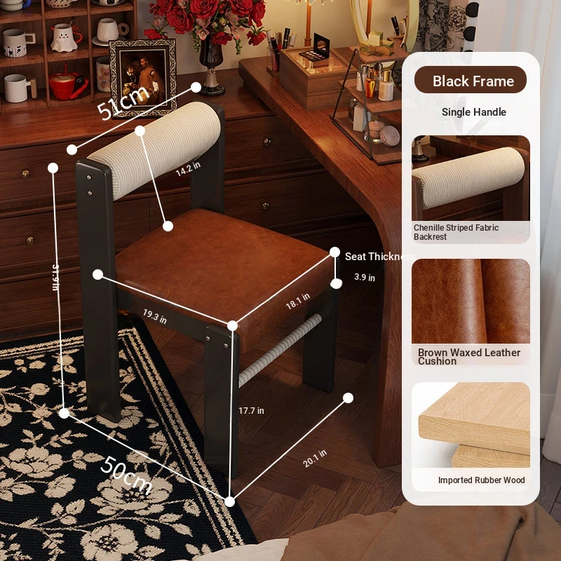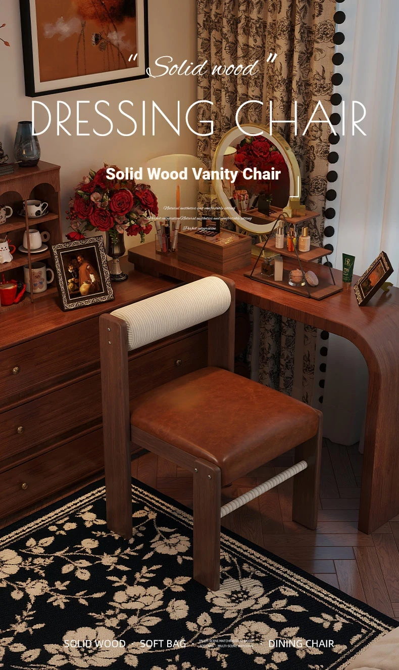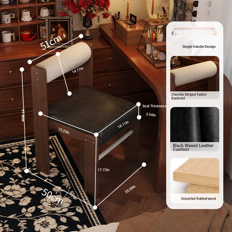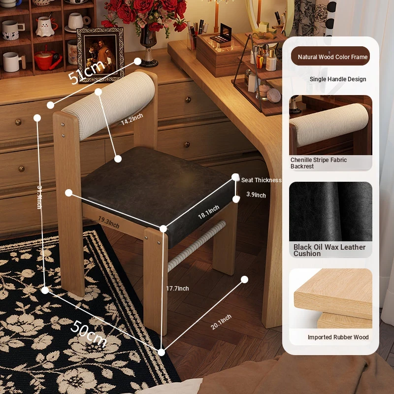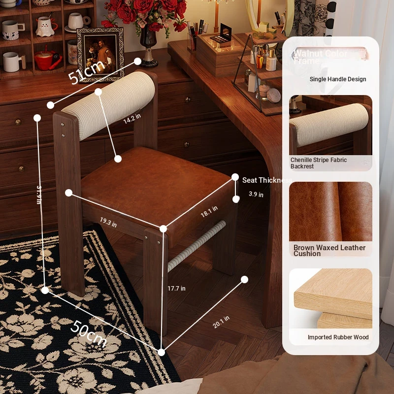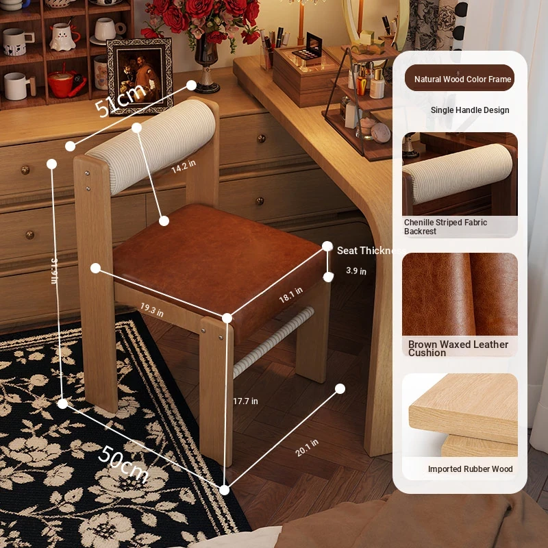 Wabi-Sabi Style Makeup Chair - Solid Wood Vanity Stool for Bedroom, French Vintage Dressing Table with Backrest, Soft Cushioned Dining Chair