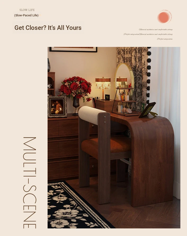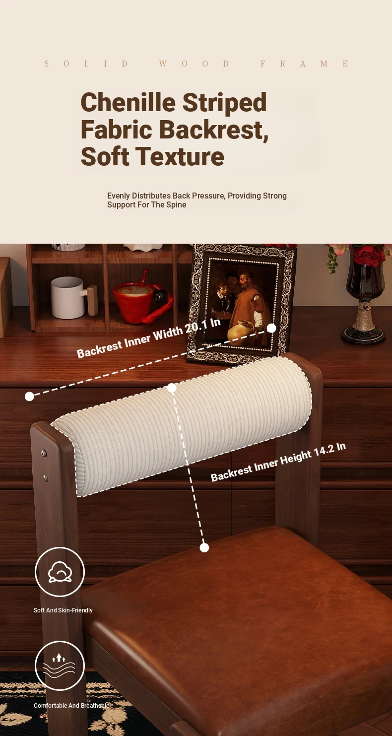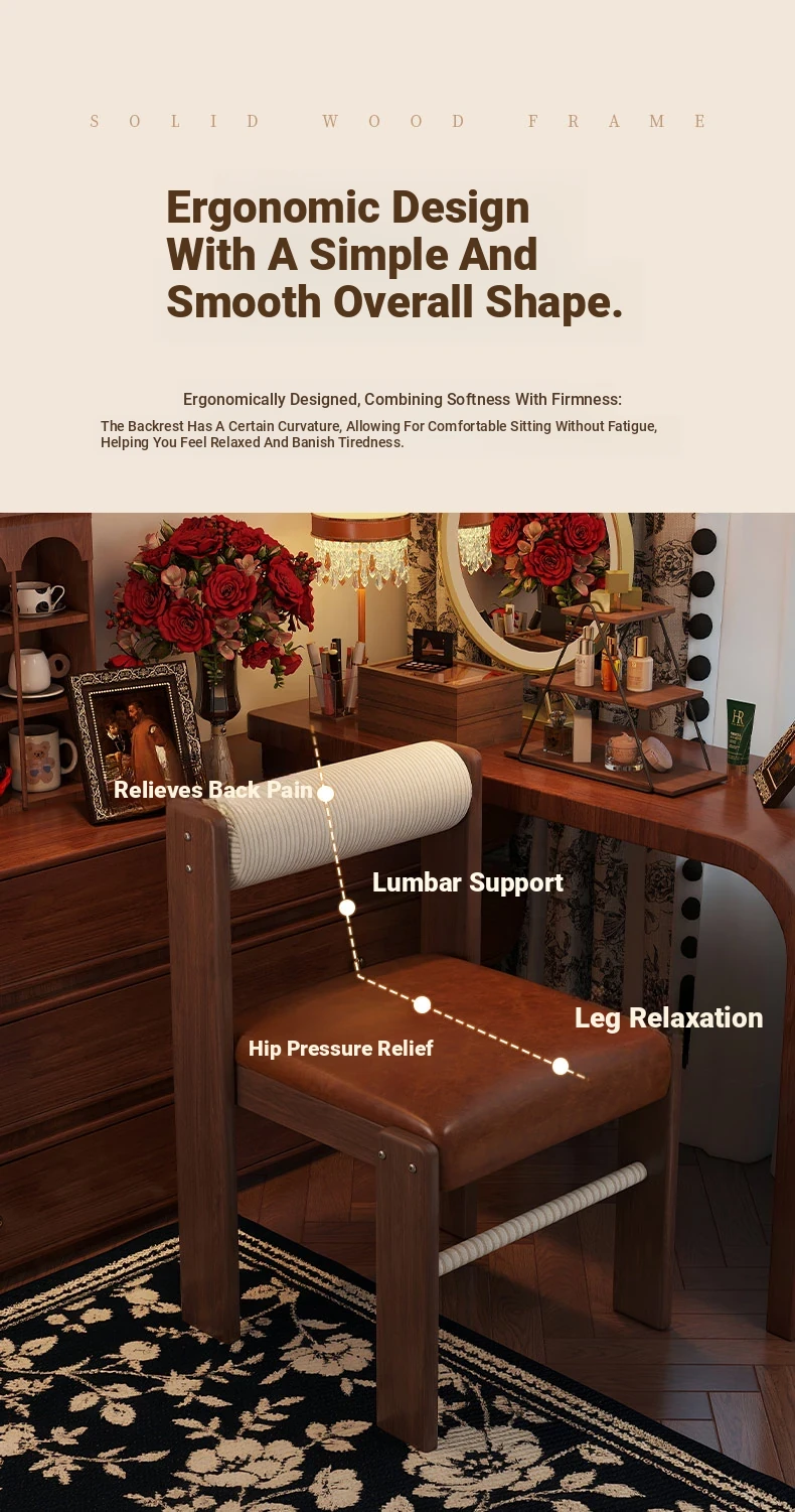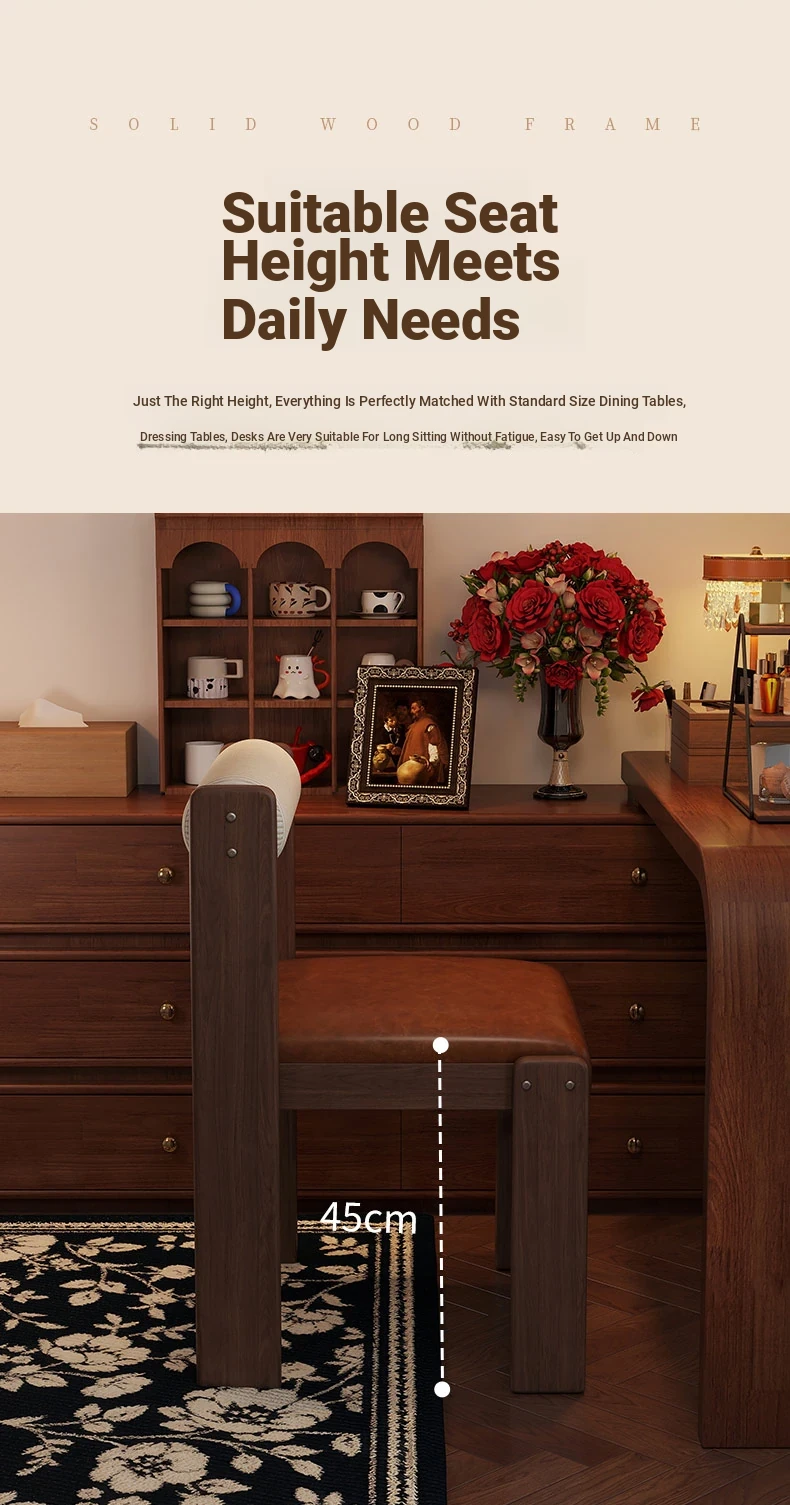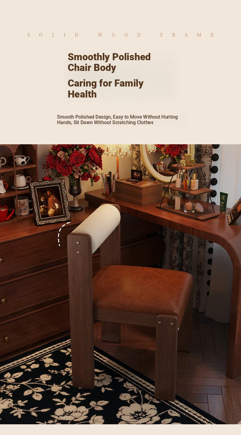 Wabi-Sabi Style Makeup Chair - Solid Wood Vanity Stool for Bedroom, French Vintage Dressing Table with Backrest, Soft Cushioned Dining Chair