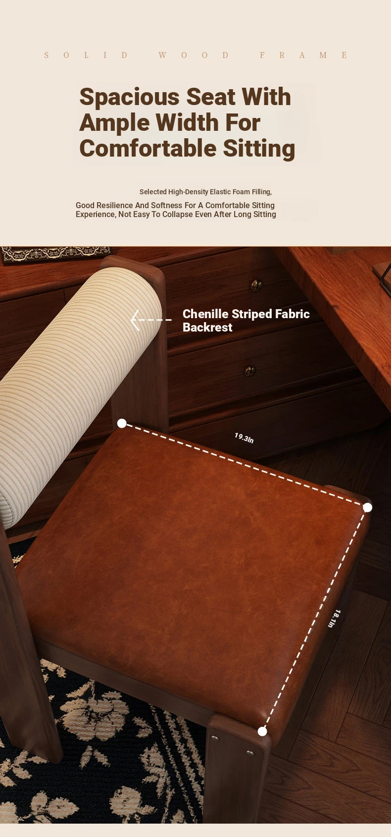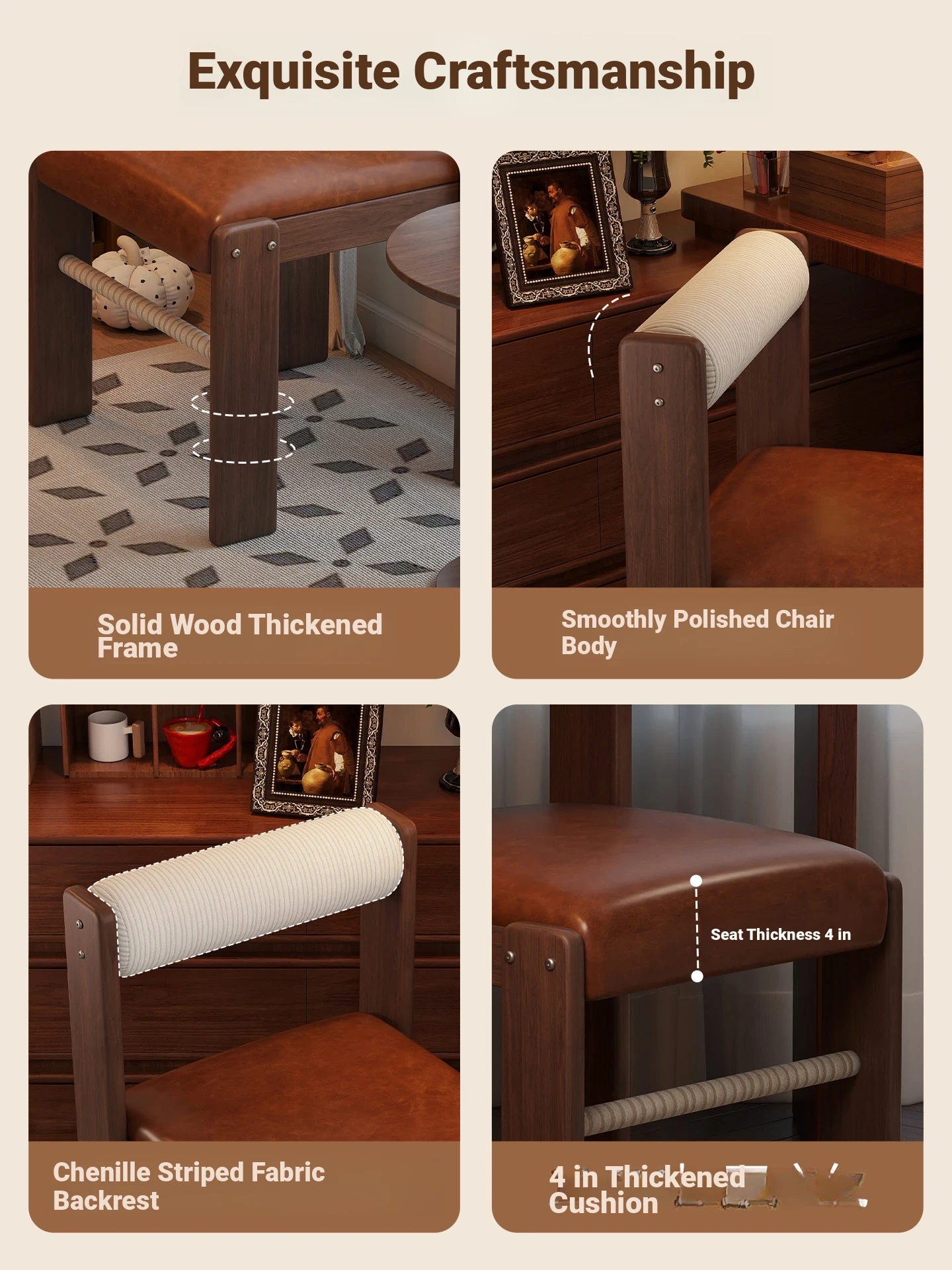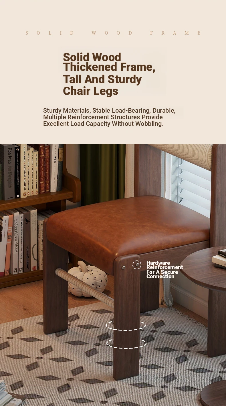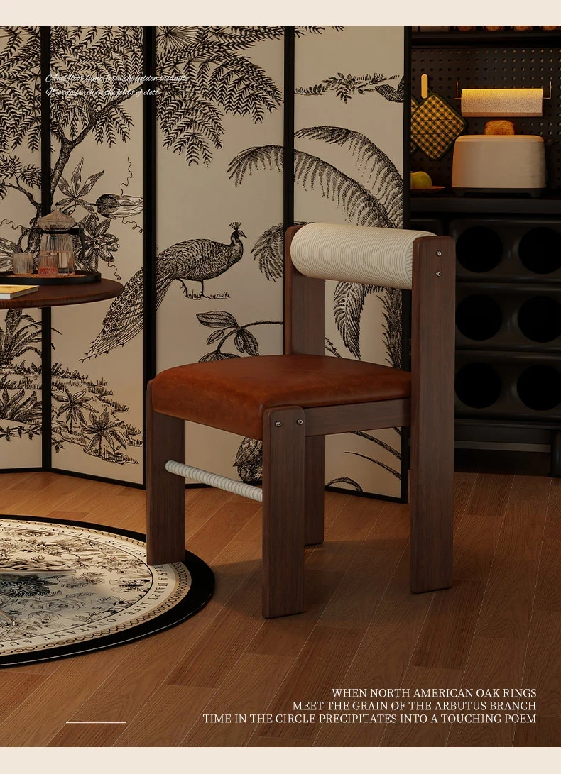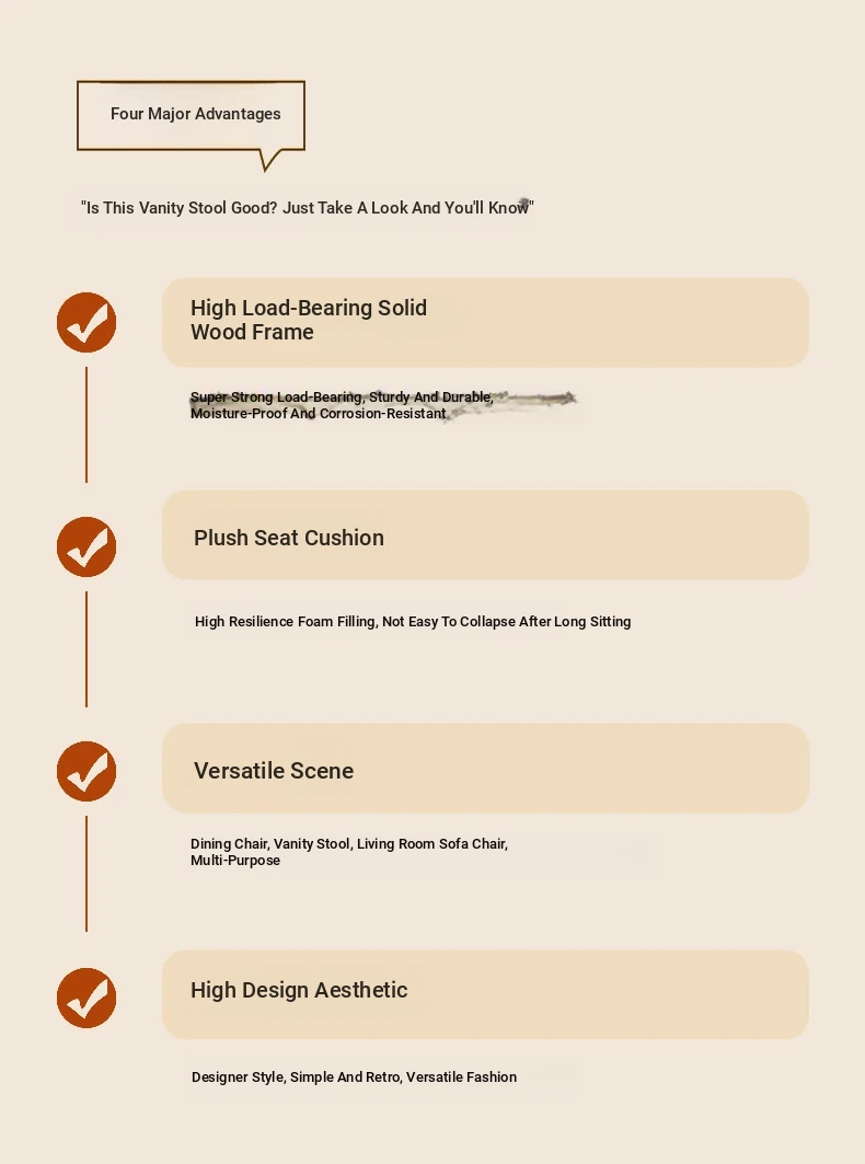 Wabi-Sabi Style Makeup Chair - Solid Wood Vanity Stool for Bedroom, French Vintage Dressing Table with Backrest, Soft Cushioned Dining Chair