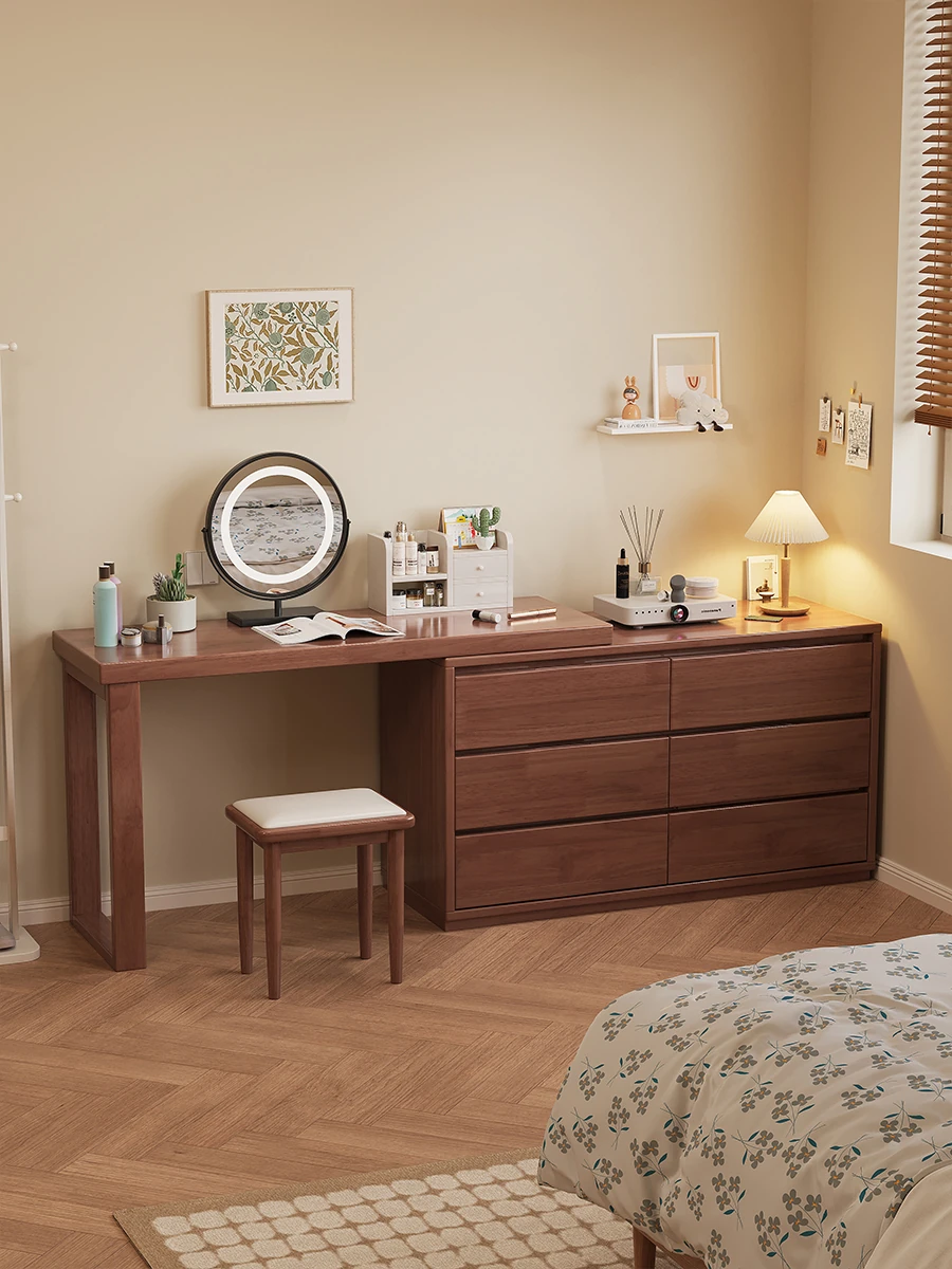 Nordic Solid Wood Vanity Table with Six-Drawer Chest - Multifunctional Expandable Desk for Modern Bedrooms, Featuring a Sleek Three-Drawer Design and Perfect for End-of-Bed Makeup Station