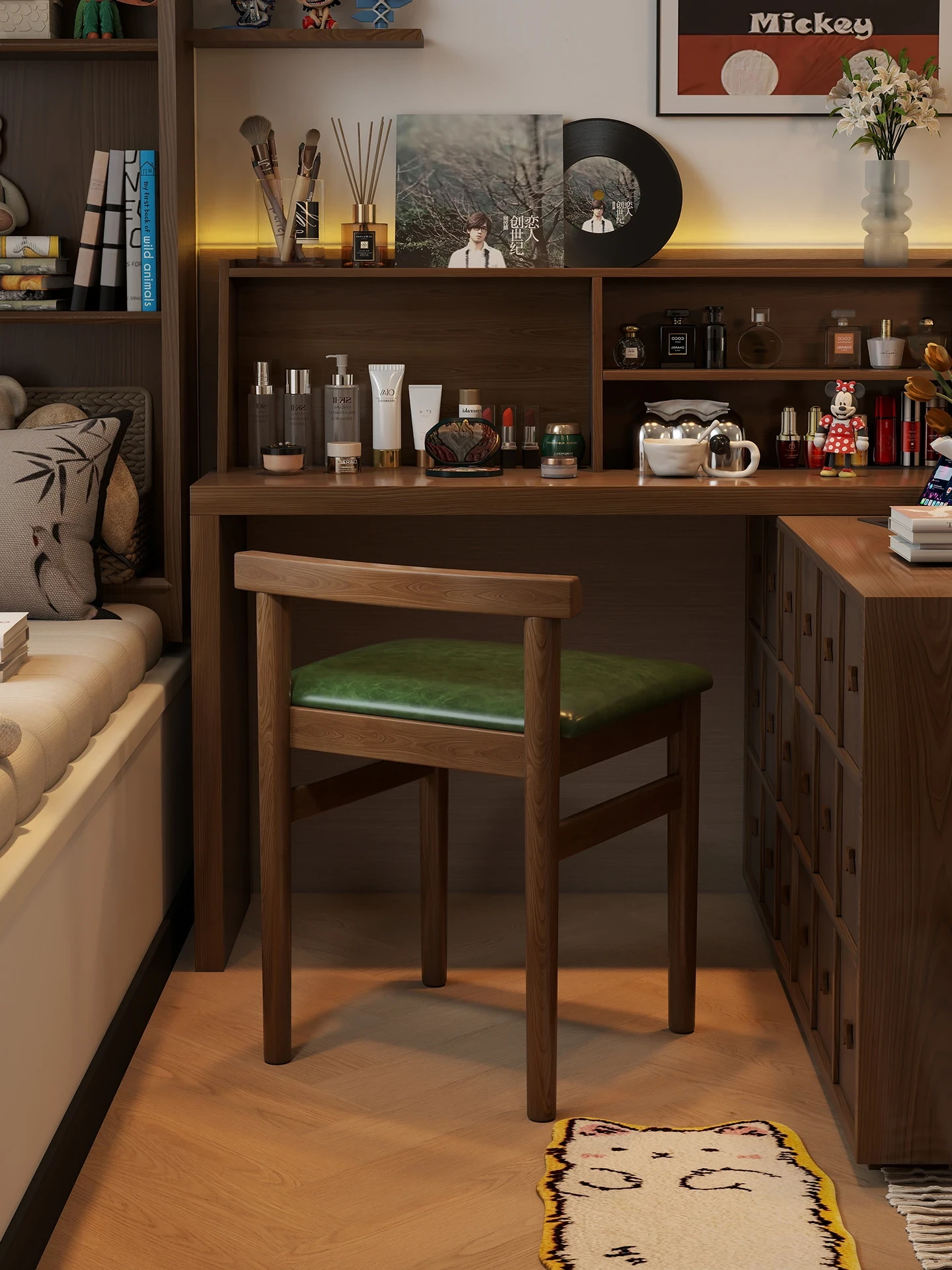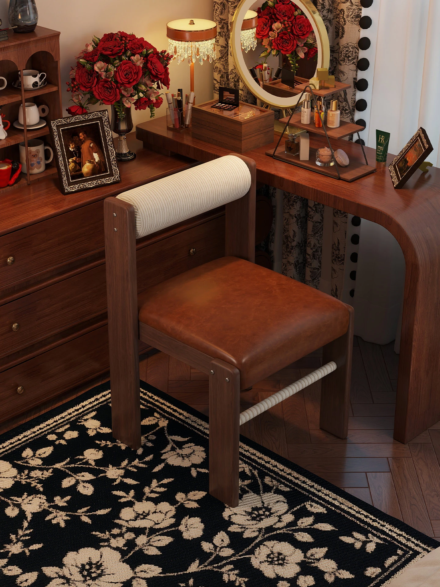 Wabi-Sabi Style Makeup Chair - Solid Wood Vanity Stool for Bedroom, French Vintage Dressing Table with Backrest, Soft Cushioned Dining Chair