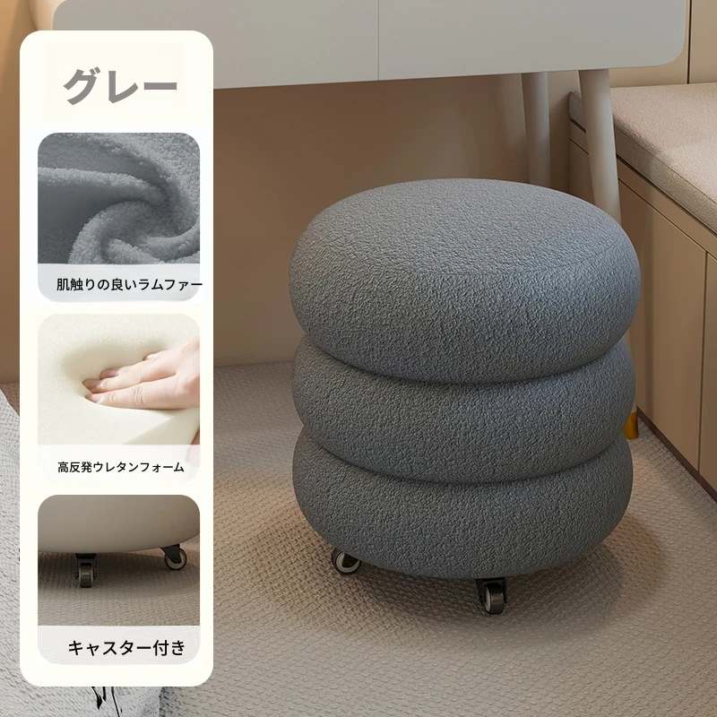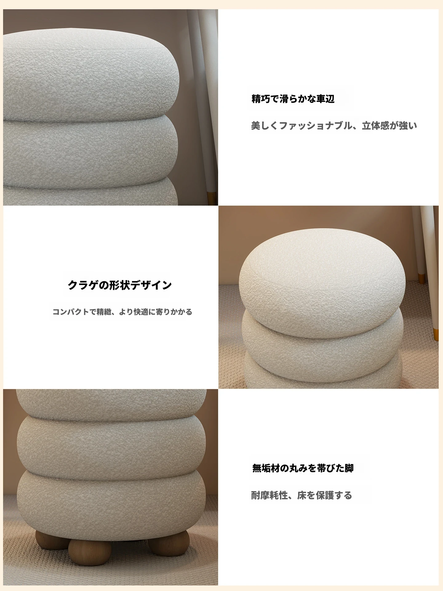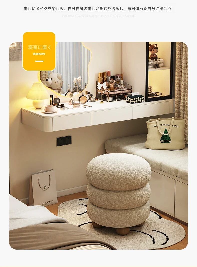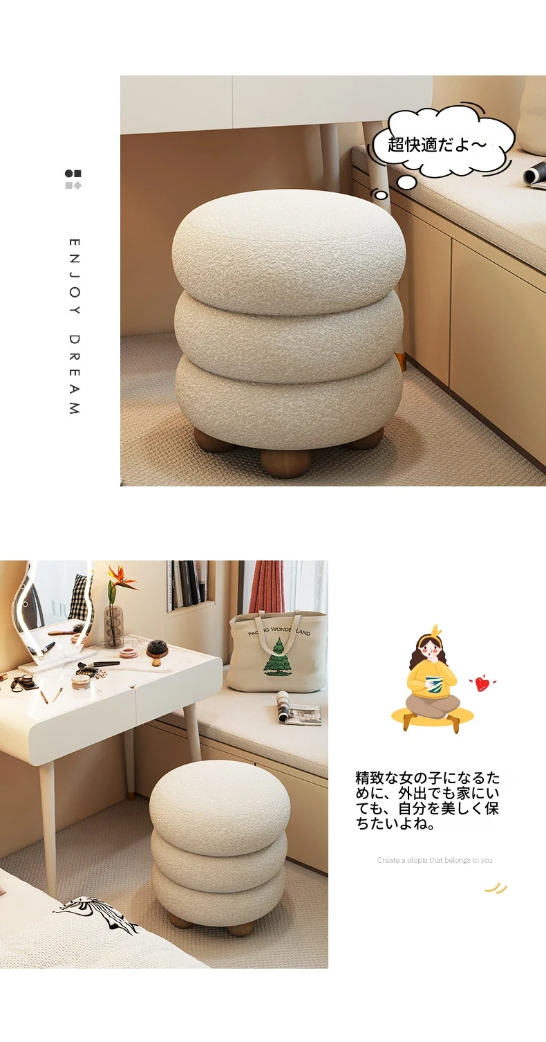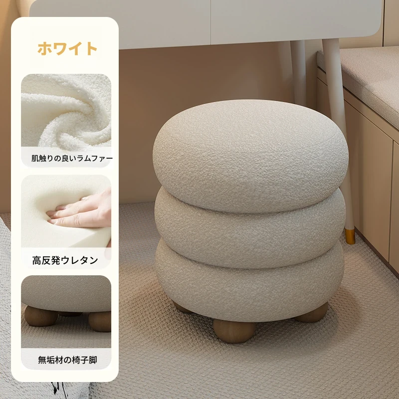 クリーミーな風合いのメイクアップスツール|インスタ映えするおしゃれなドレッシングスツール|モダンな寝室にぴったりのラウンドスツール|ふわふわのラムウール素材で快適な座り心地!