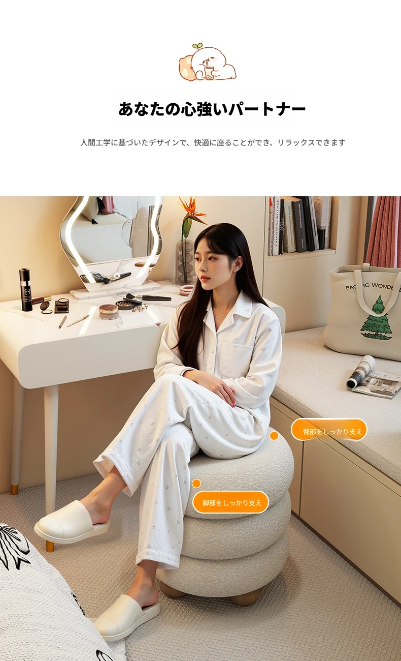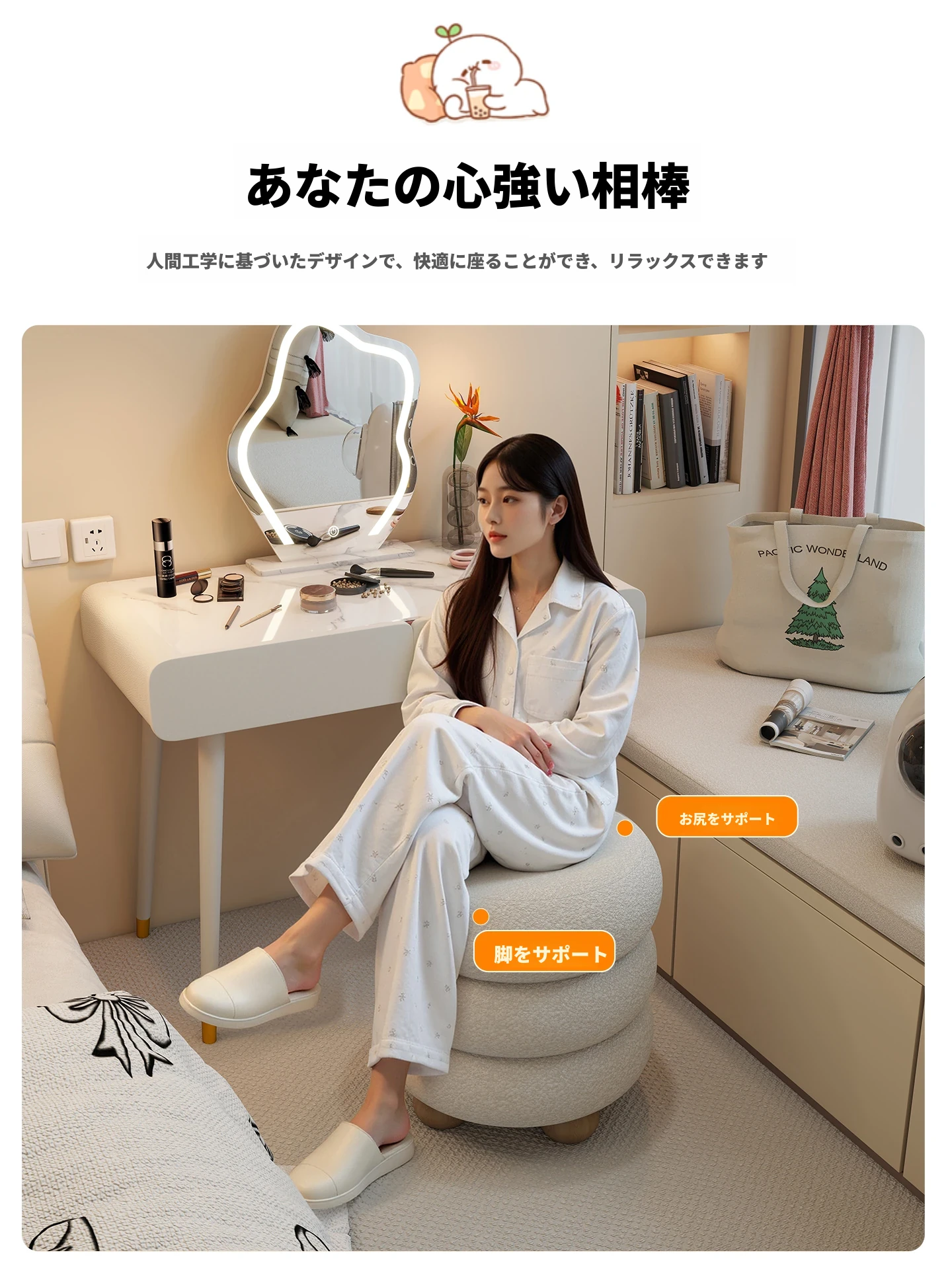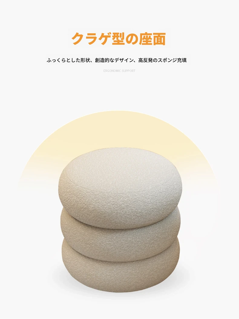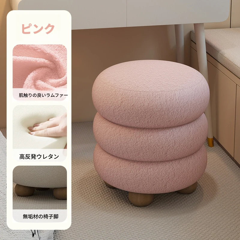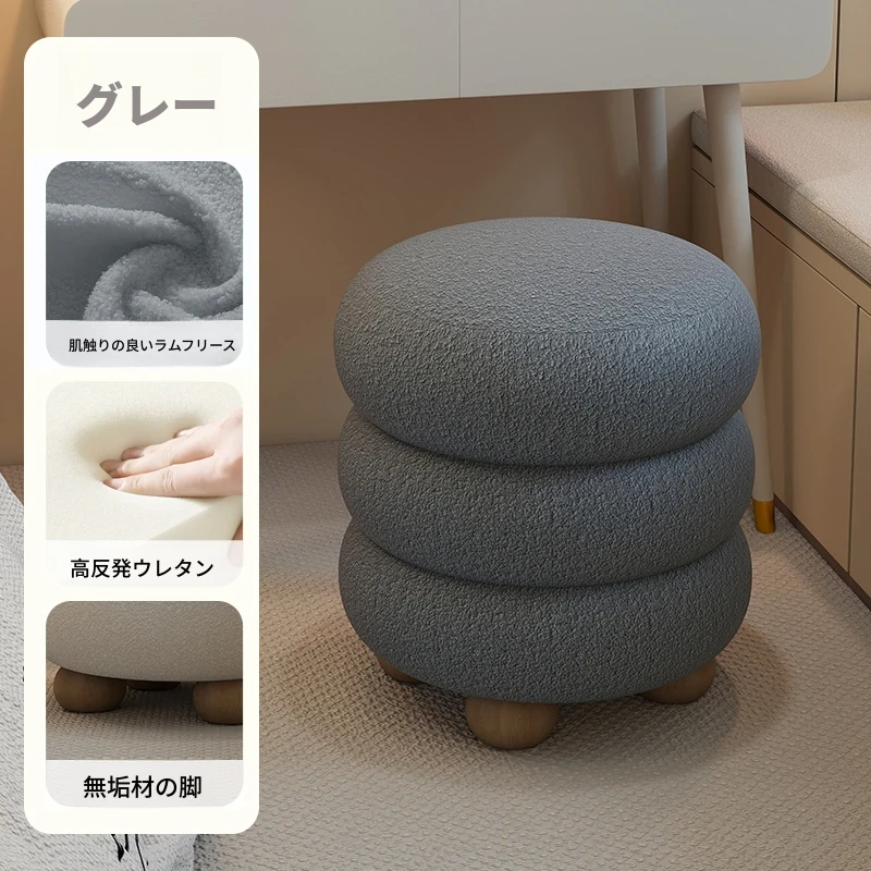 クリーミーな風合いのメイクアップスツール|インスタ映えするおしゃれなドレッシングスツール|モダンな寝室にぴったりのラウンドスツール|ふわふわのラムウール素材で快適な座り心地!
