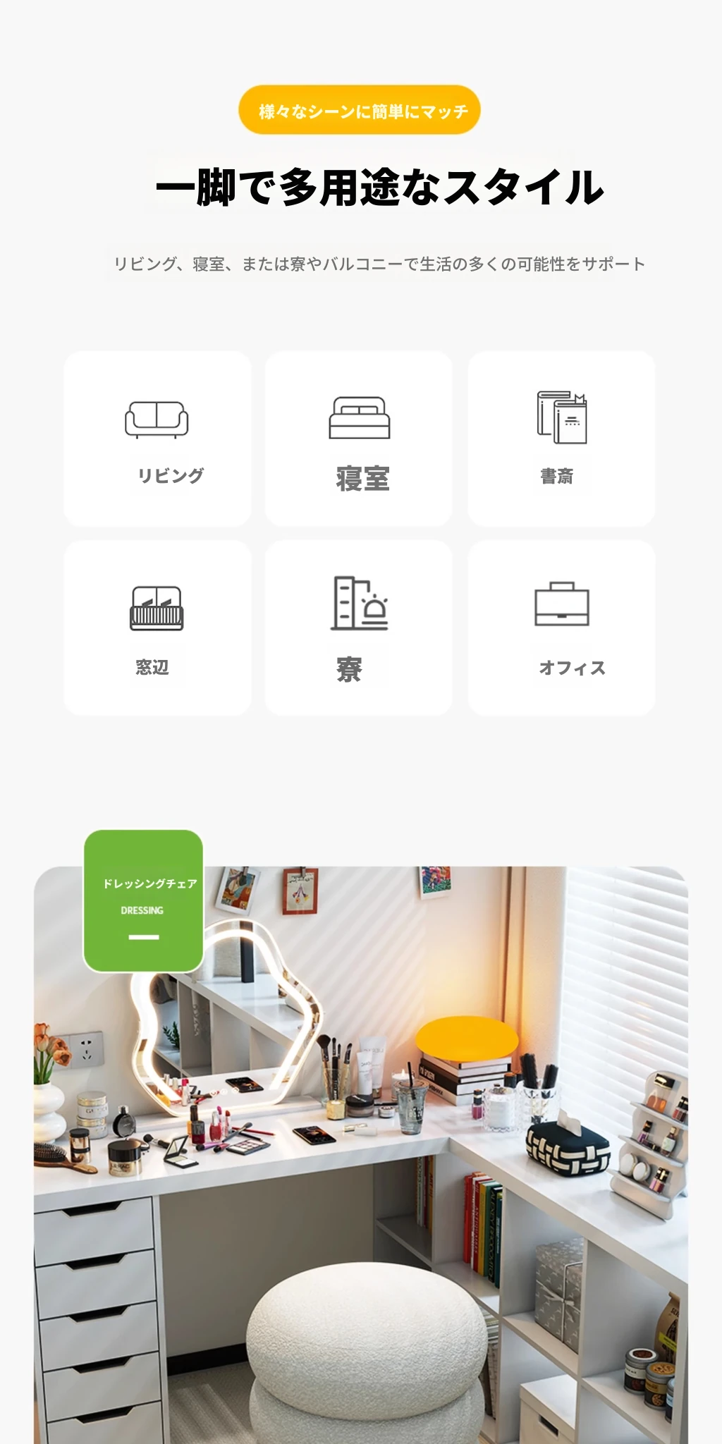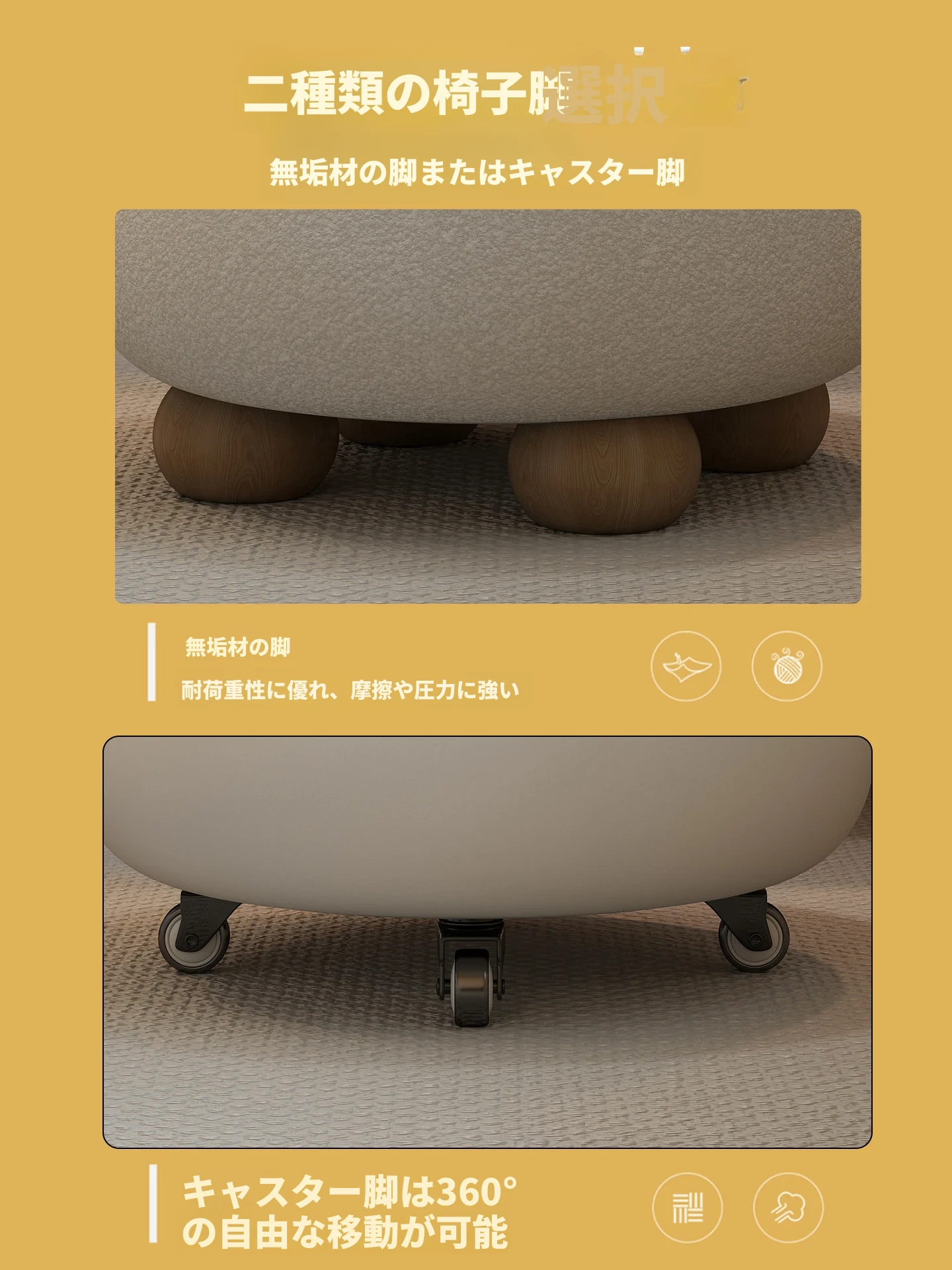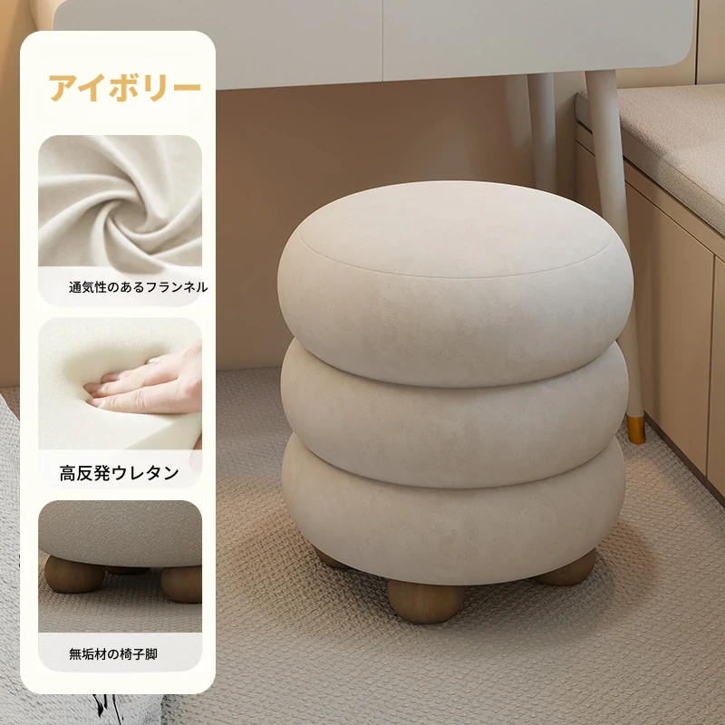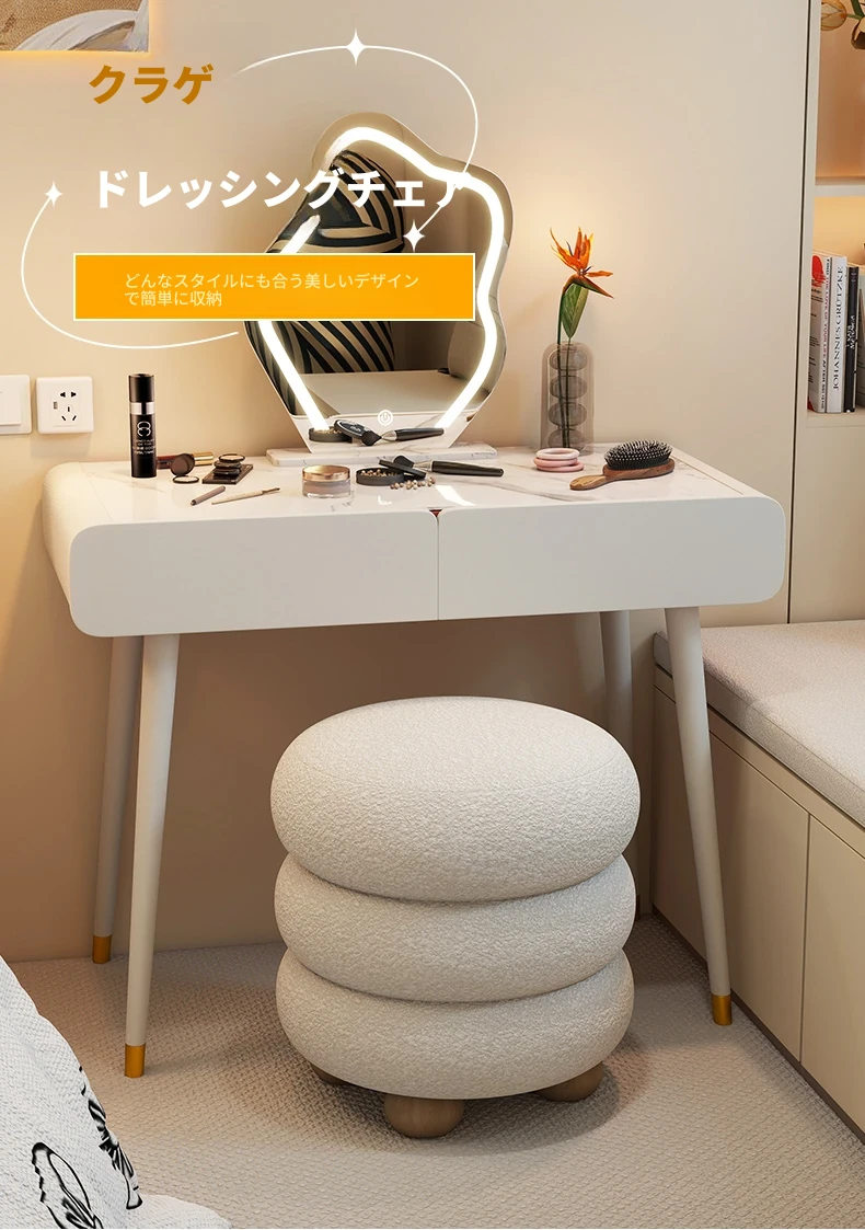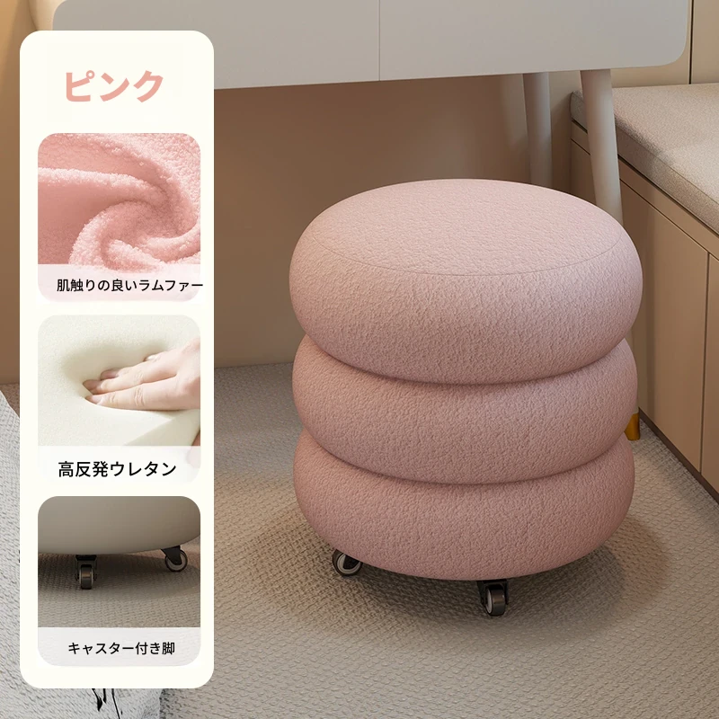 クリーミーな風合いのメイクアップスツール|インスタ映えするおしゃれなドレッシングスツール|モダンな寝室にぴったりのラウンドスツール|ふわふわのラムウール素材で快適な座り心地!