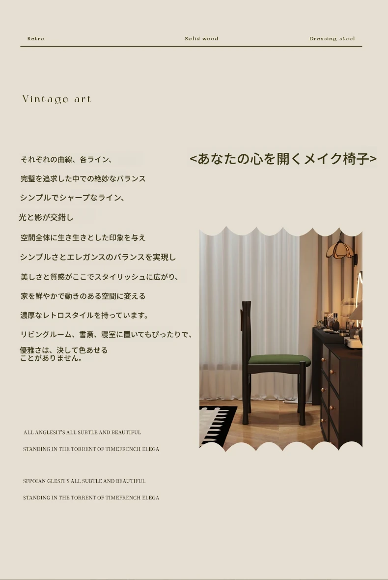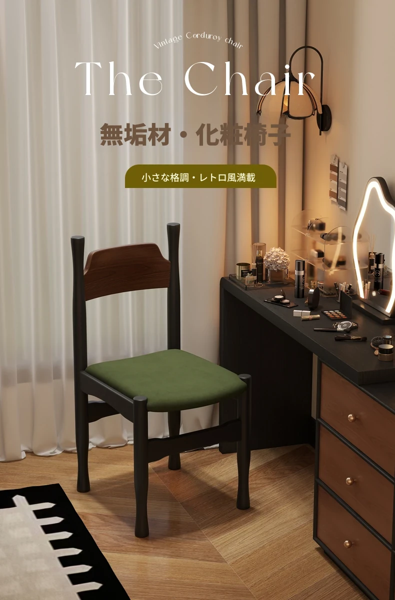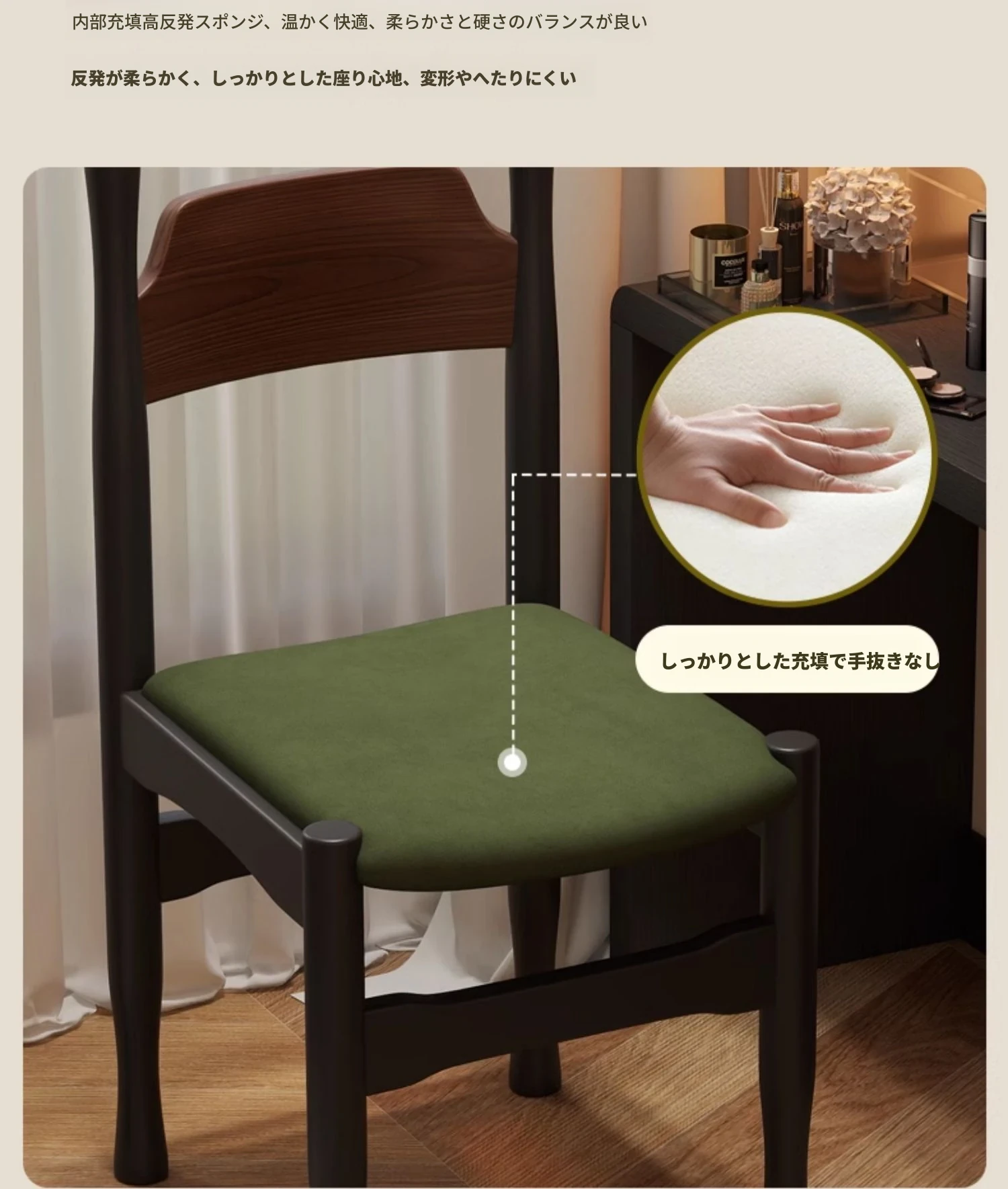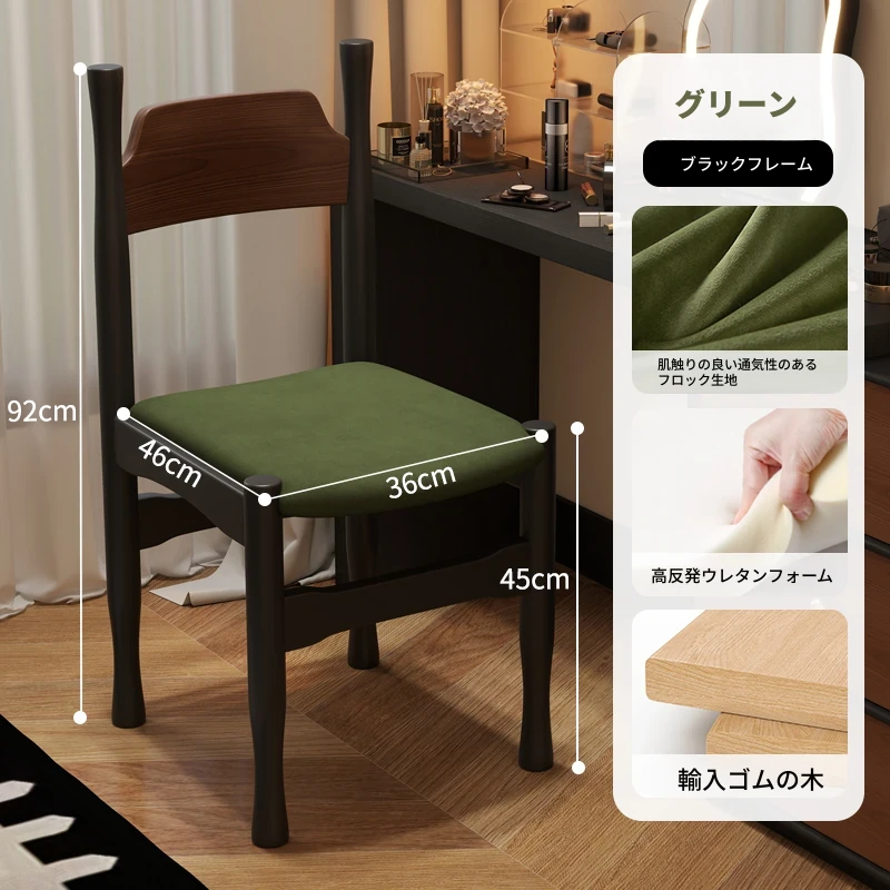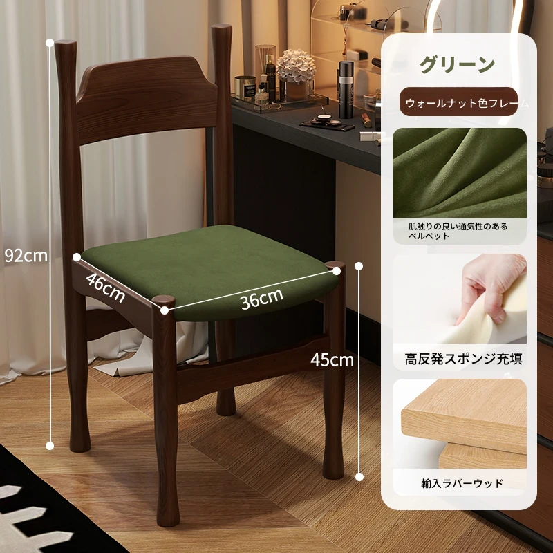 フレンチビンテージスタイルの高級実木化粧台椅子|エレガントな背もたれ付きグリーンチェア|書斎やドレッシングルームにぴったり!あなたの空間を華やかに演出します。