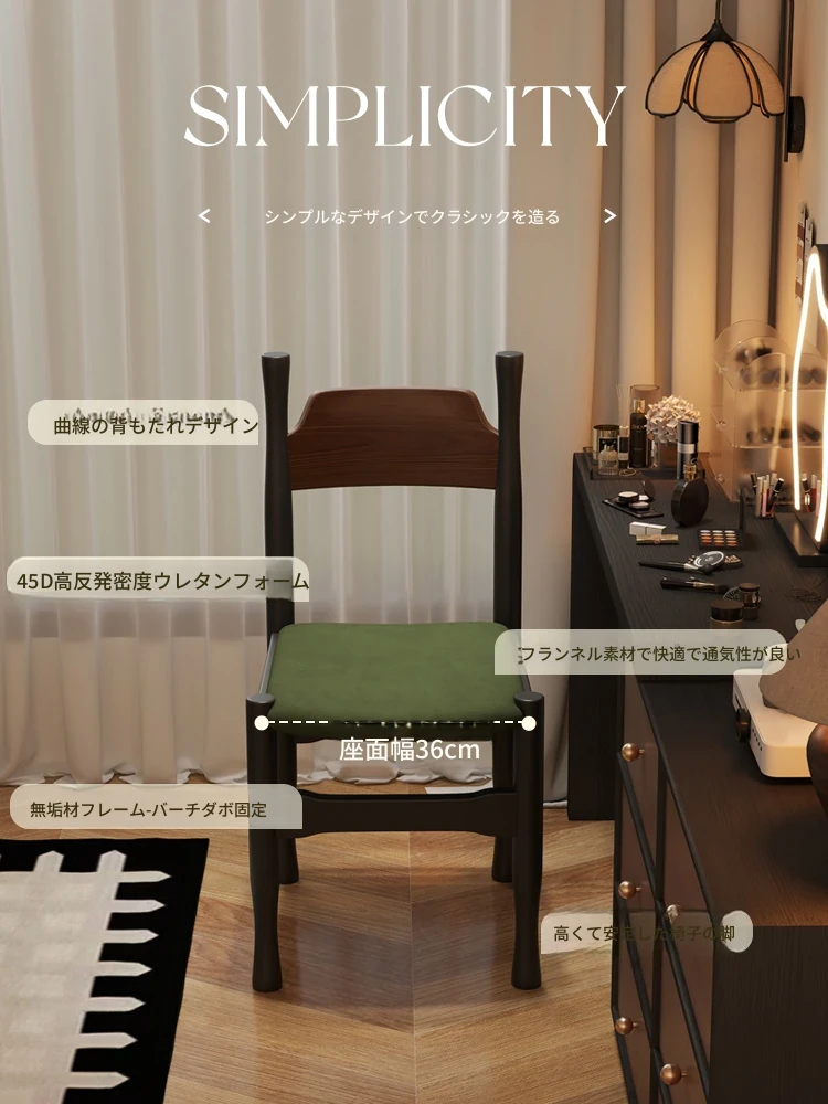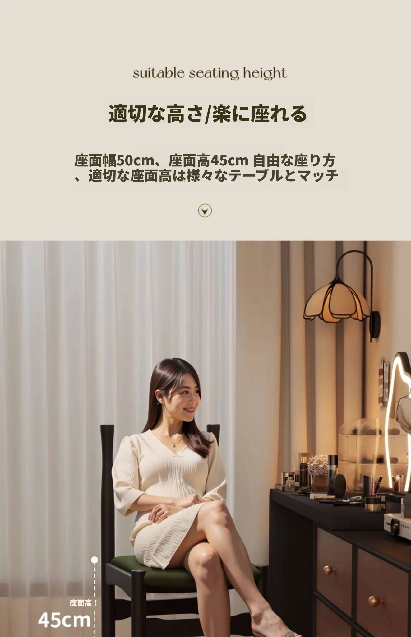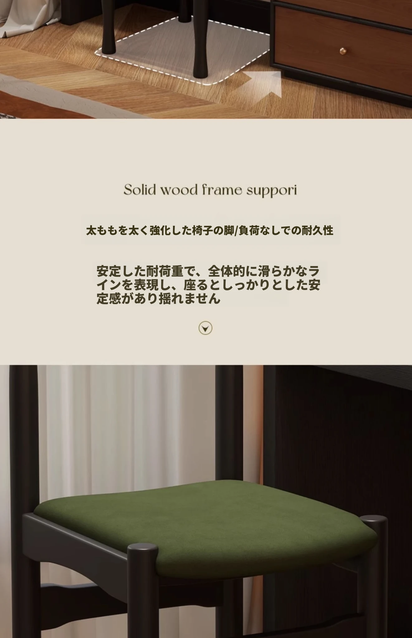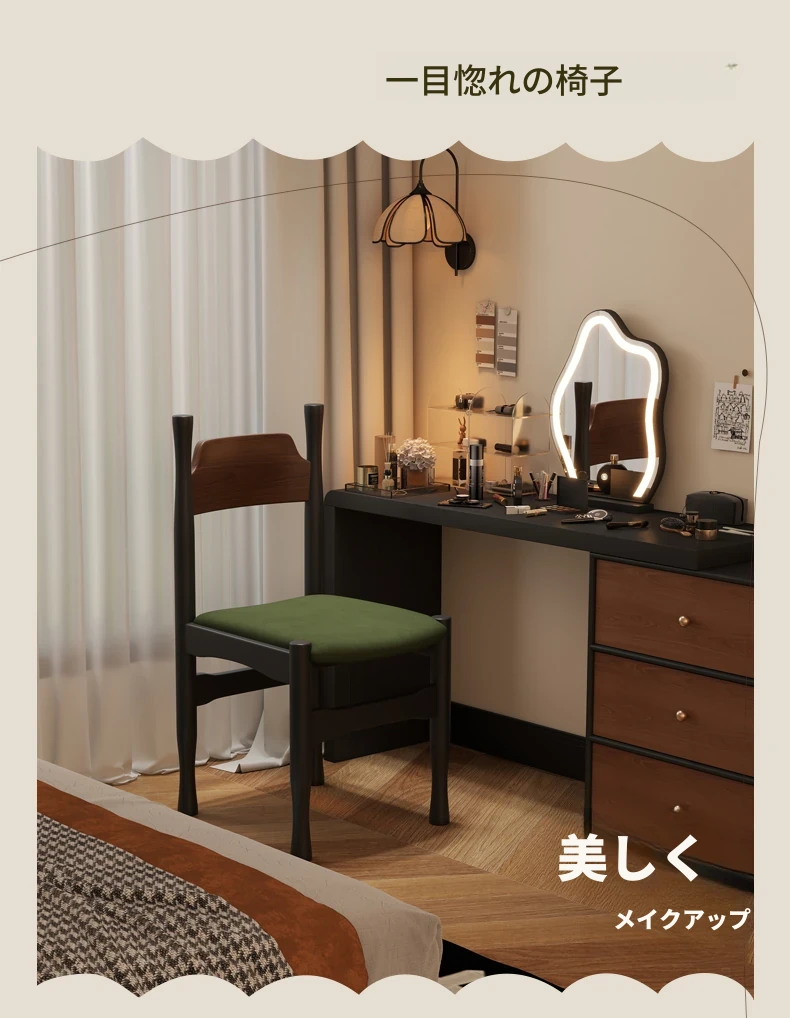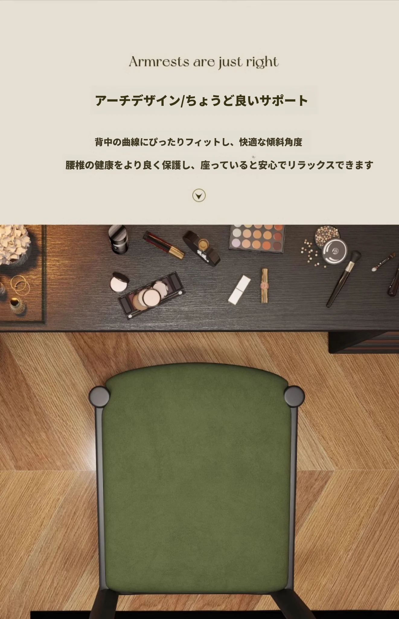 フレンチビンテージスタイルの高級実木化粧台椅子|エレガントな背もたれ付きグリーンチェア|書斎やドレッシングルームにぴったり!あなたの空間を華やかに演出します。