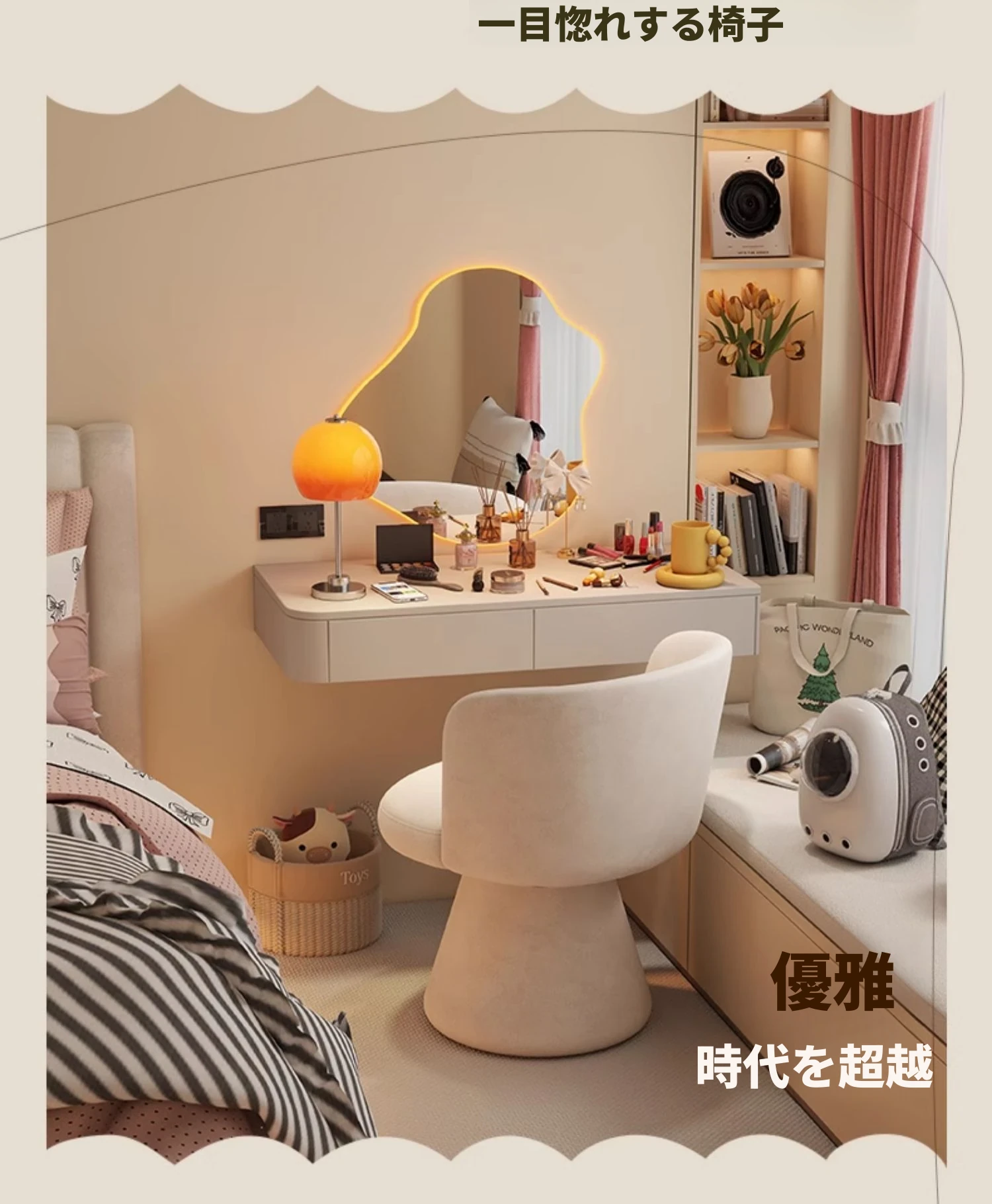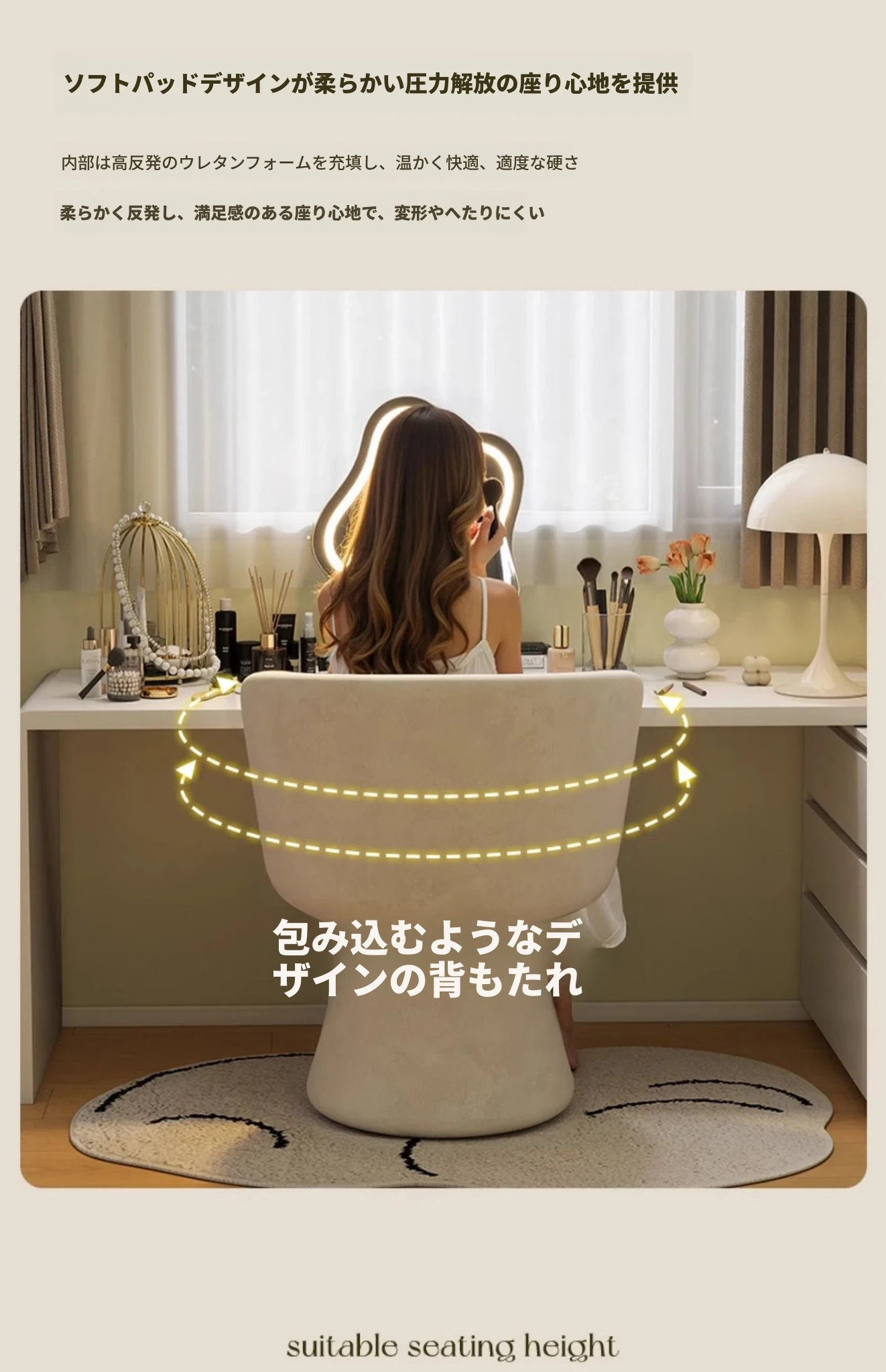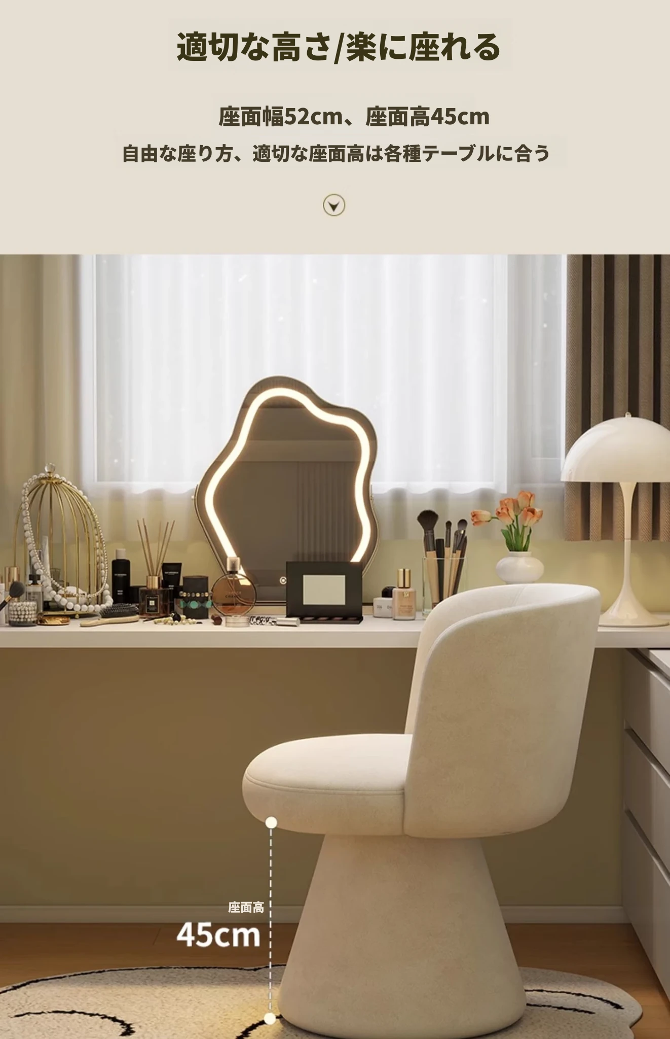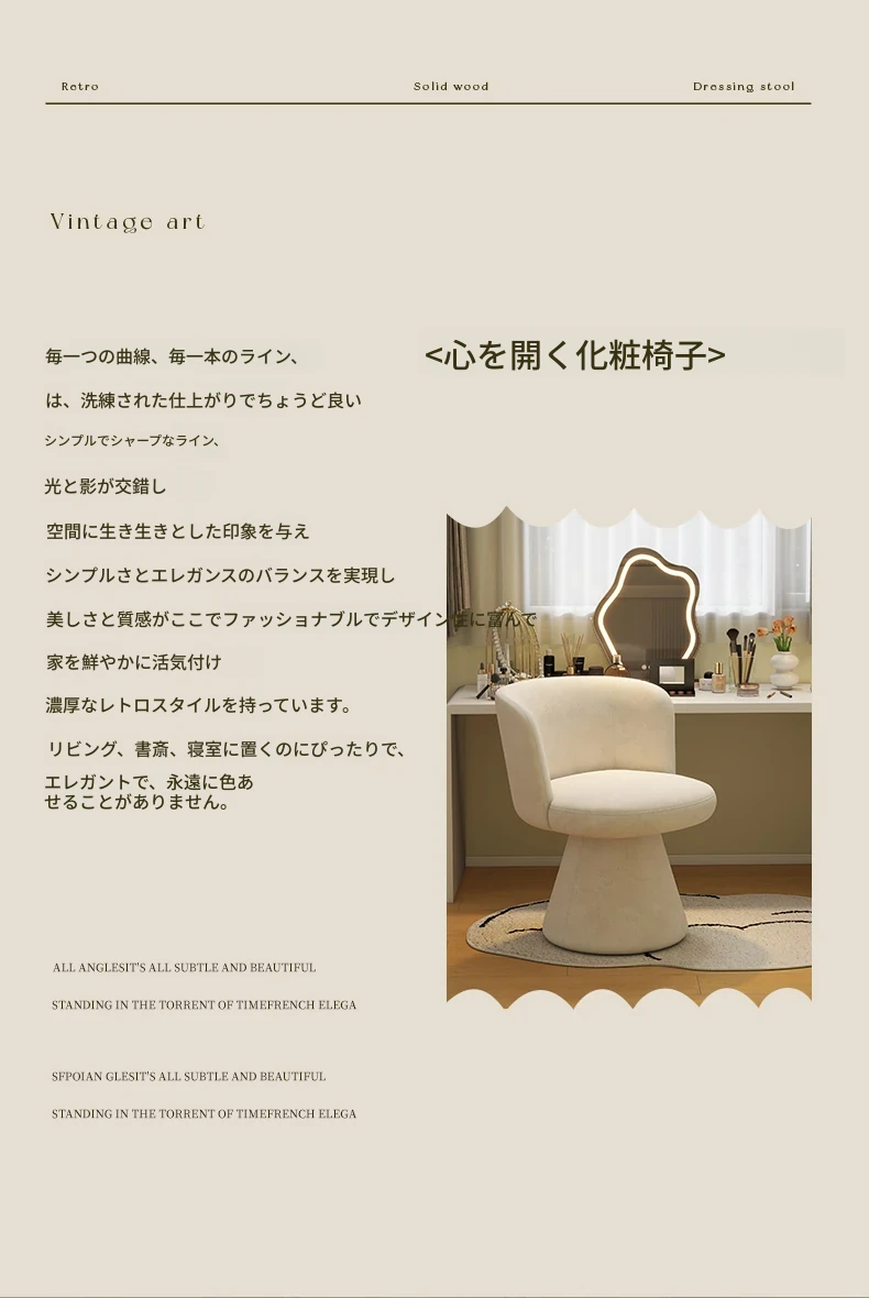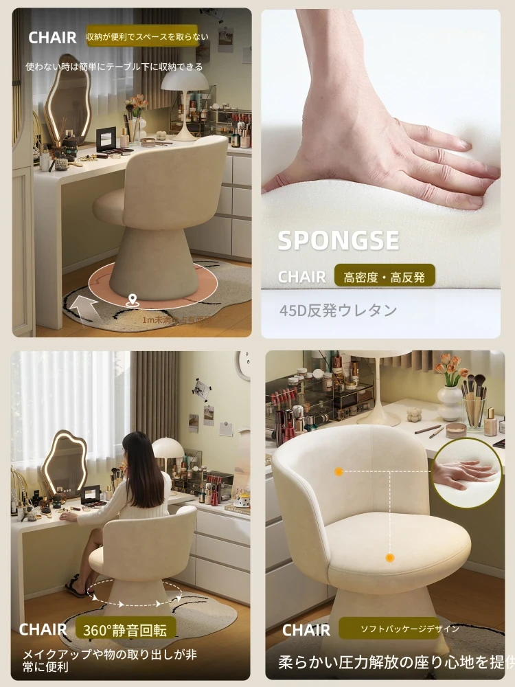 家庭用化粧椅、花びら型のデザインが魅力的!軽やかで高級感溢れるスタイル。女性の寝室にぴったりなクリーミーな雰囲気のドレッサーチェア。回転式でネイル作業にも最適!