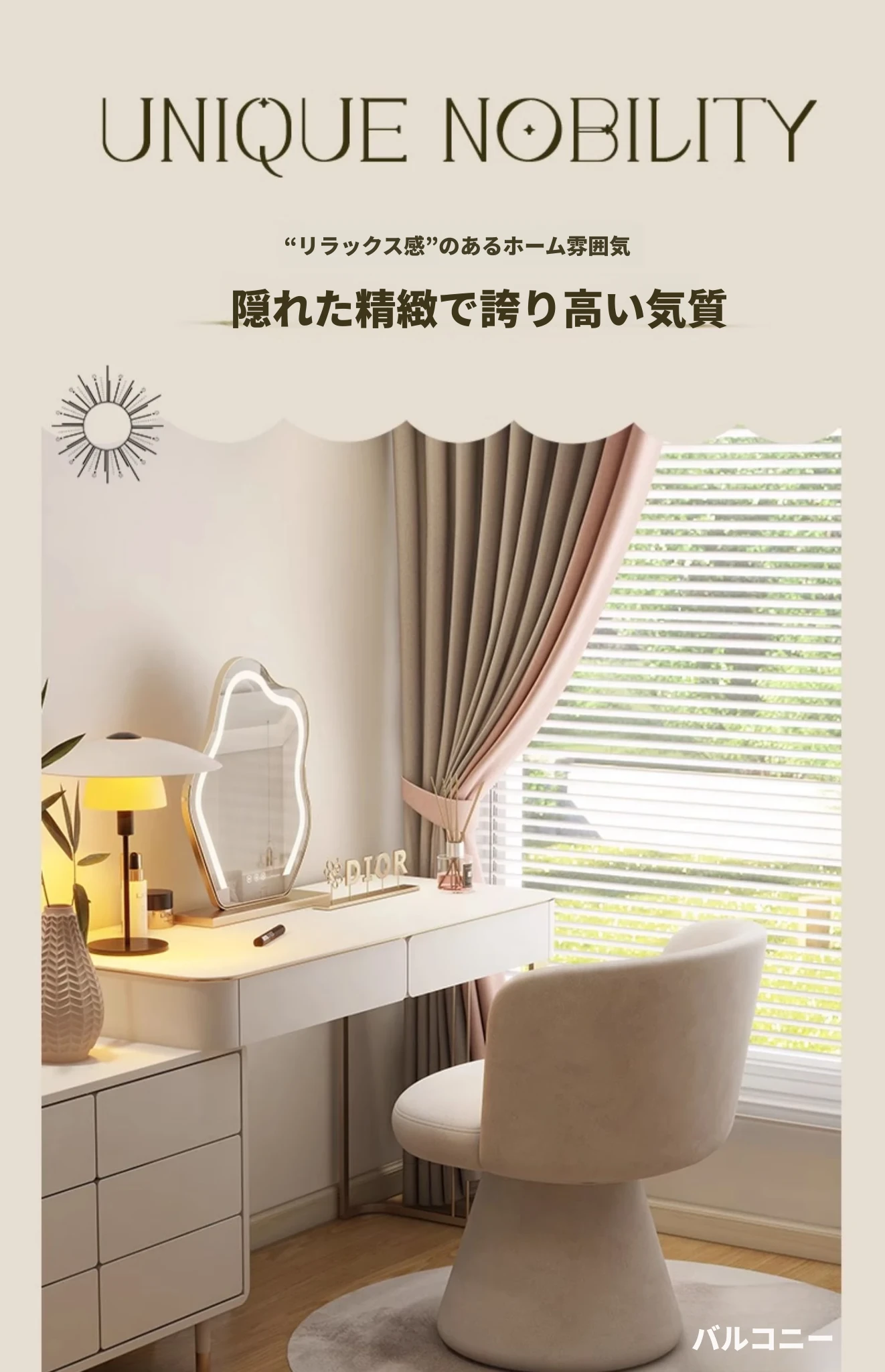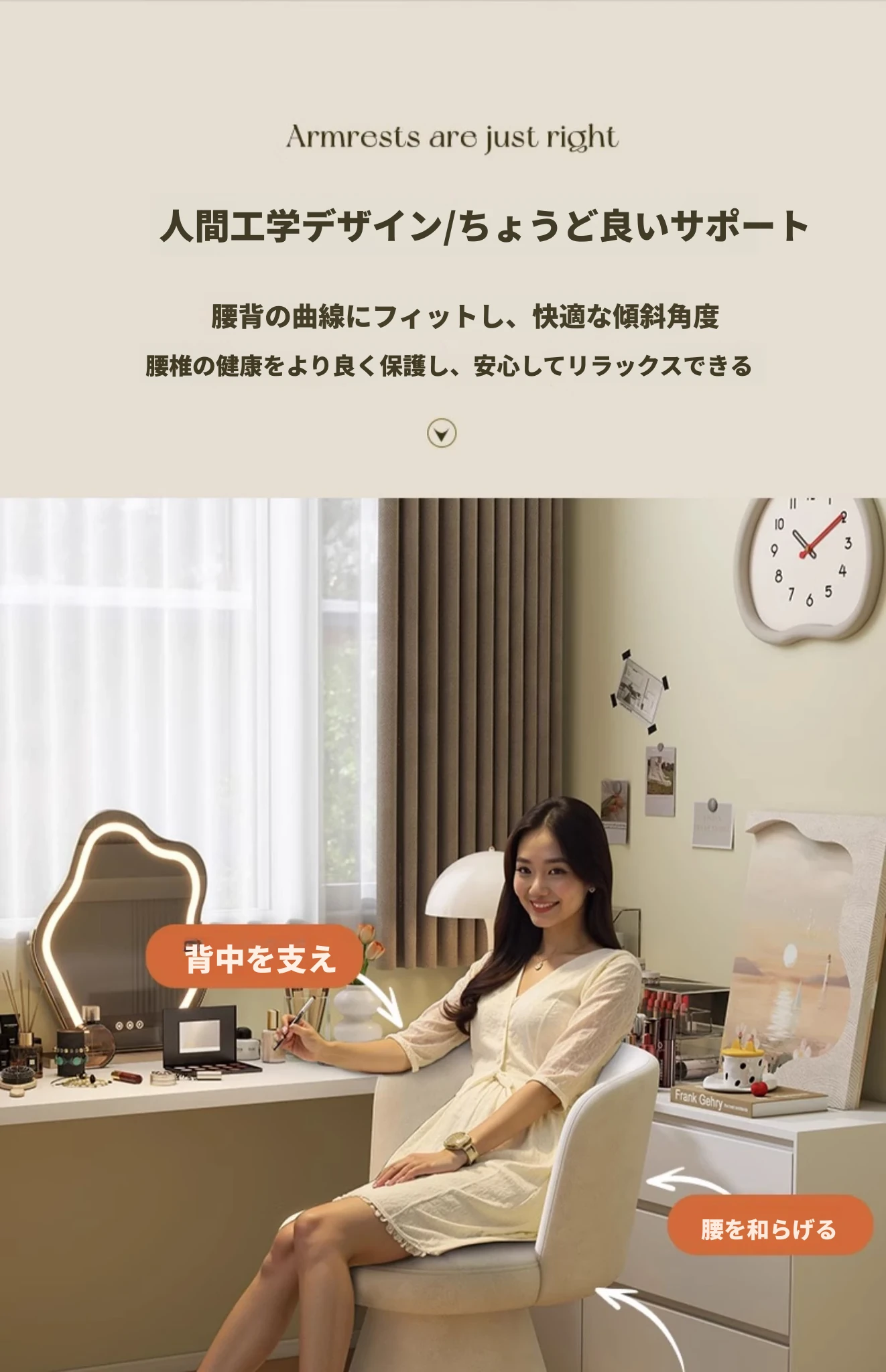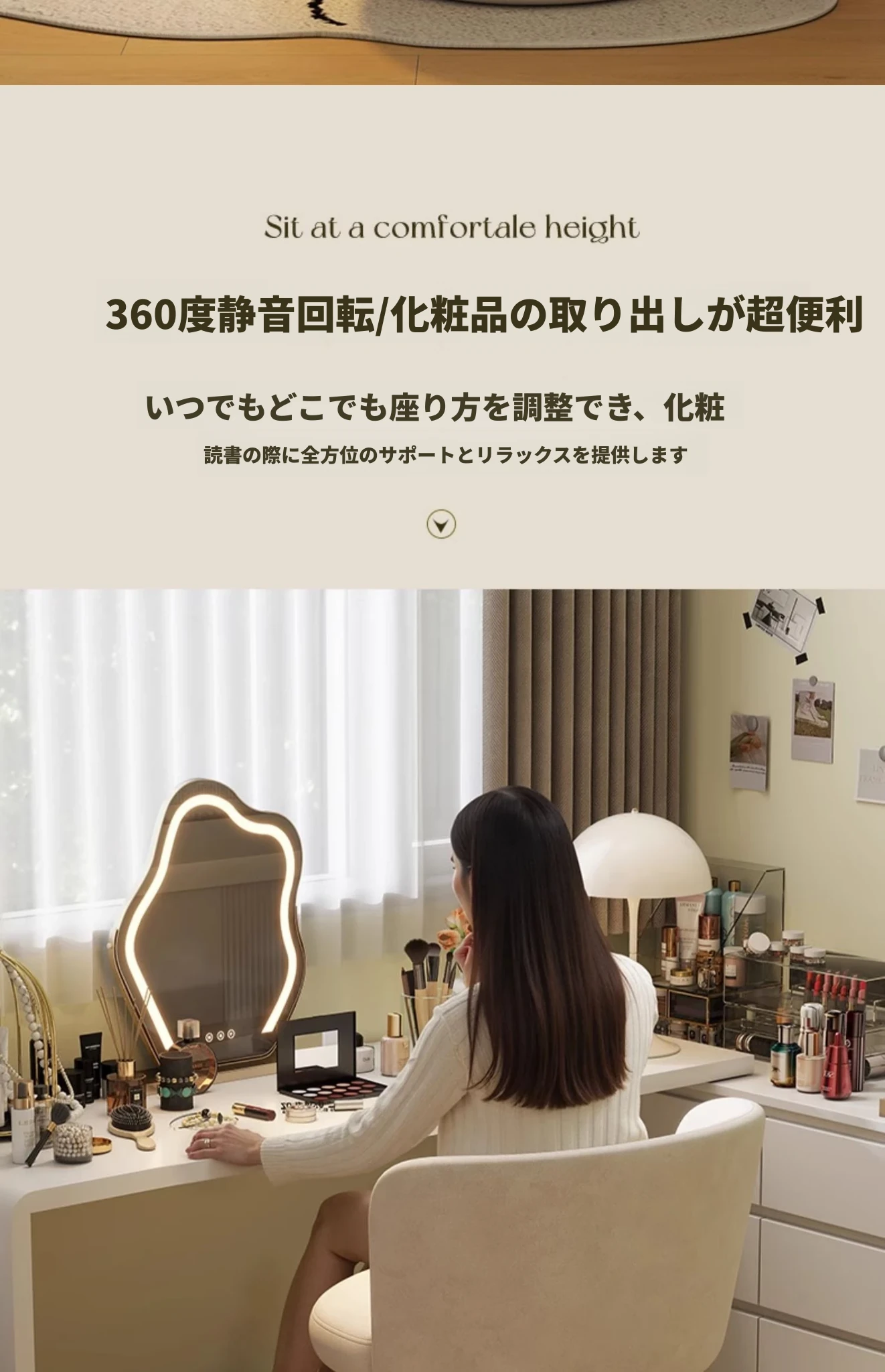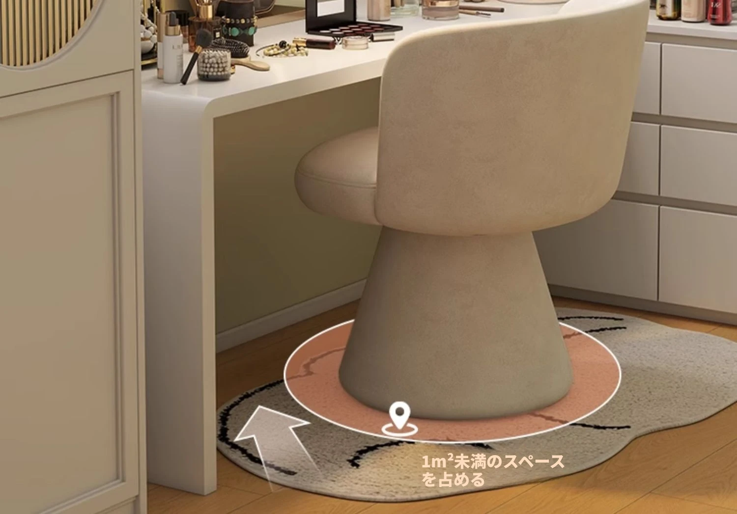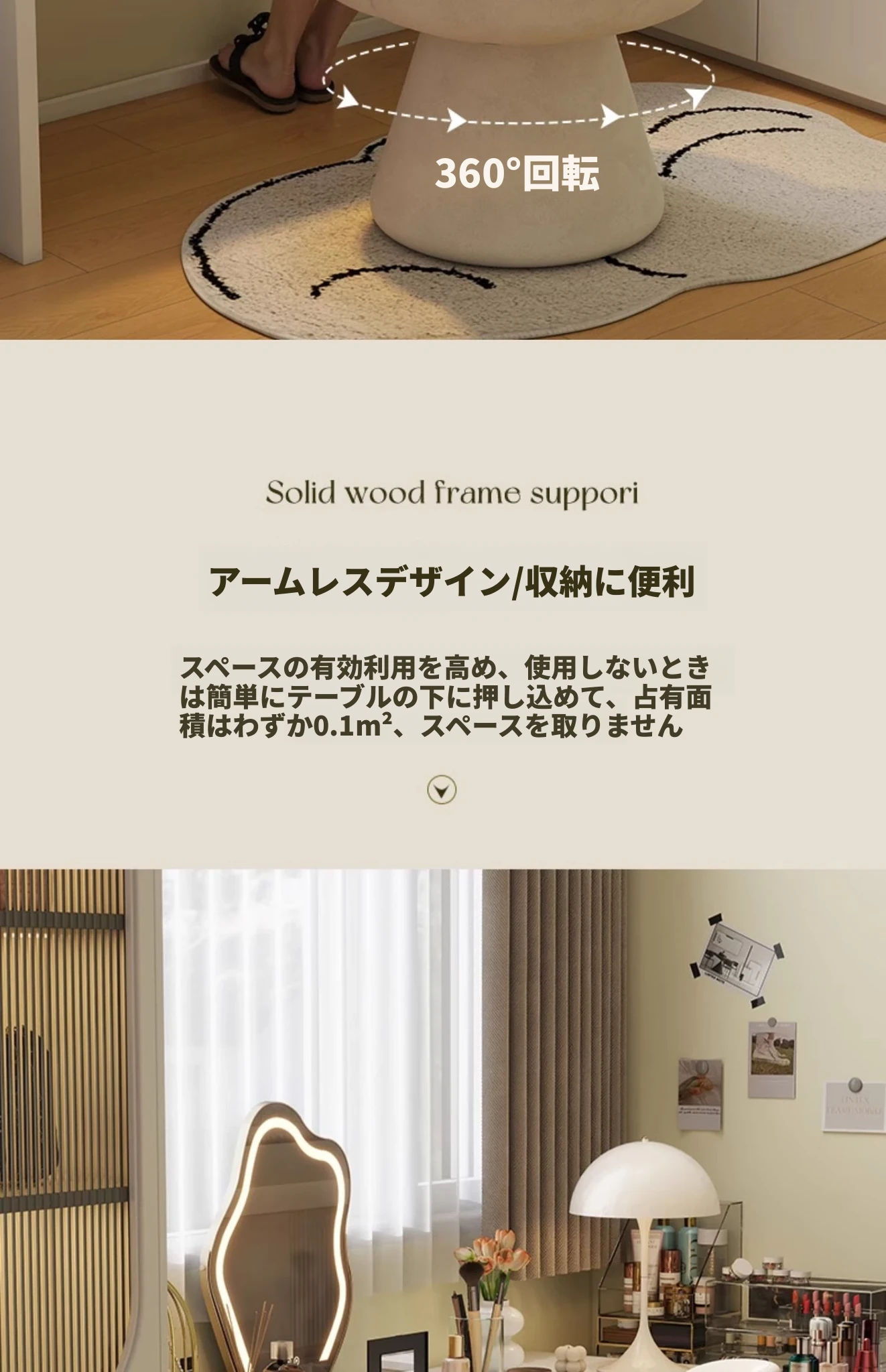 家庭用化粧椅、花びら型のデザインが魅力的!軽やかで高級感溢れるスタイル。女性の寝室にぴったりなクリーミーな雰囲気のドレッサーチェア。回転式でネイル作業にも最適!