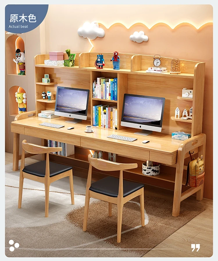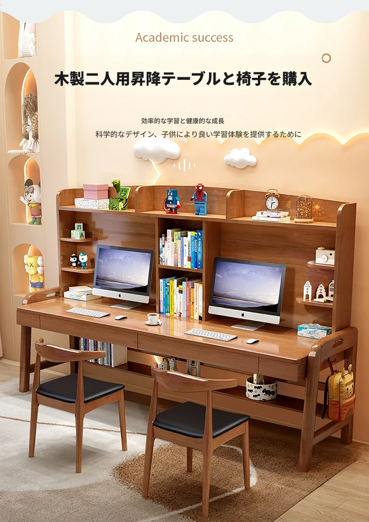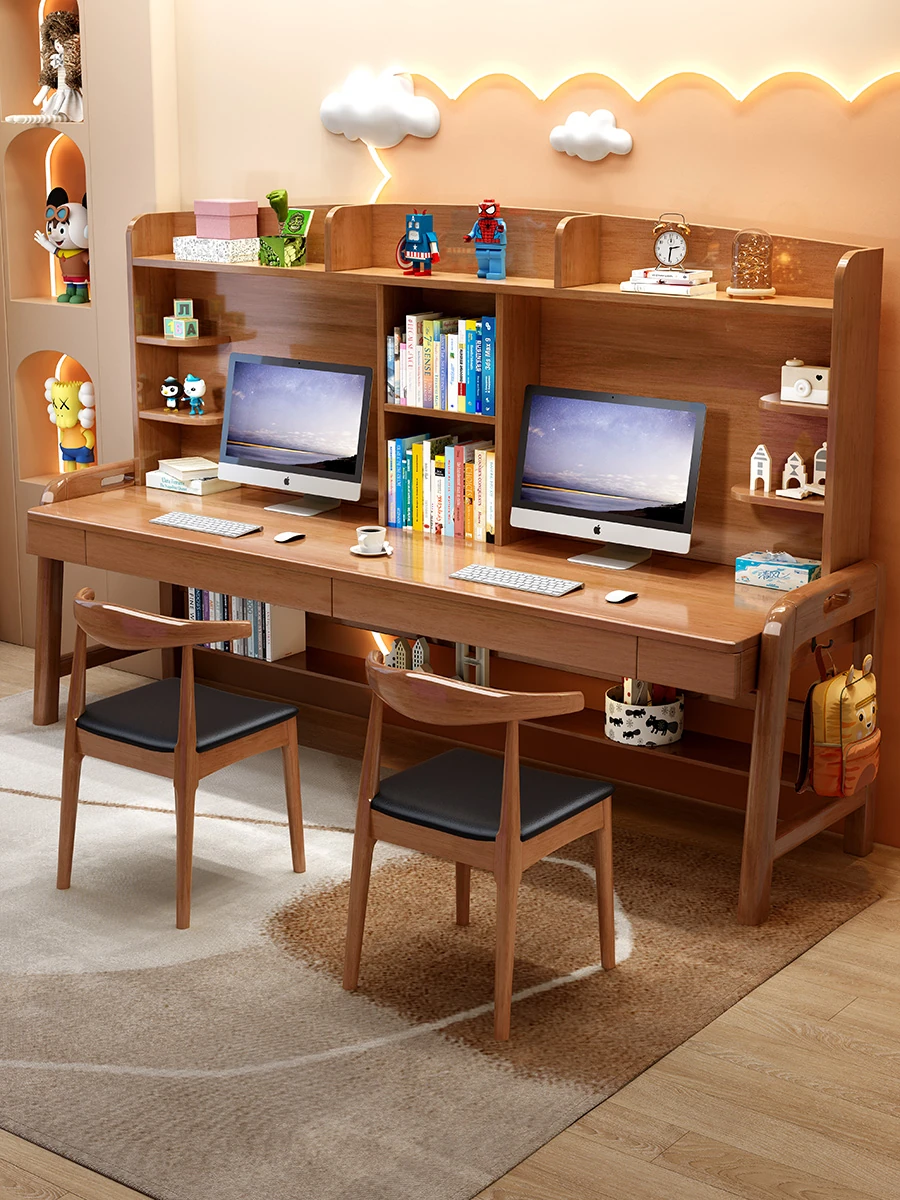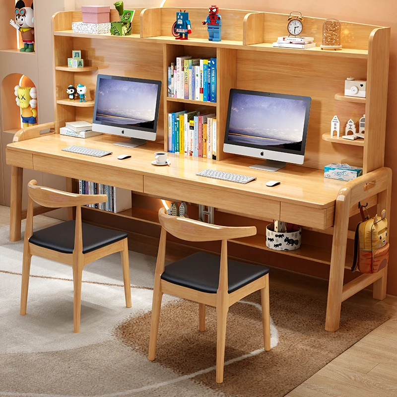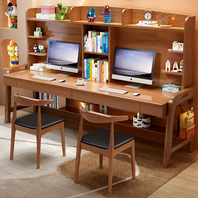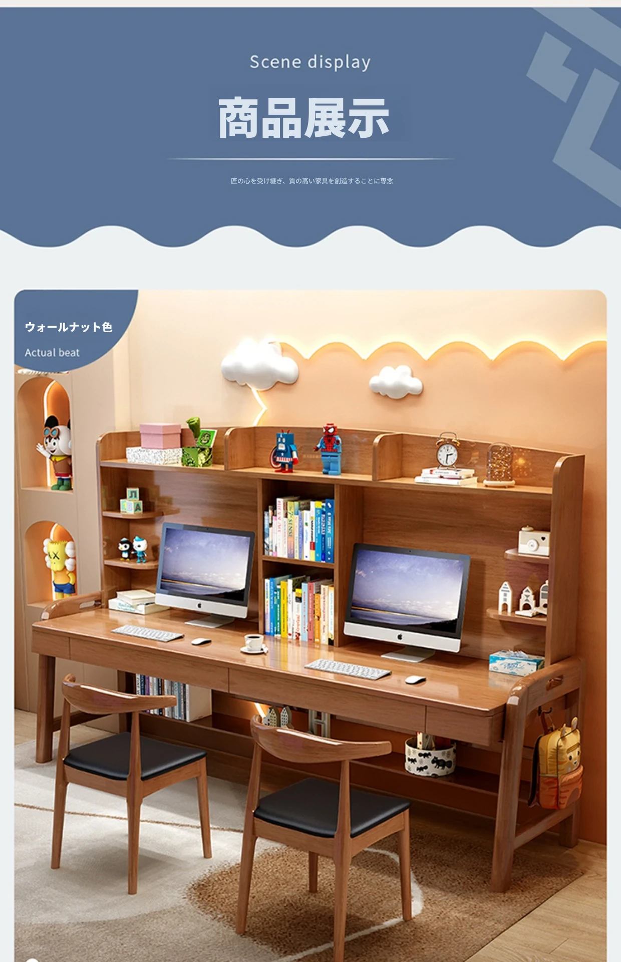 【シンプルモダン】天然木材使用!家庭用オフィスのデュアルデスク:実用性抜群の書棚一体型PCデスク