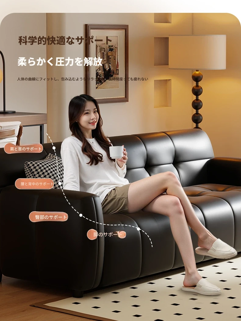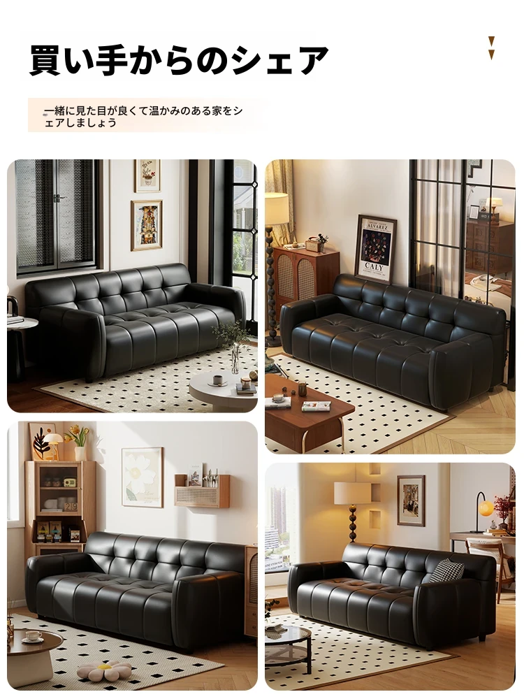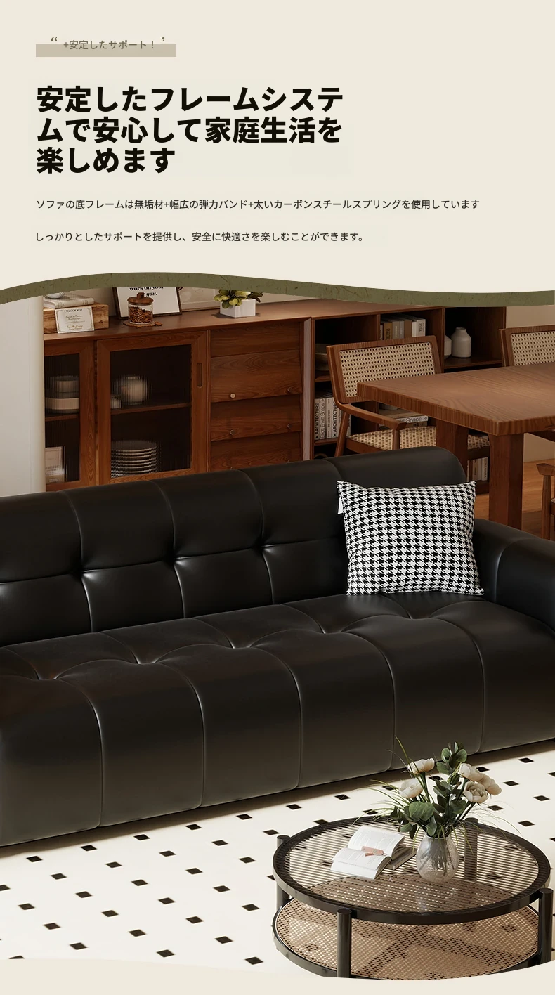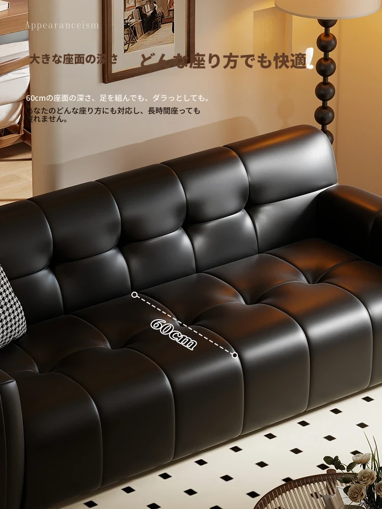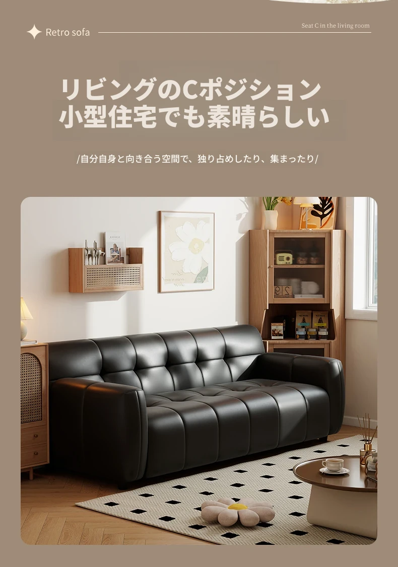 レトロ風のイタリアンレザーソファ - コンパクトなリビングやアパートに最適なミニマルデザインのダブル&トリプルシート、シックなブラック。おしゃれで機能的な空間を演出します!