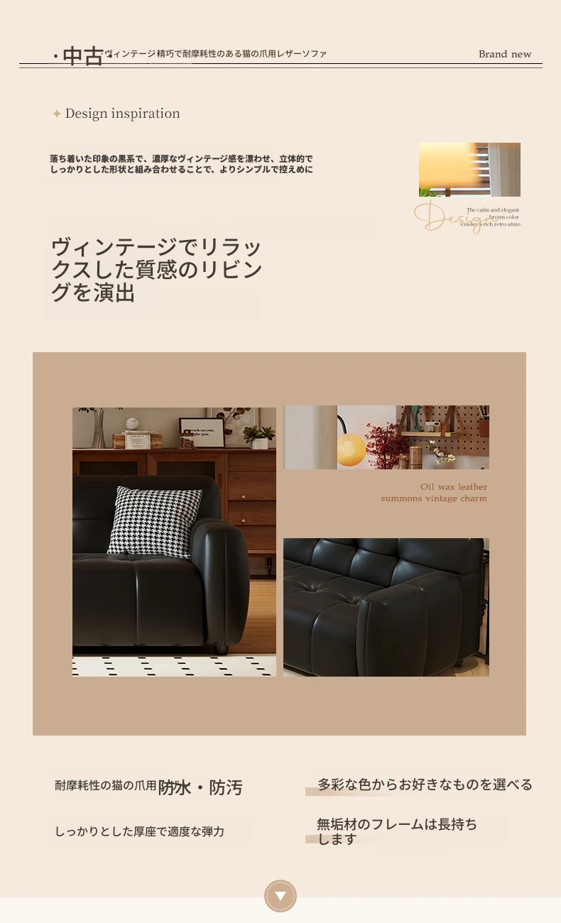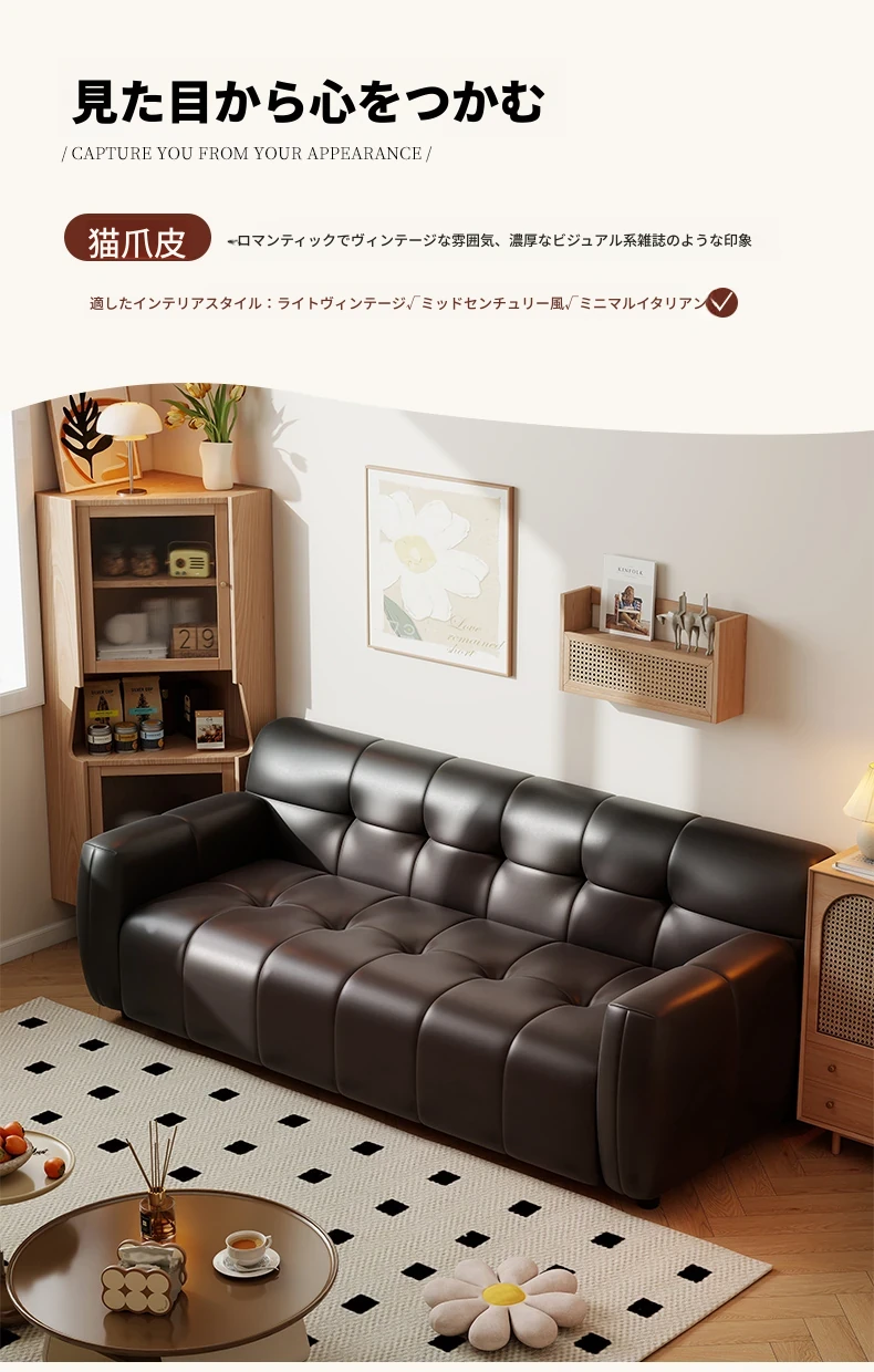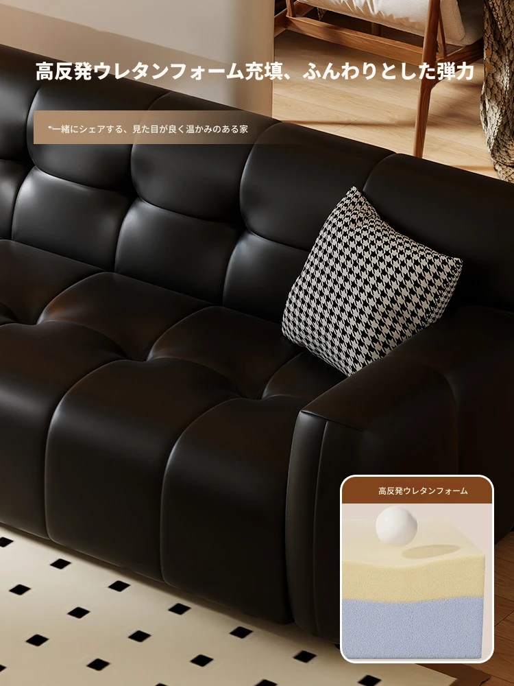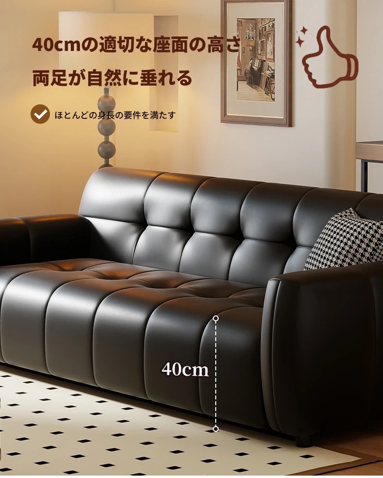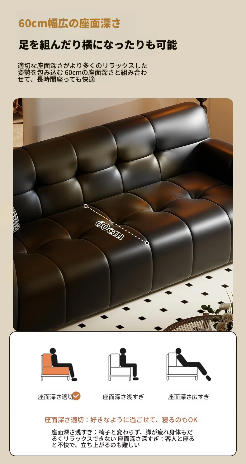 レトロ風のイタリアンレザーソファ - コンパクトなリビングやアパートに最適なミニマルデザインのダブル&トリプルシート、シックなブラック。おしゃれで機能的な空間を演出します!