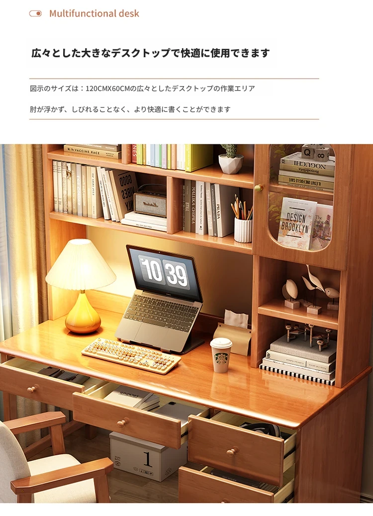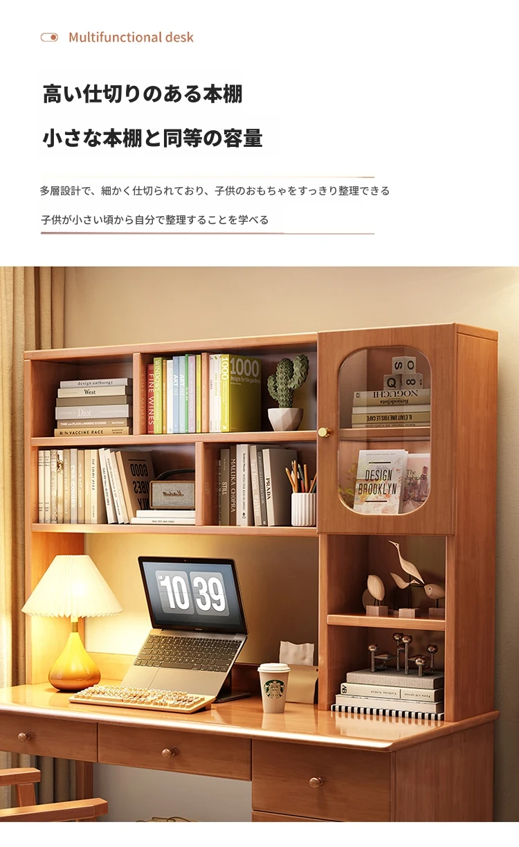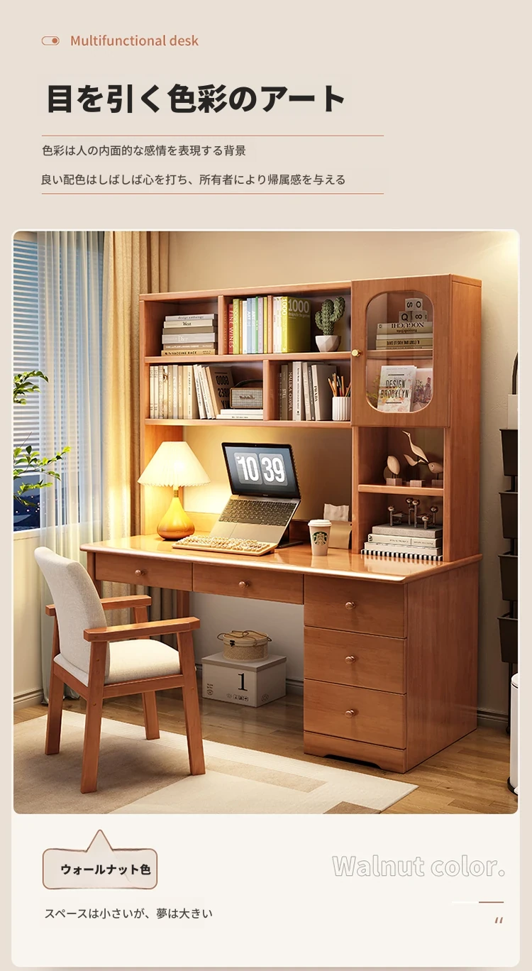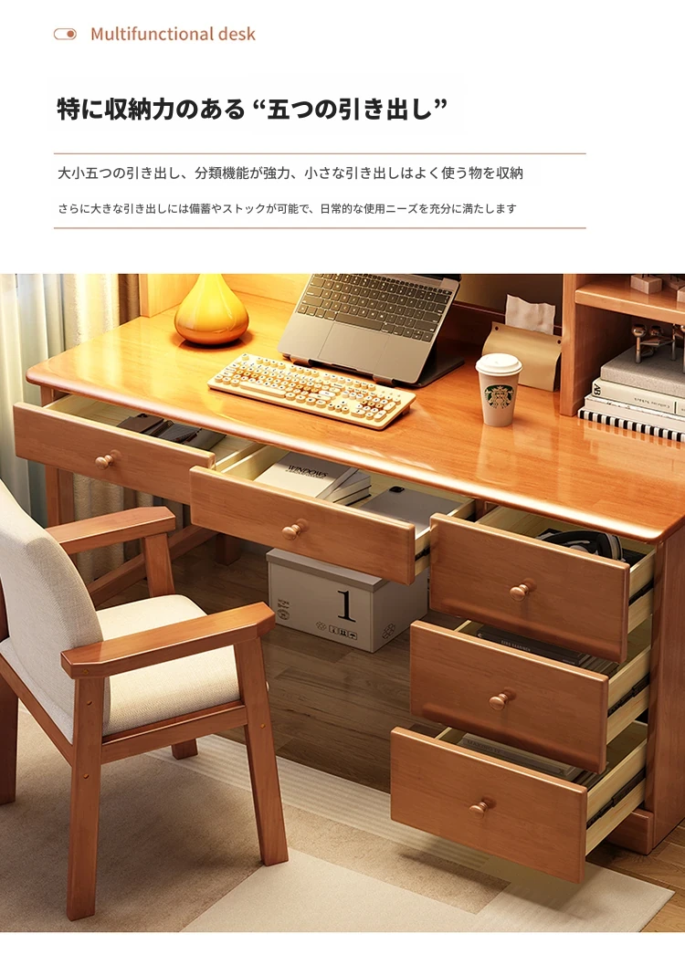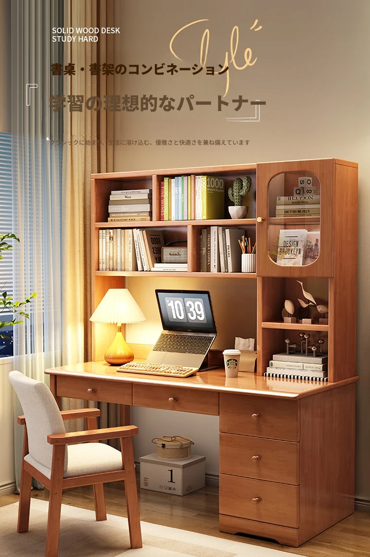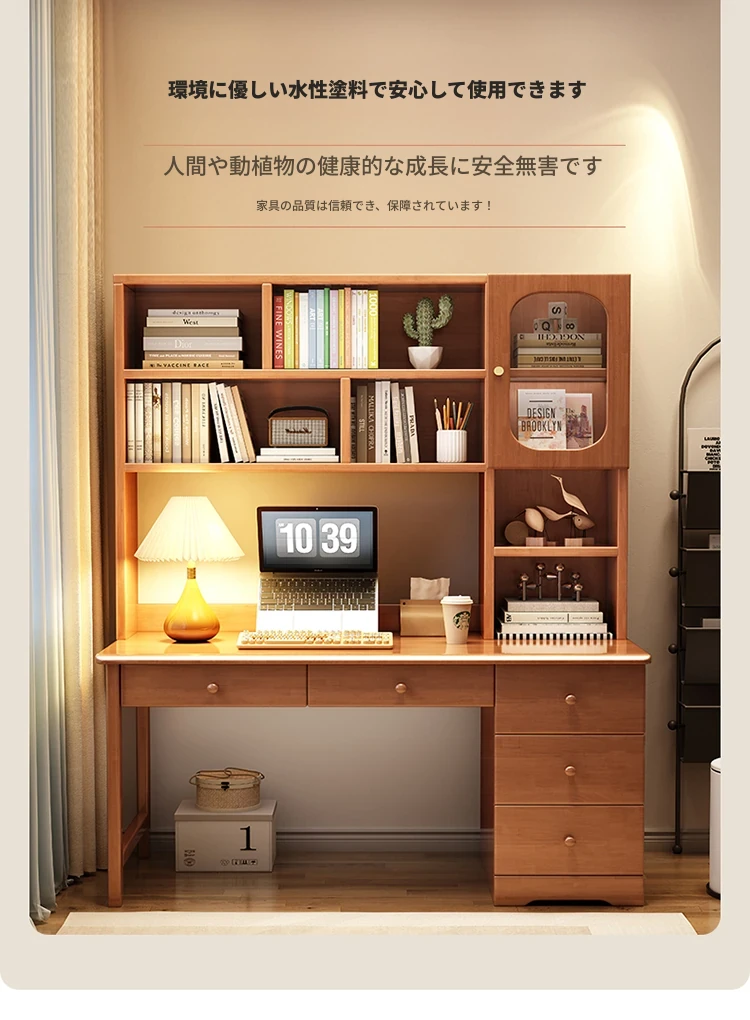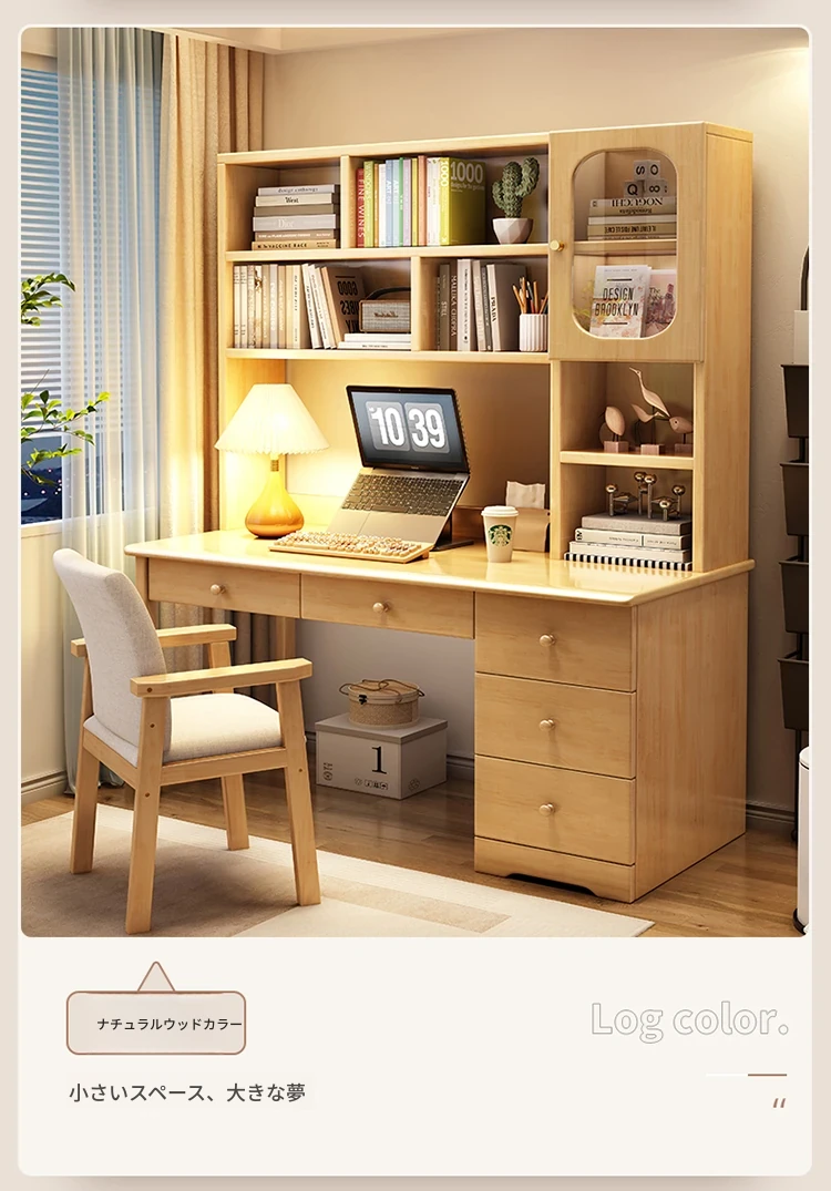 ナチュラル木製コンピューターデスク 家庭用 寝室デスク 一体型本棚付き 書斎デスク 小型空間対応 子供用学習デスク - スペースを最大限に活用し、美しい木目で部屋を華やかに!
