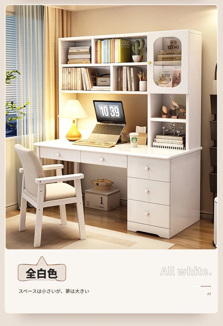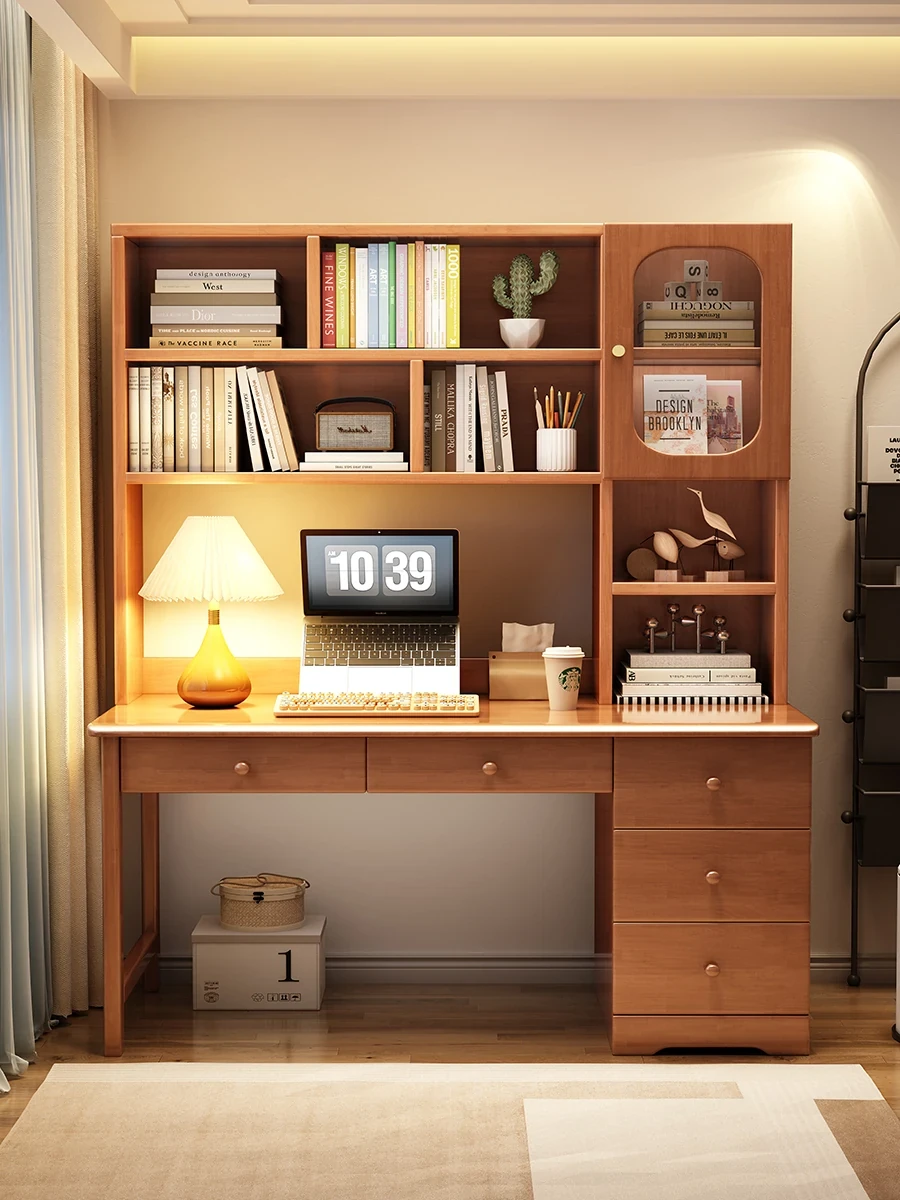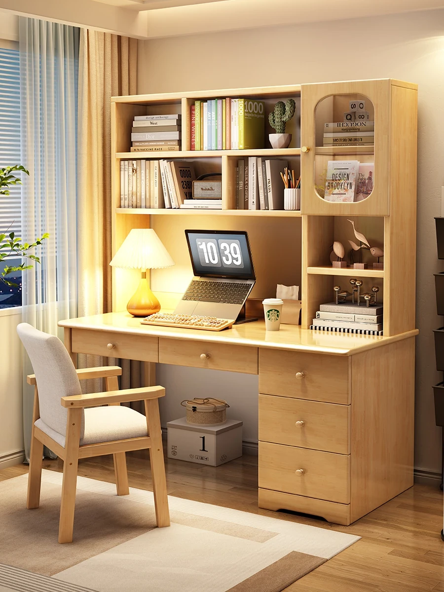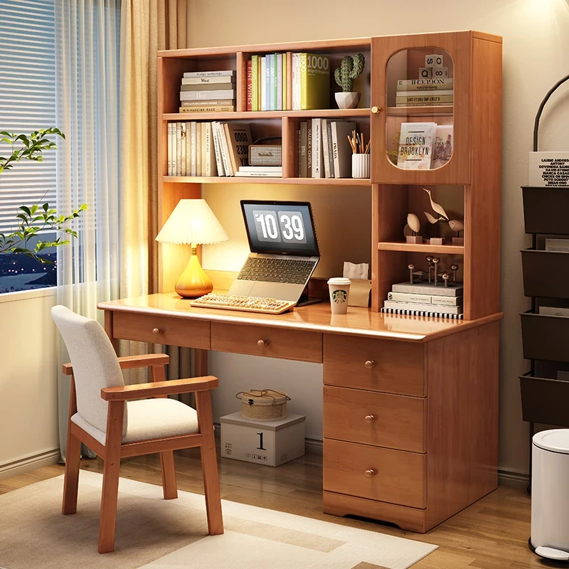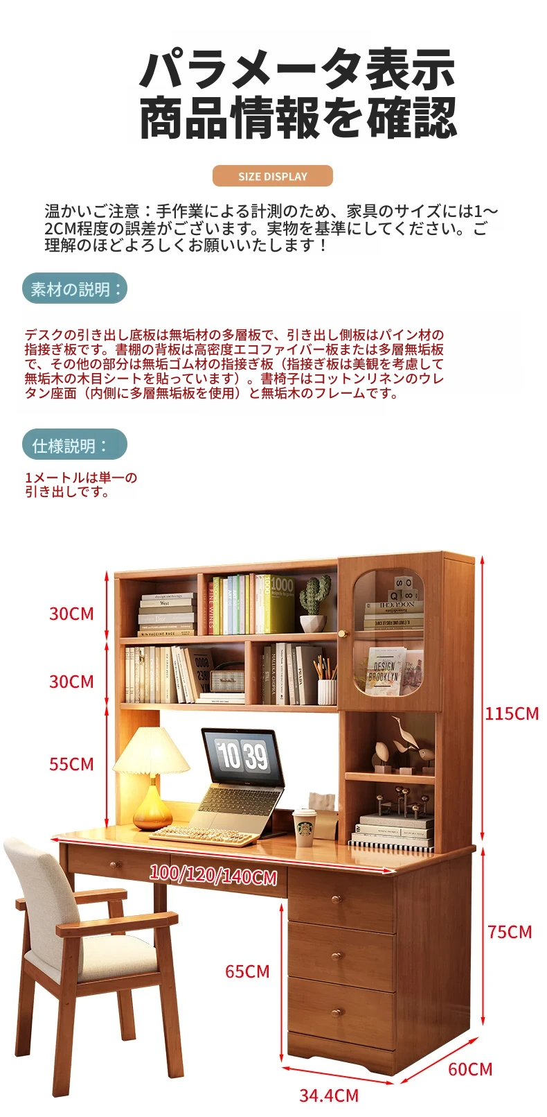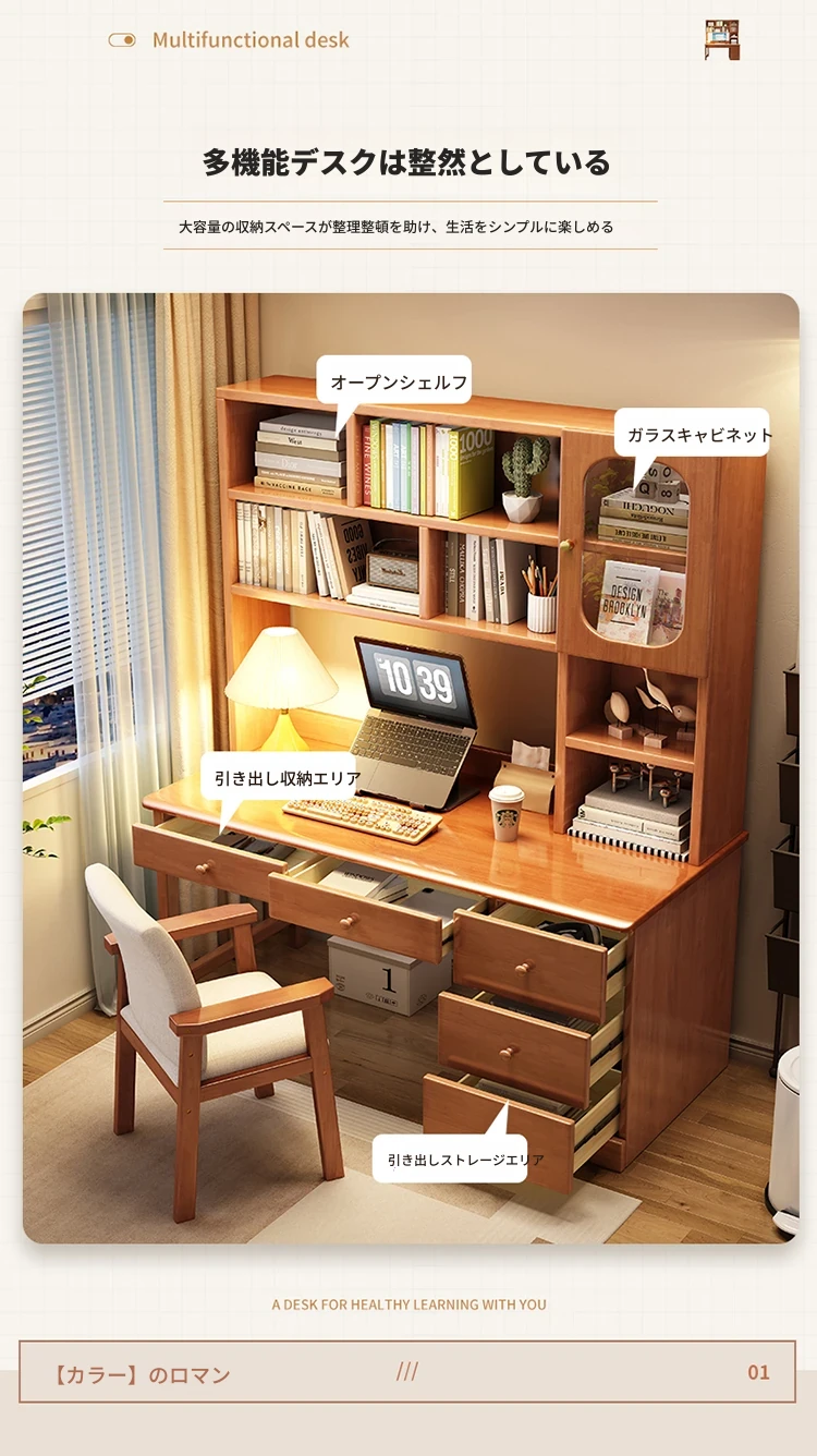 ナチュラル木製コンピューターデスク 家庭用 寝室デスク 一体型本棚付き 書斎デスク 小型空間対応 子供用学習デスク - スペースを最大限に活用し、美しい木目で部屋を華やかに!