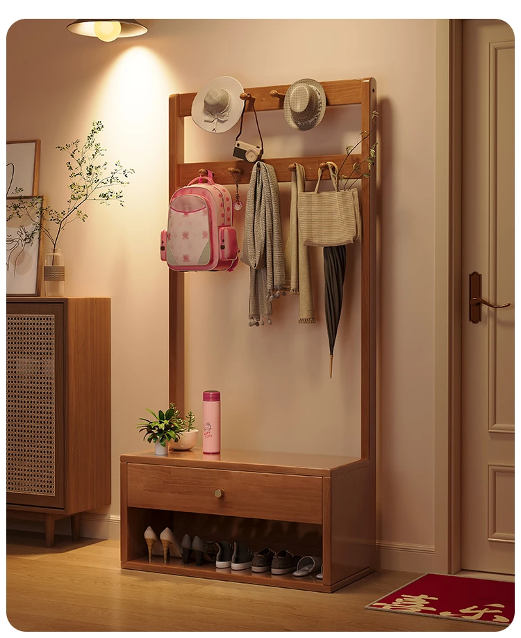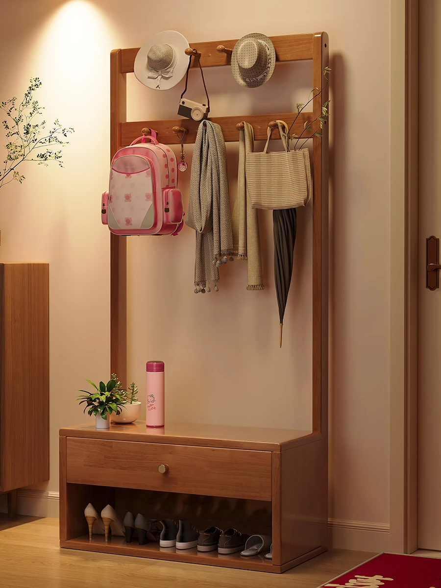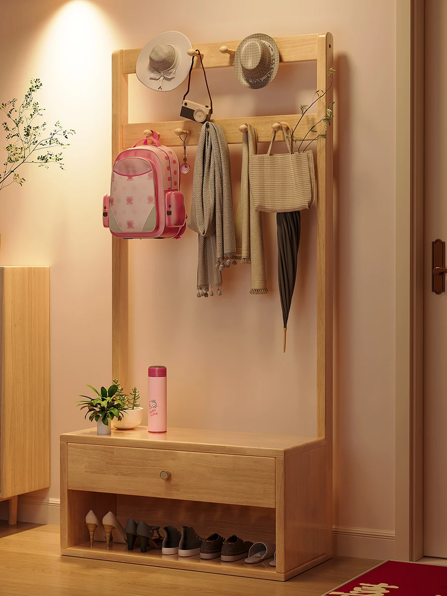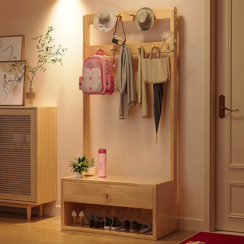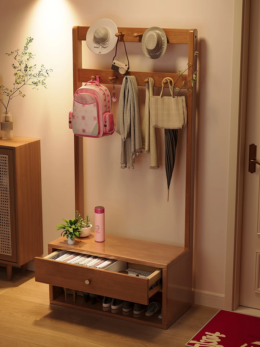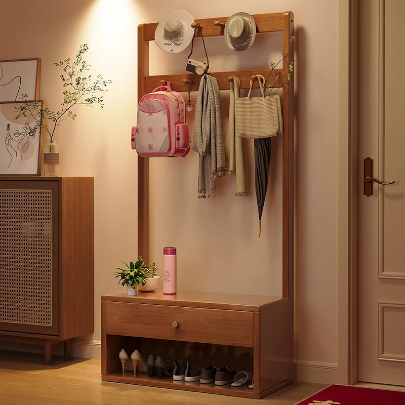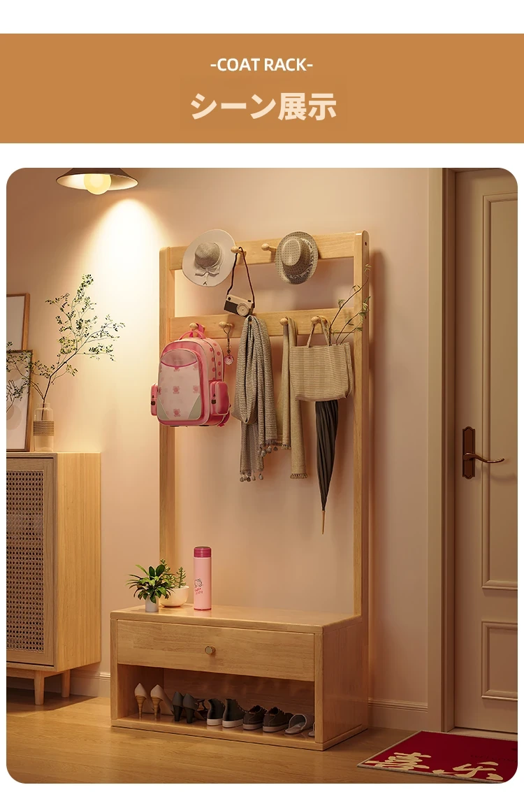 省スペース!玄関にぴったりのシンプルな家用実木コートハンガー&シューズベンチ一体型-落ち着いた寝室にも映えるフロアスタンドタイプ
