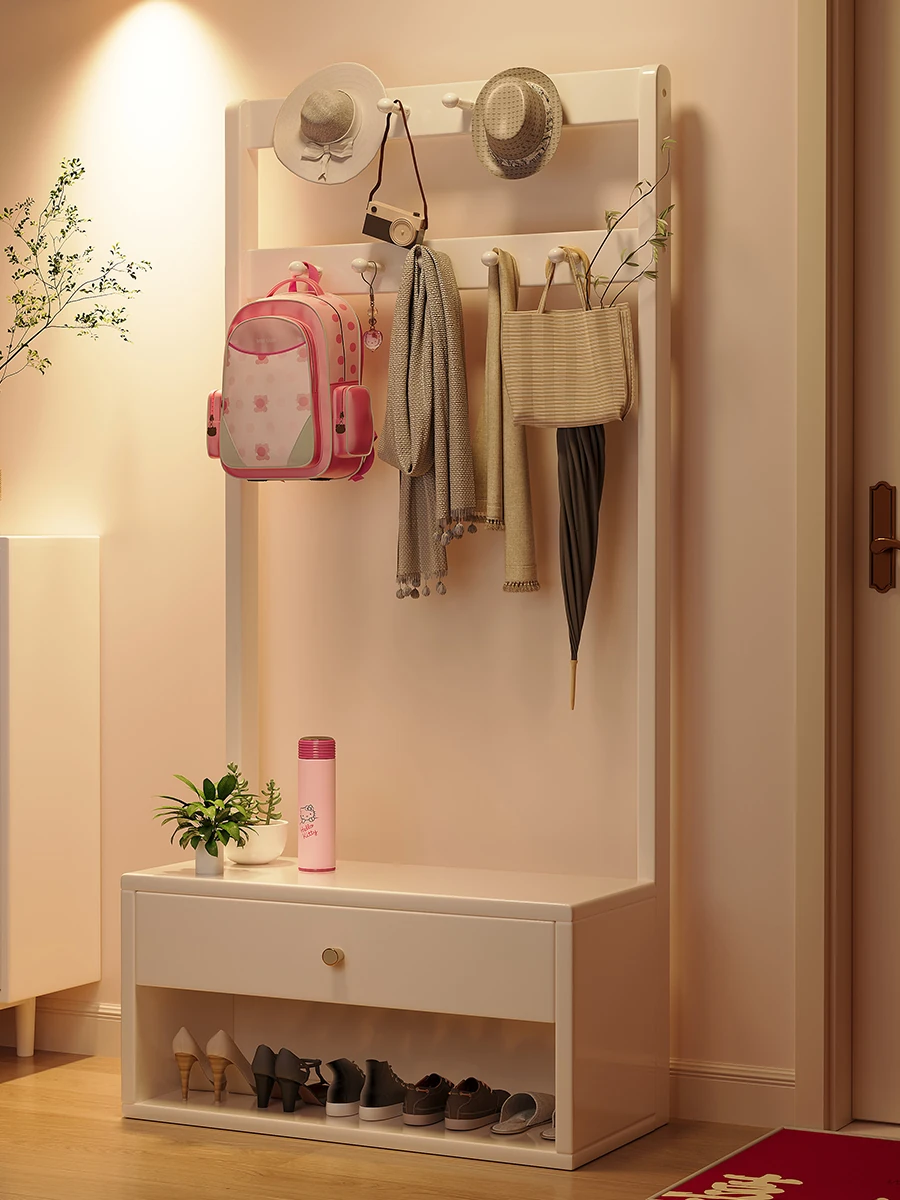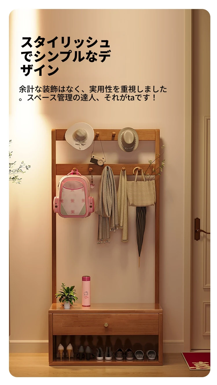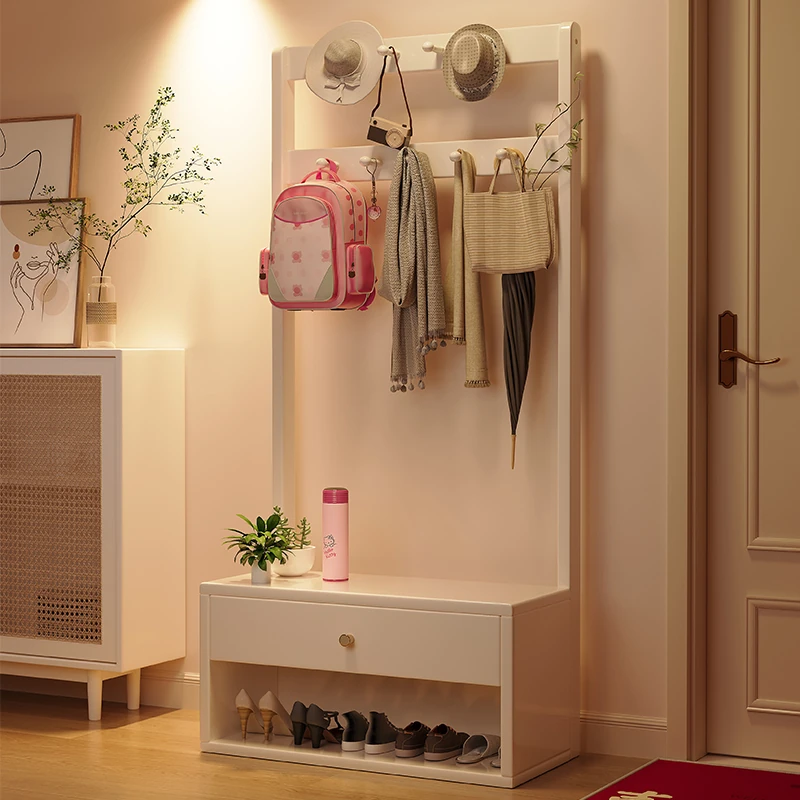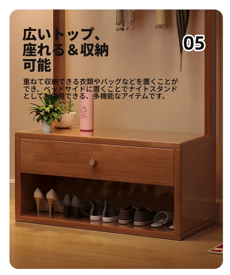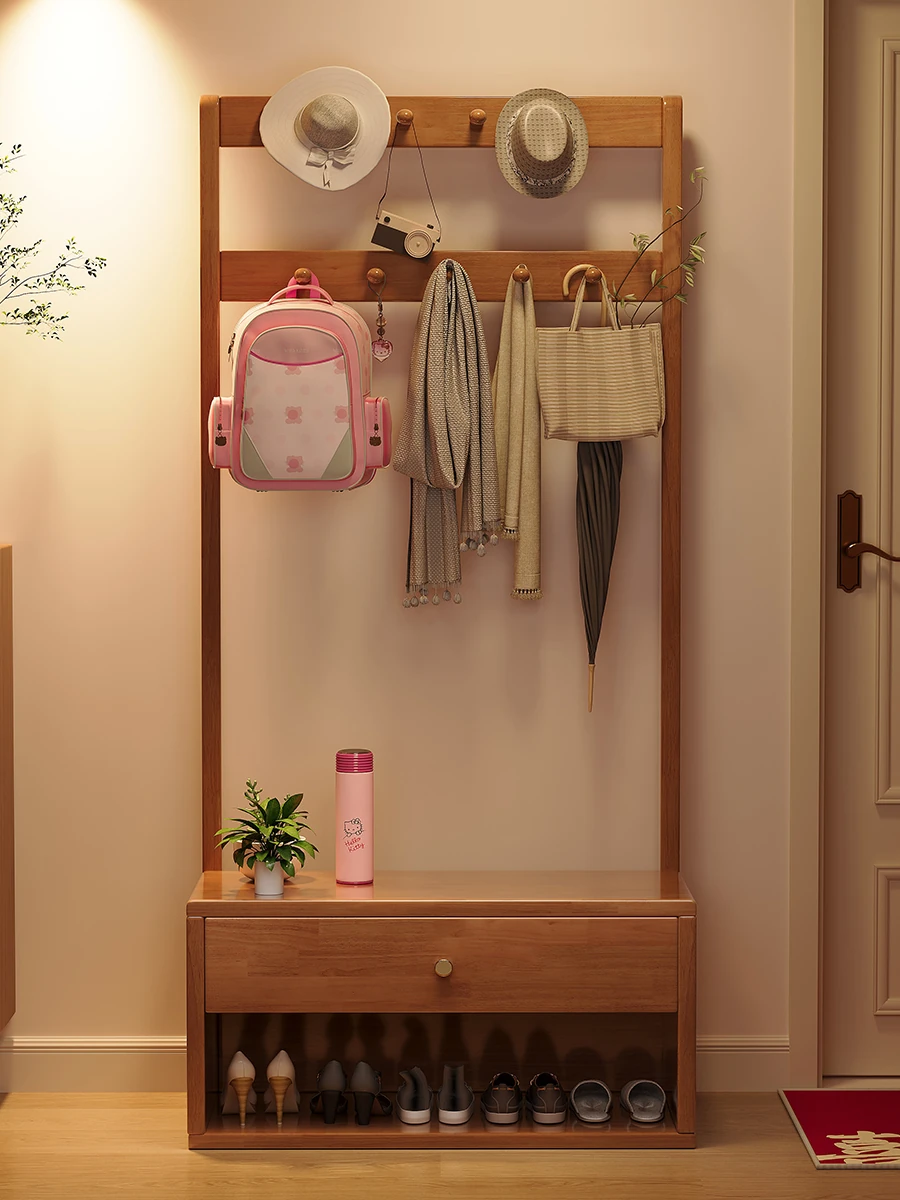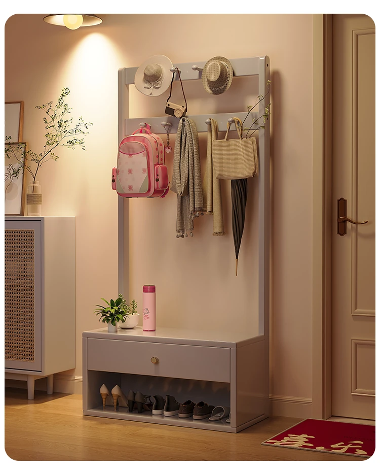 省スペース!玄関にぴったりのシンプルな家用実木コートハンガー&シューズベンチ一体型-落ち着いた寝室にも映えるフロアスタンドタイプ