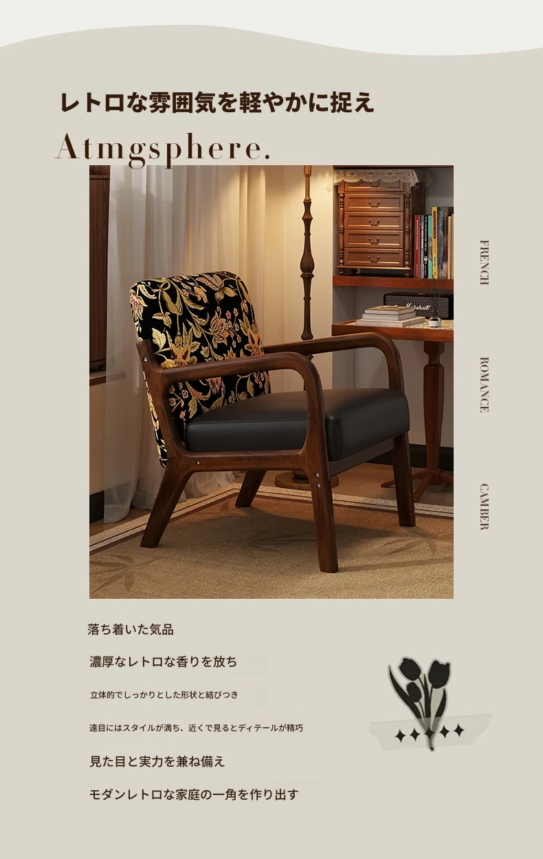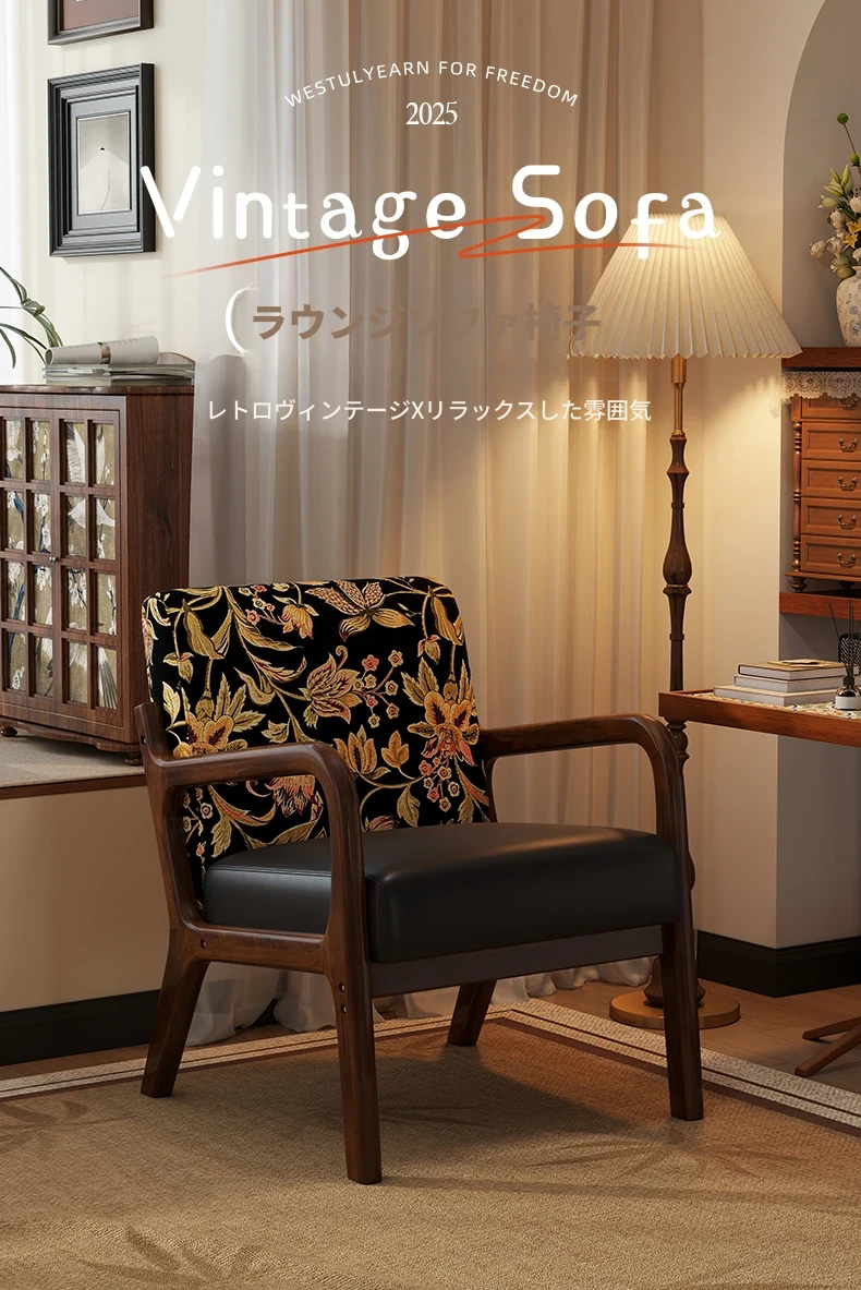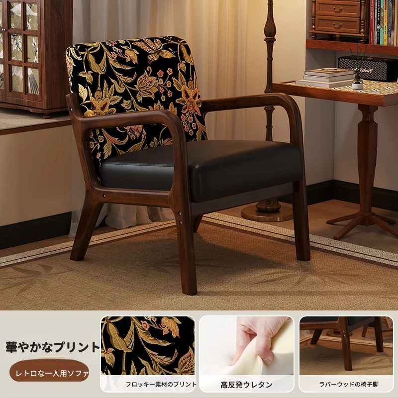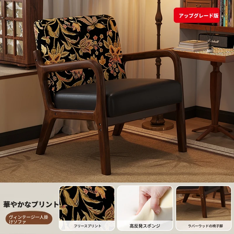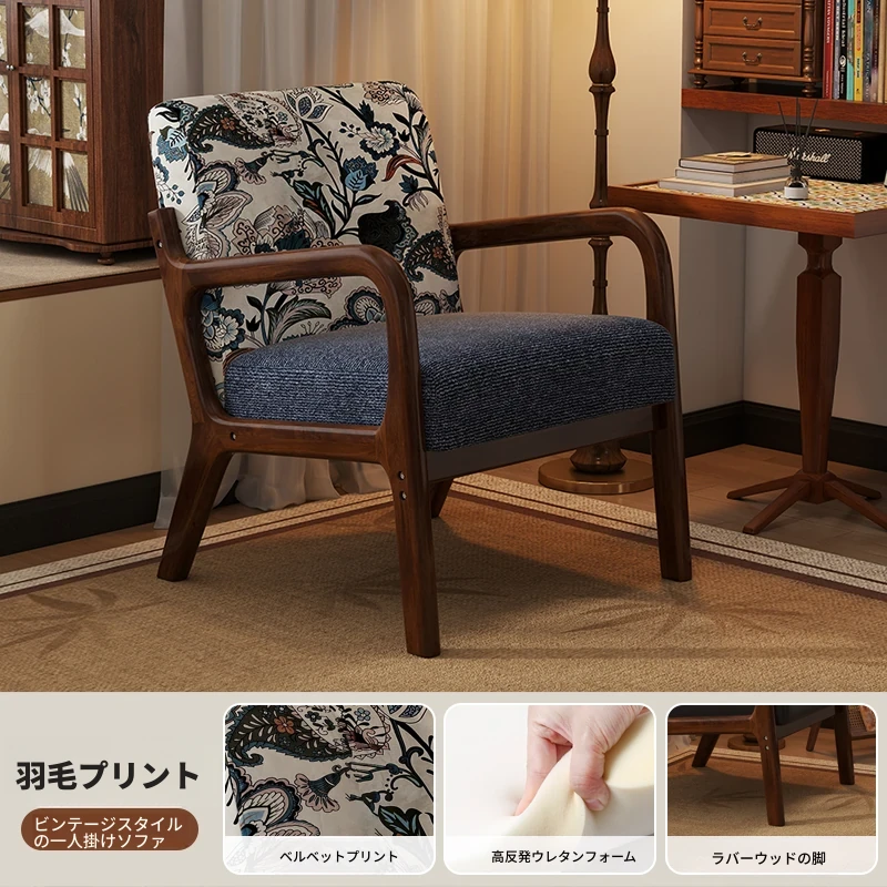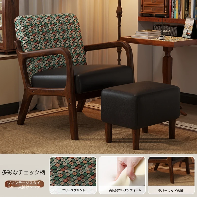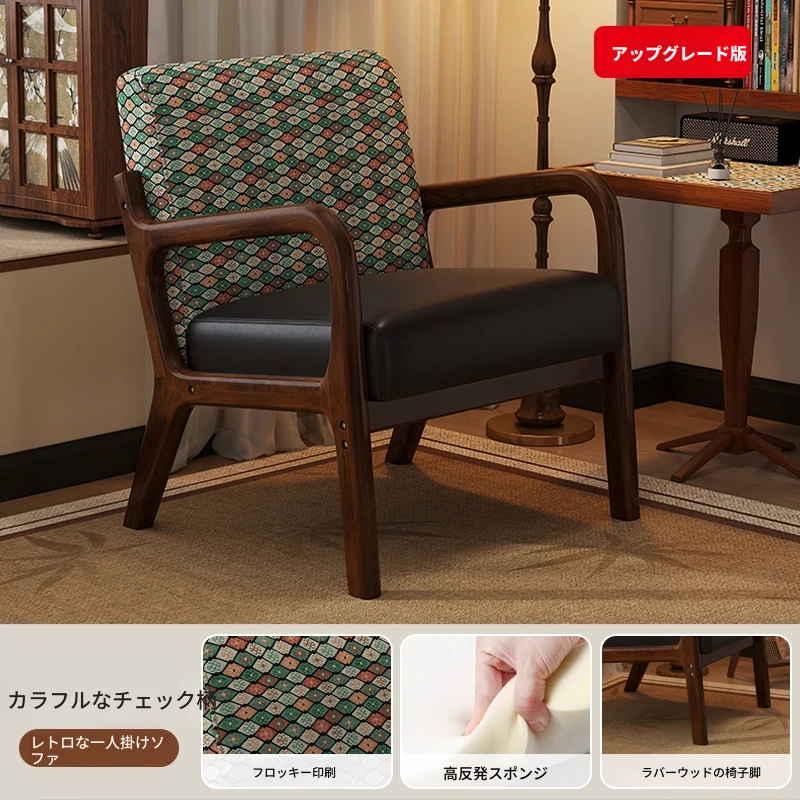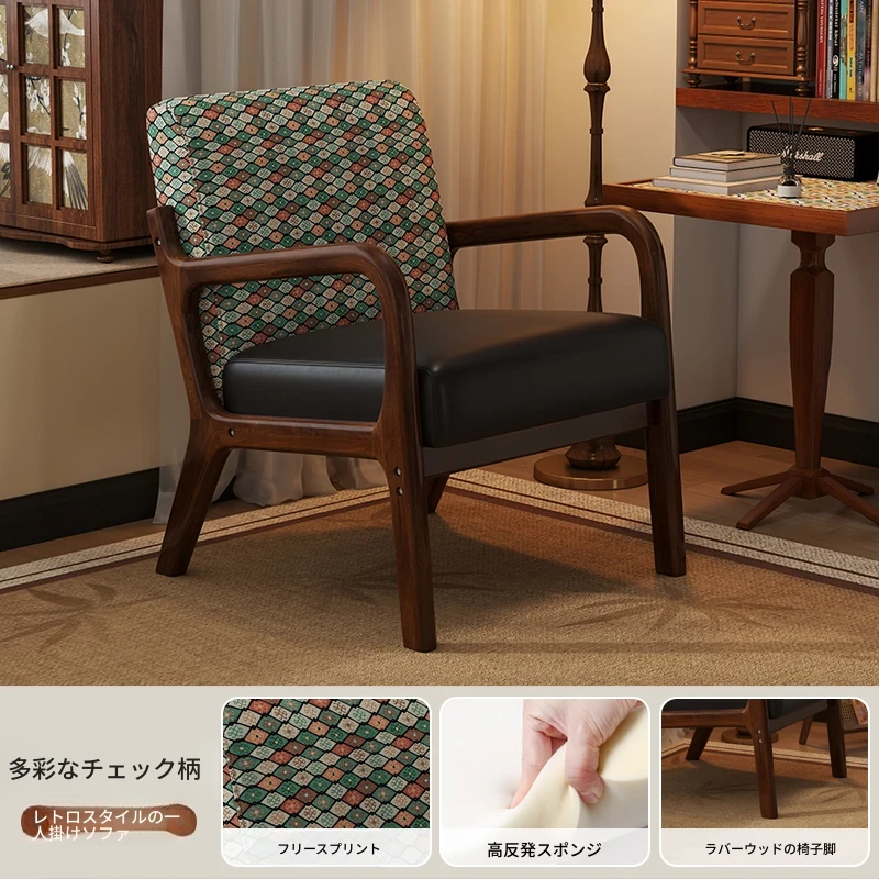 レトロな一人掛けソファ - 天然木製のヴィンテージスタイル、リラックスできる背もたれ付きで書斎やリビングに最適!おしゃれなデザインで、心地よいひとときを演出します。