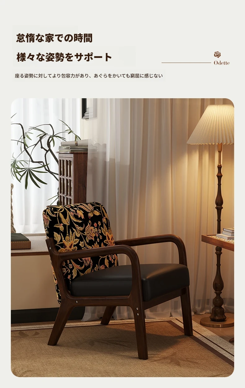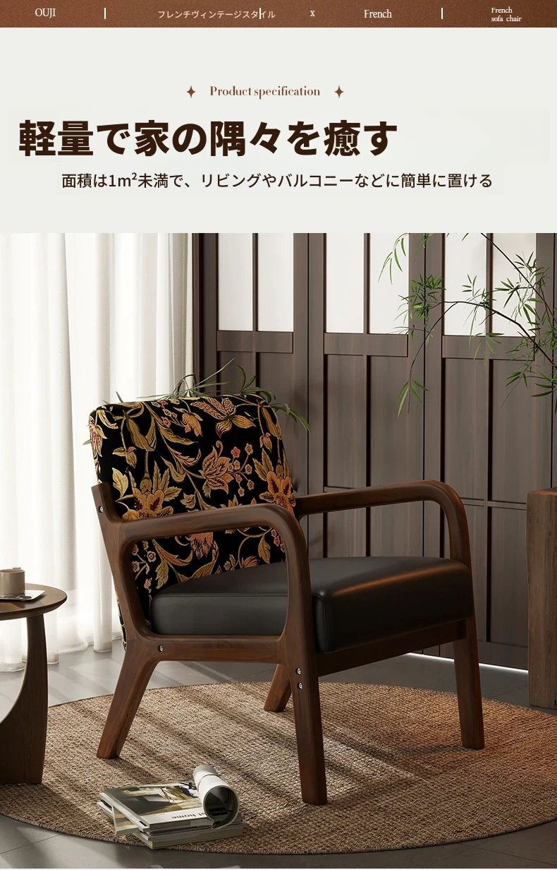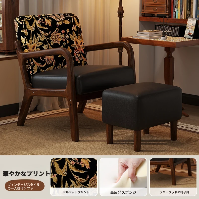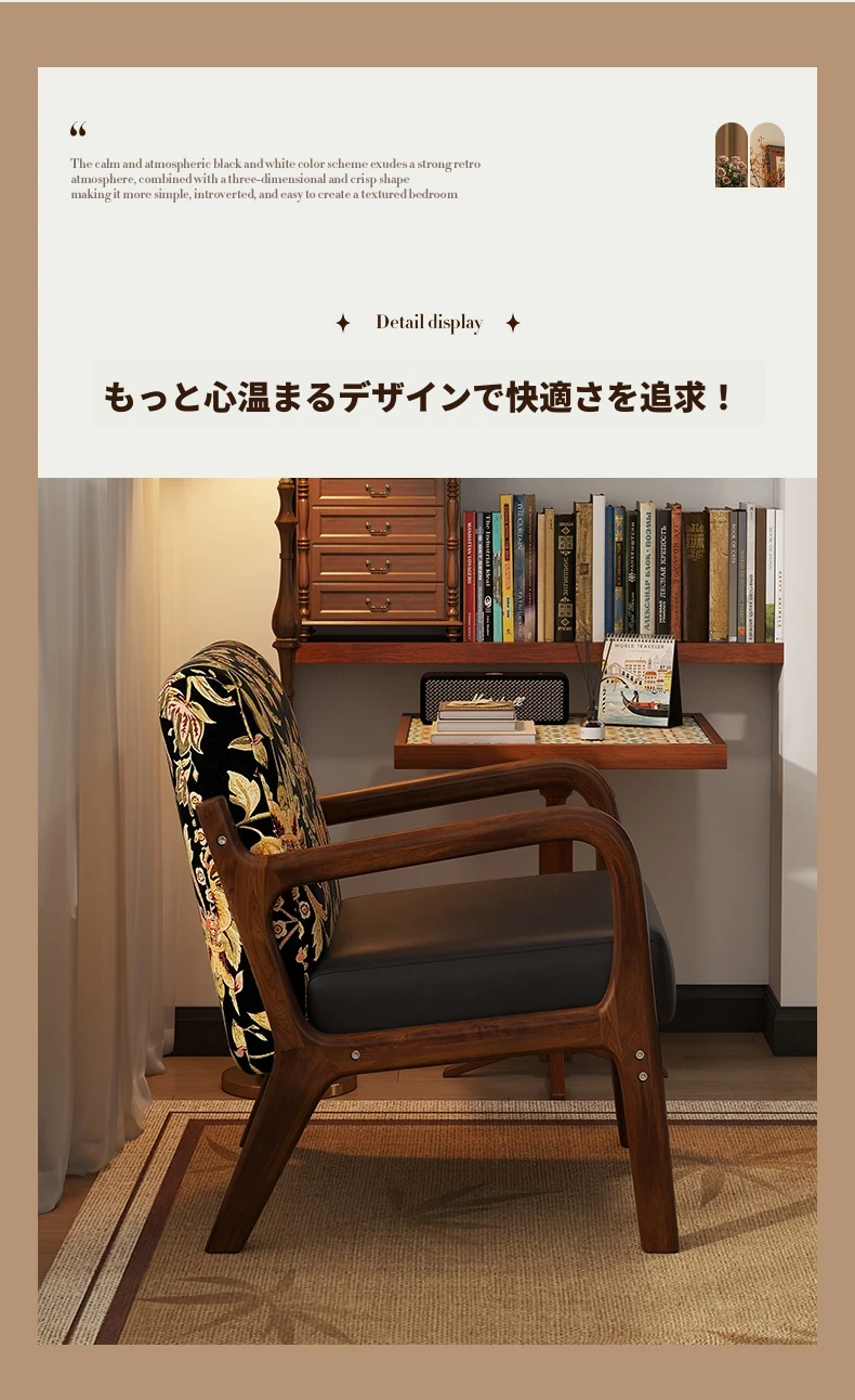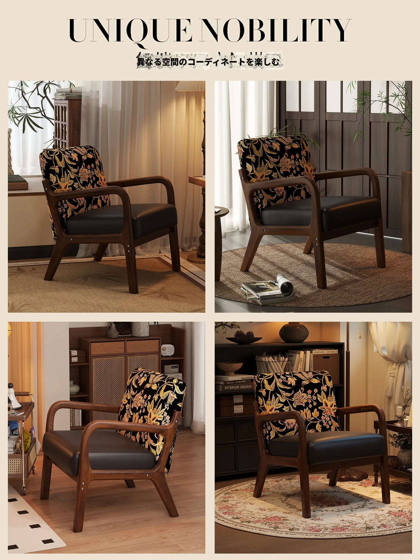 レトロな一人掛けソファ - 天然木製のヴィンテージスタイル、リラックスできる背もたれ付きで書斎やリビングに最適!おしゃれなデザインで、心地よいひとときを演出します。