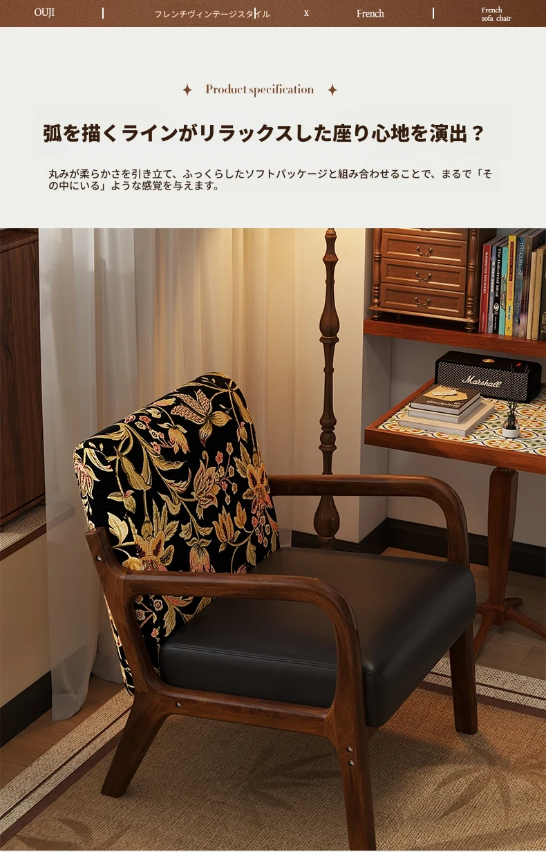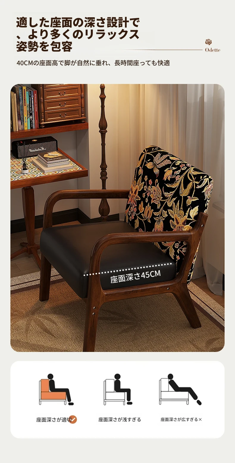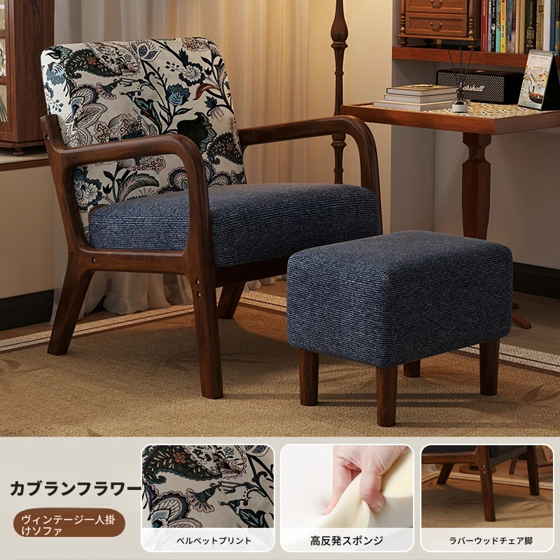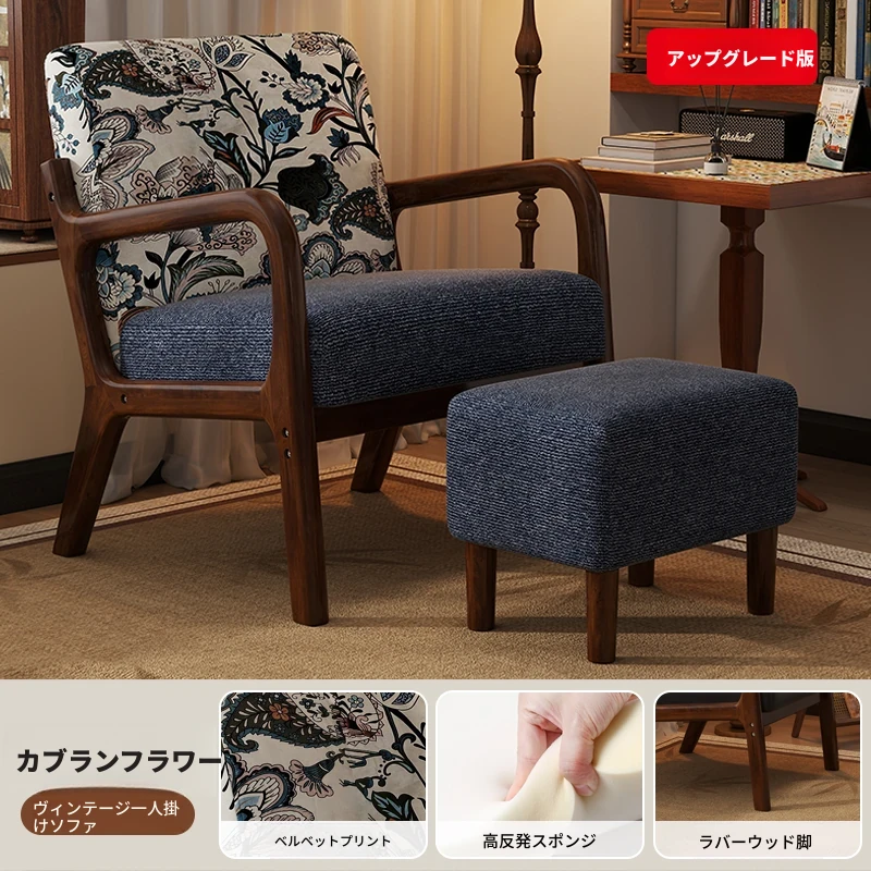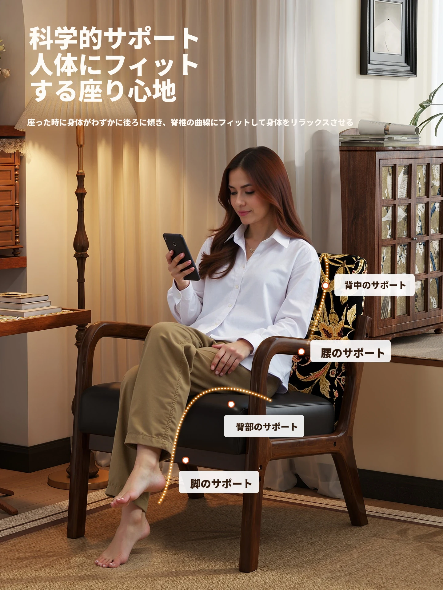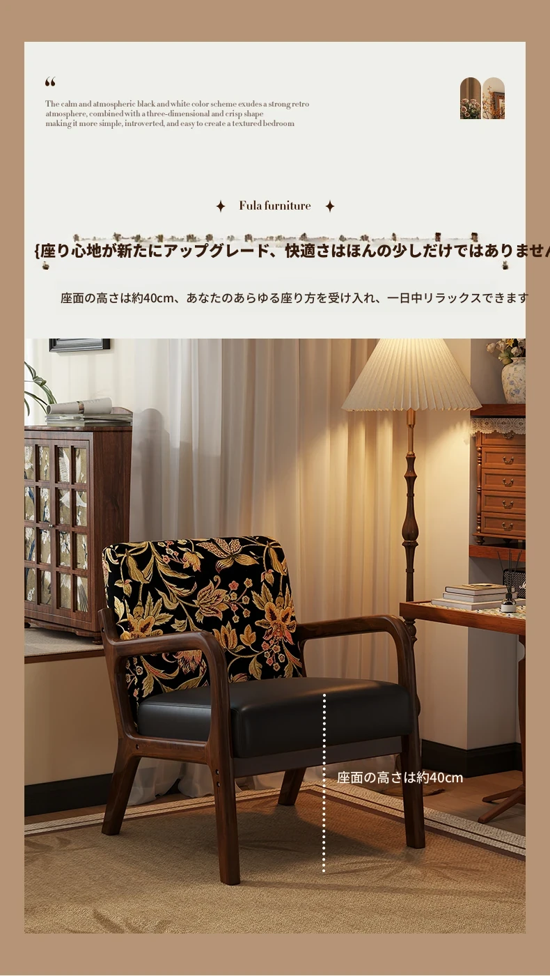レトロな一人掛けソファ - 天然木製のヴィンテージスタイル、リラックスできる背もたれ付きで書斎やリビングに最適!おしゃれなデザインで、心地よいひとときを演出します。