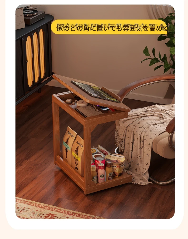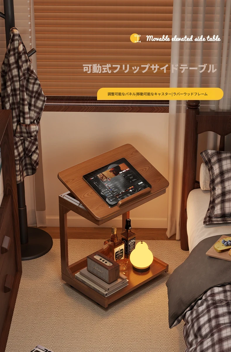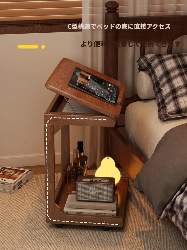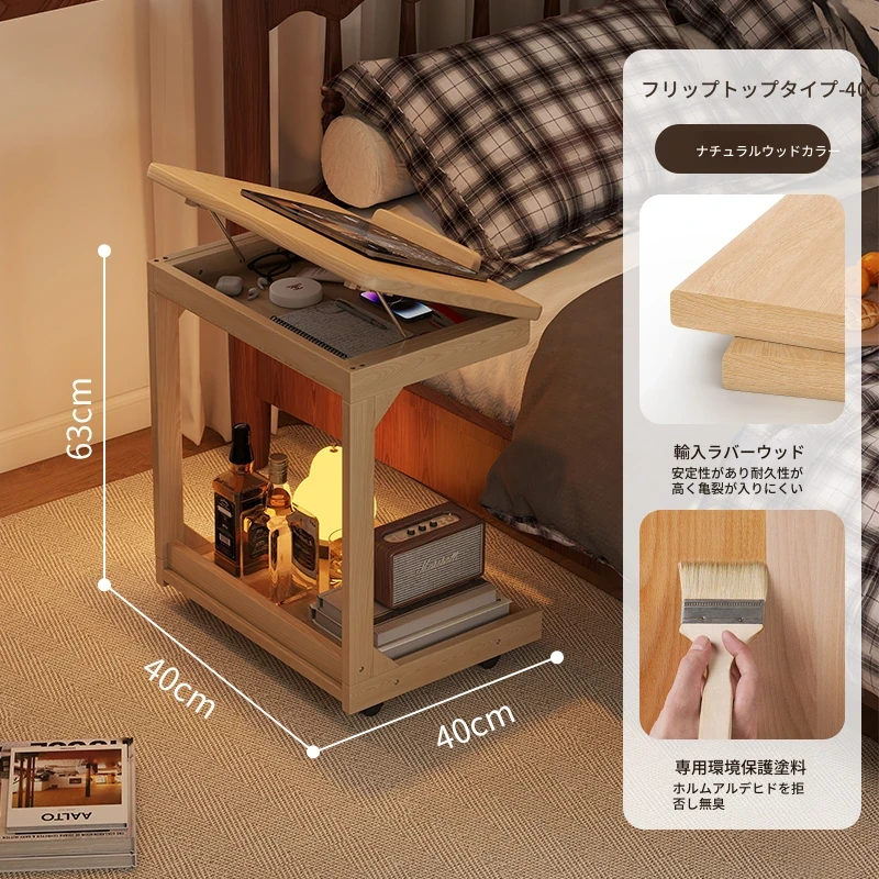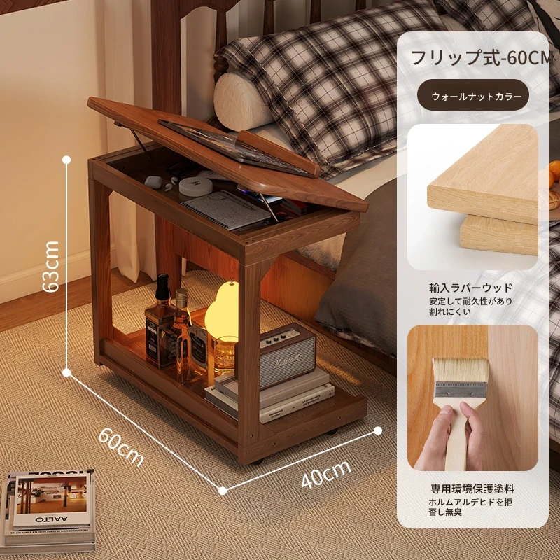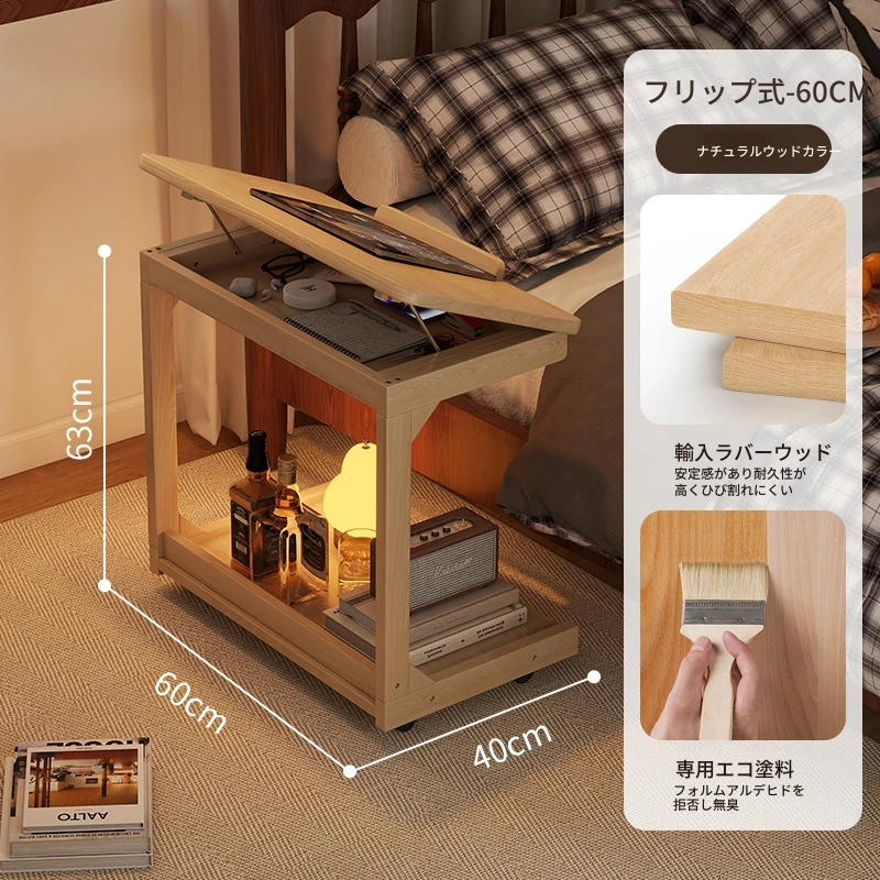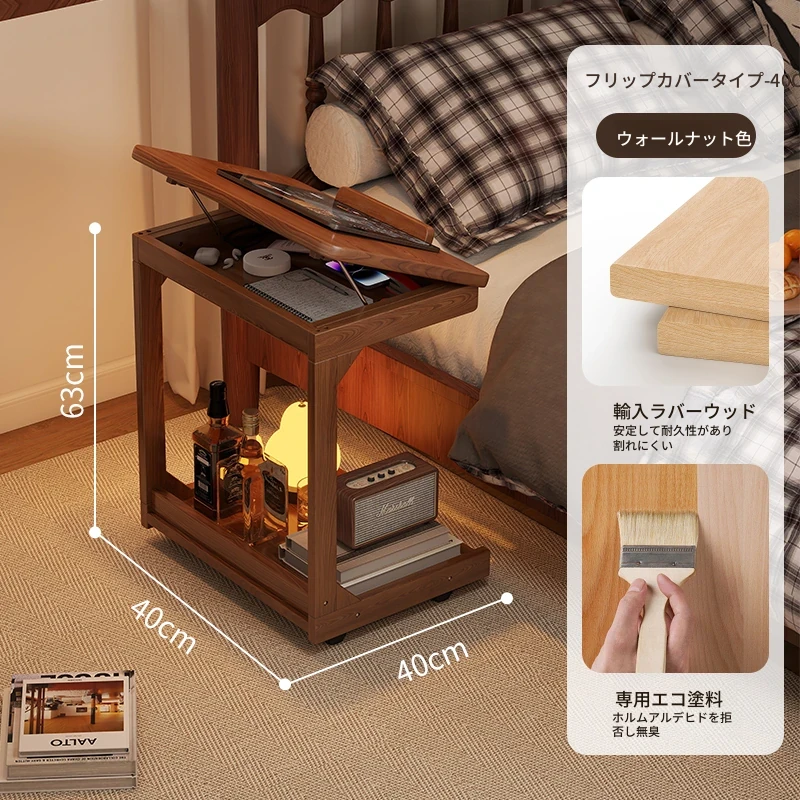 レトロデザインの実木製ベッドサイドテーブル、キャスター付きで移動も楽々!収納力抜群のフリップトップ式、あなたの寝室をおしゃれに演出します。