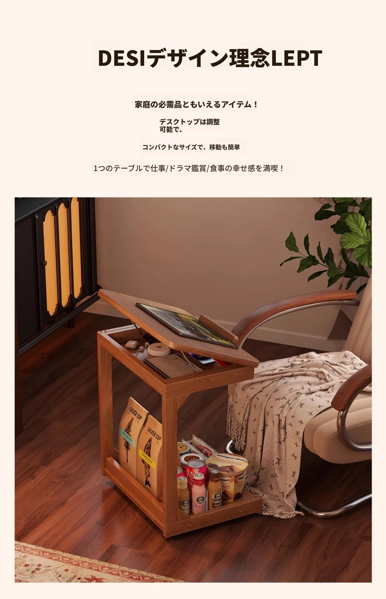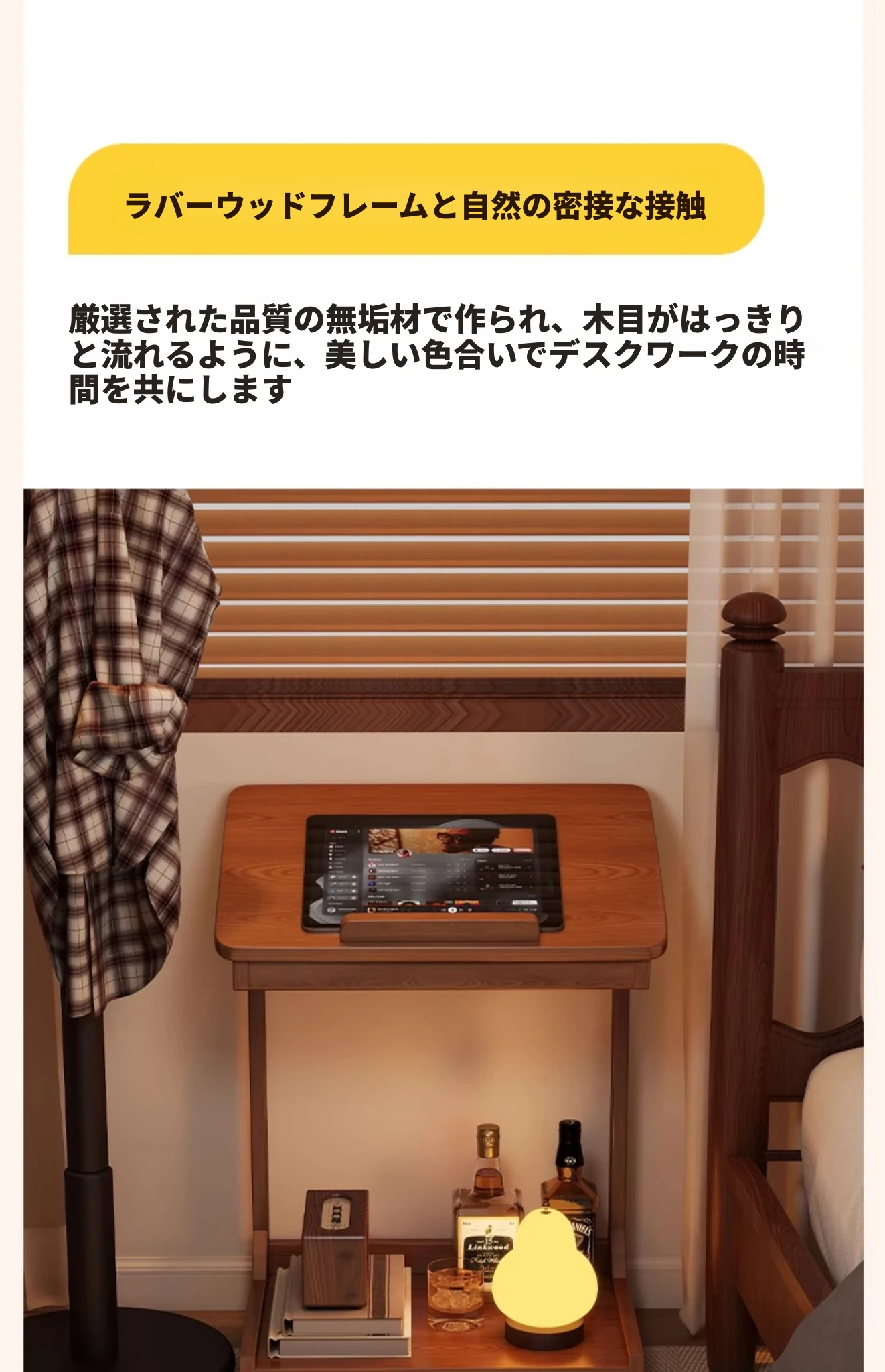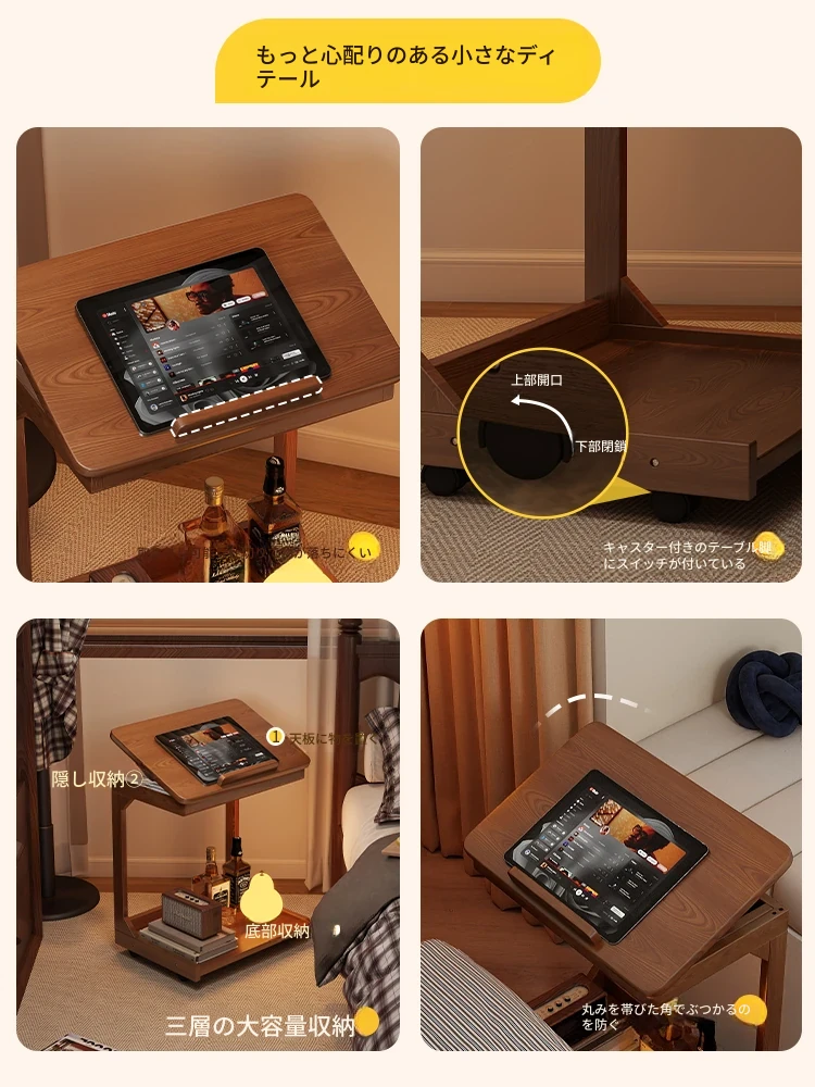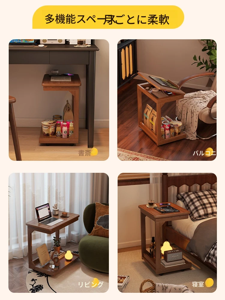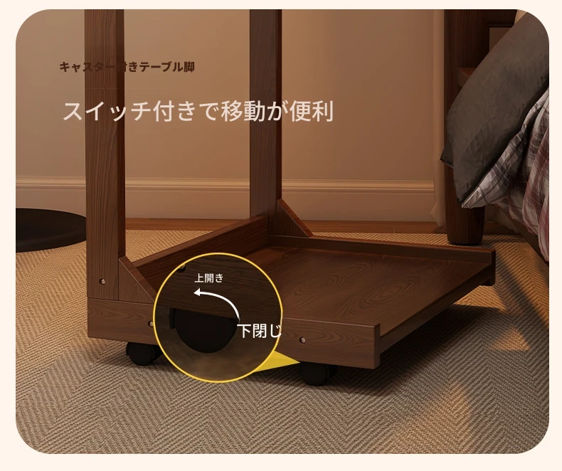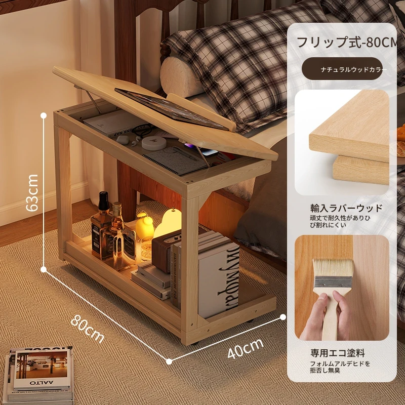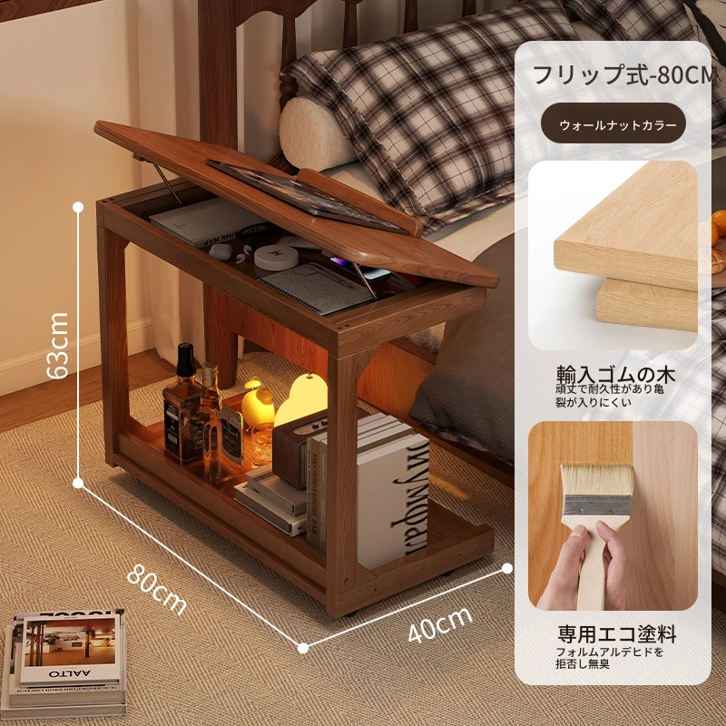 レトロデザインの実木製ベッドサイドテーブル、キャスター付きで移動も楽々!収納力抜群のフリップトップ式、あなたの寝室をおしゃれに演出します。