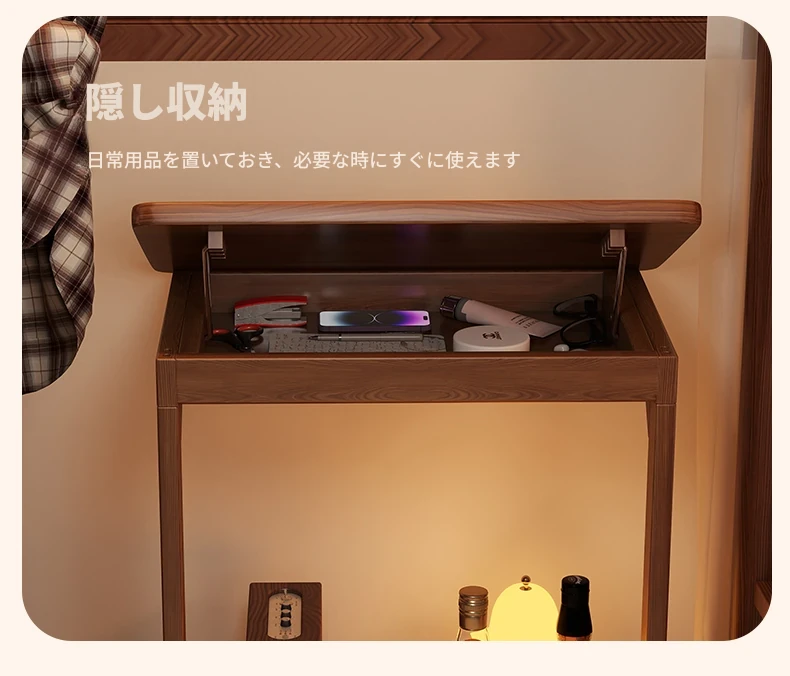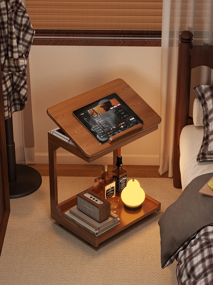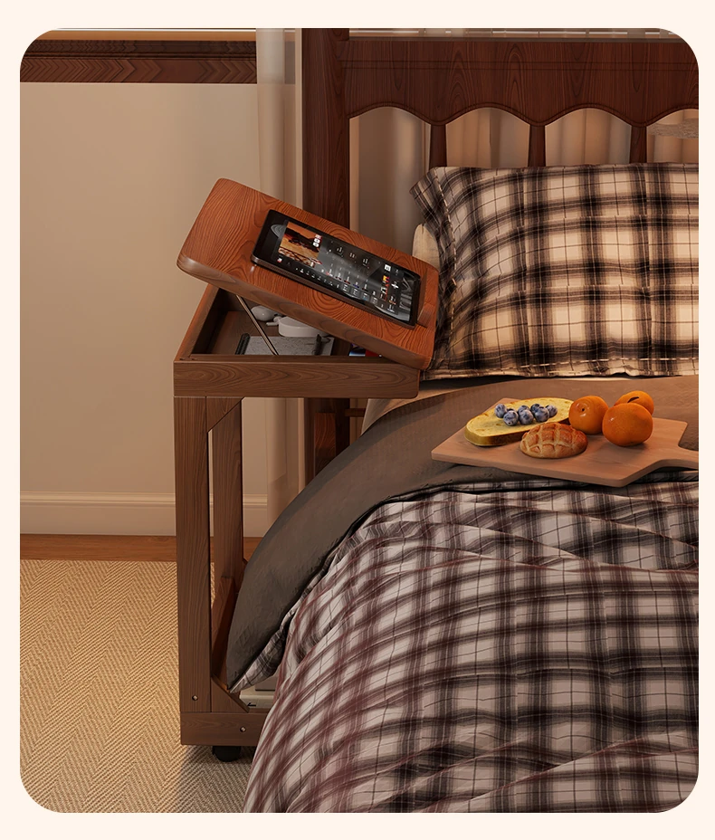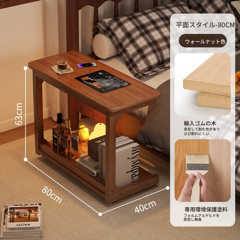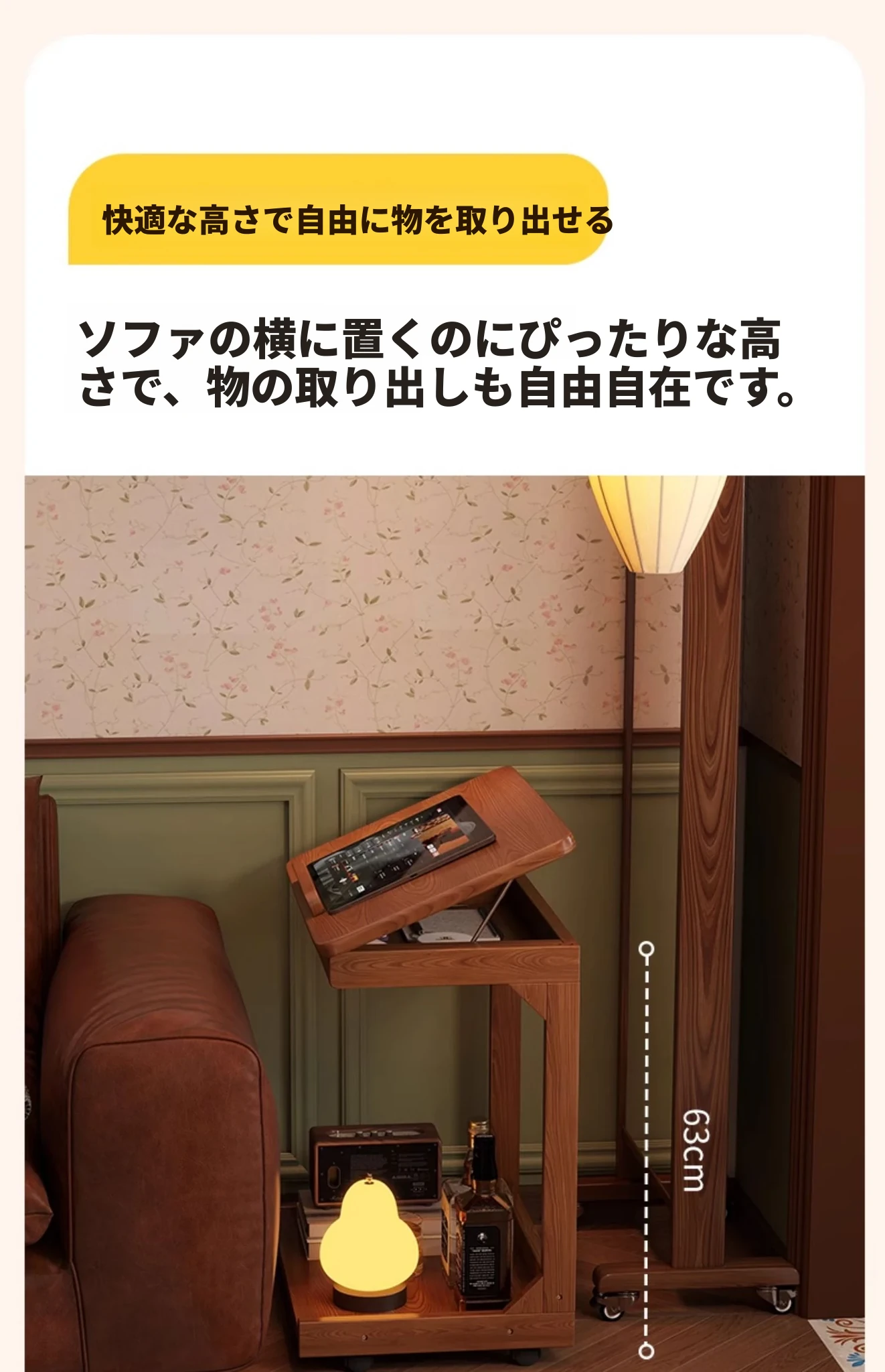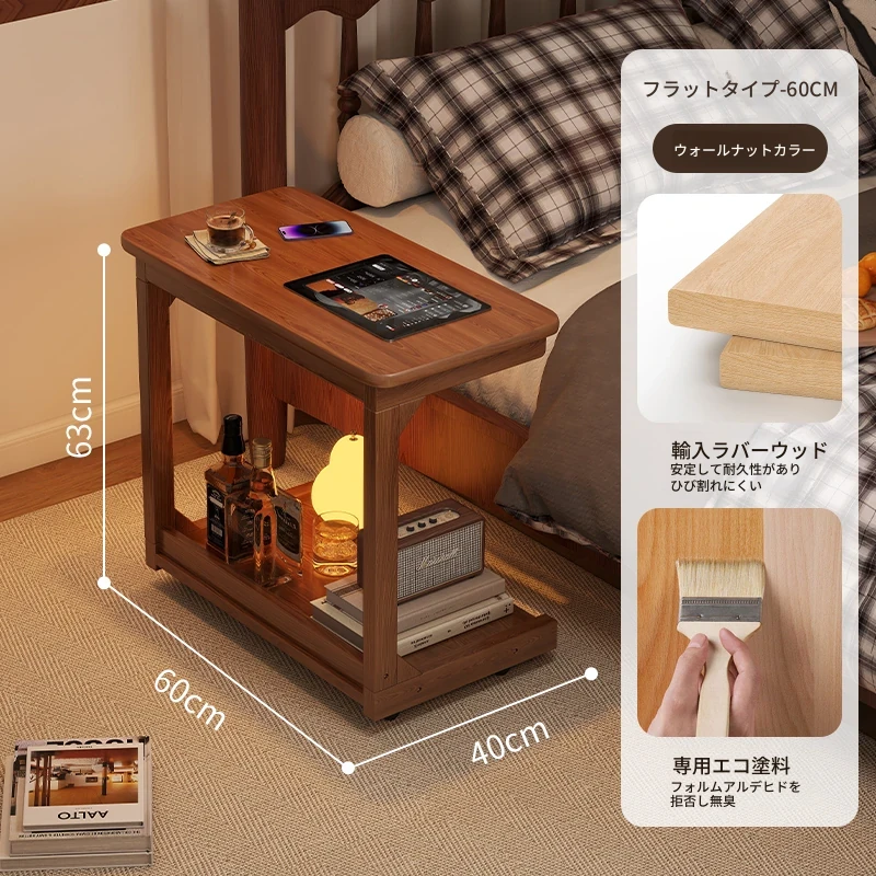 レトロデザインの実木製ベッドサイドテーブル、キャスター付きで移動も楽々!収納力抜群のフリップトップ式、あなたの寝室をおしゃれに演出します。